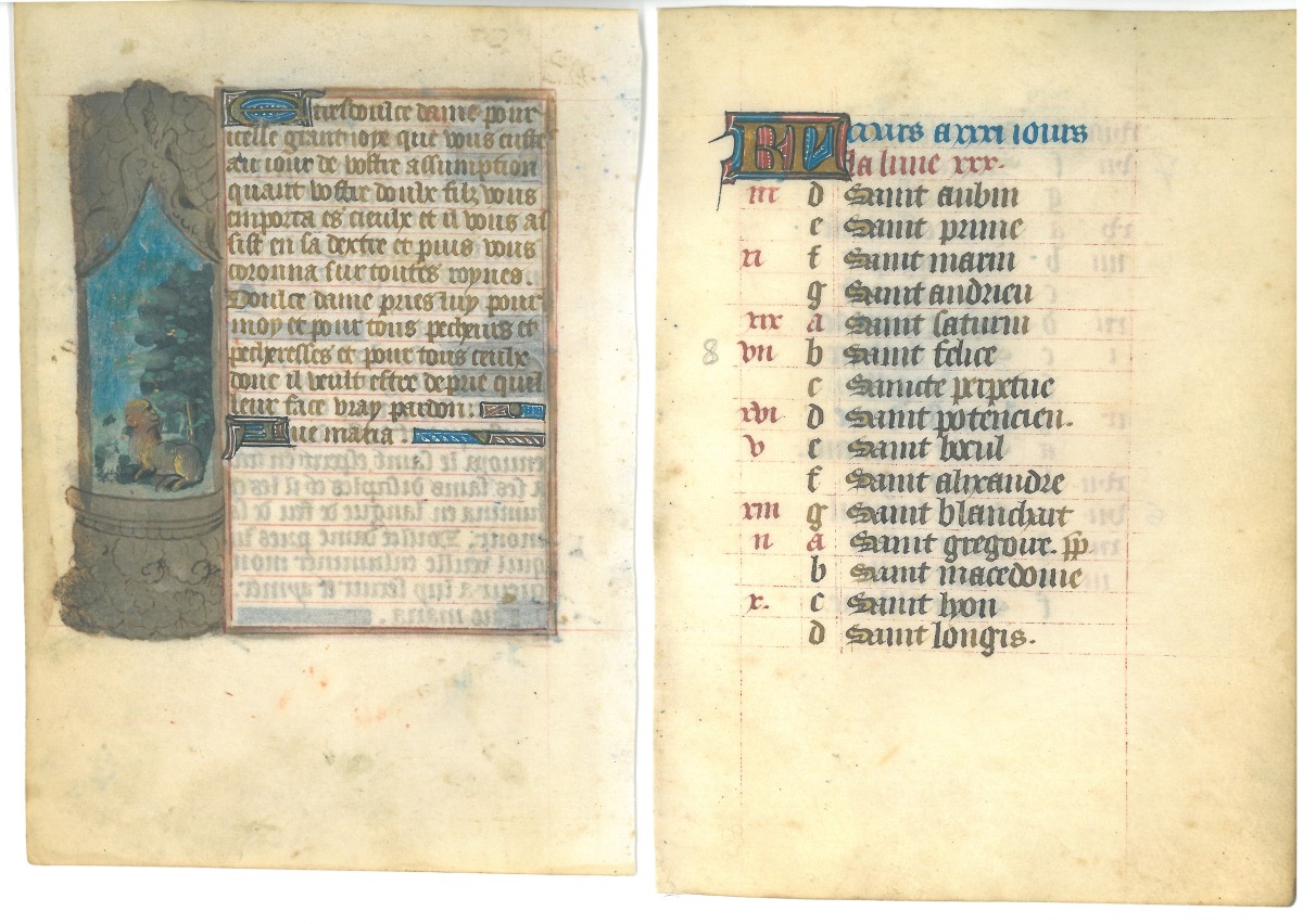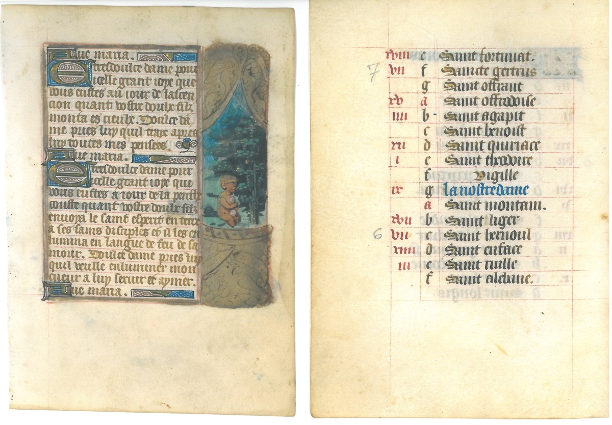 Prière en Français " les grandes joyes de la vierge " illustrée de peintures marginales, plus un feuillet de calendrier 15éme (mars).