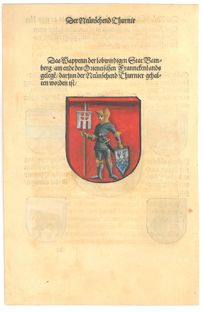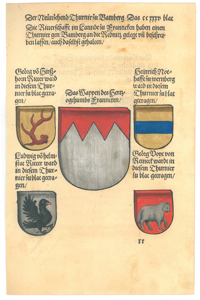 Feuillet imprimé en allemand, rehaussé de blasons en couleurs.