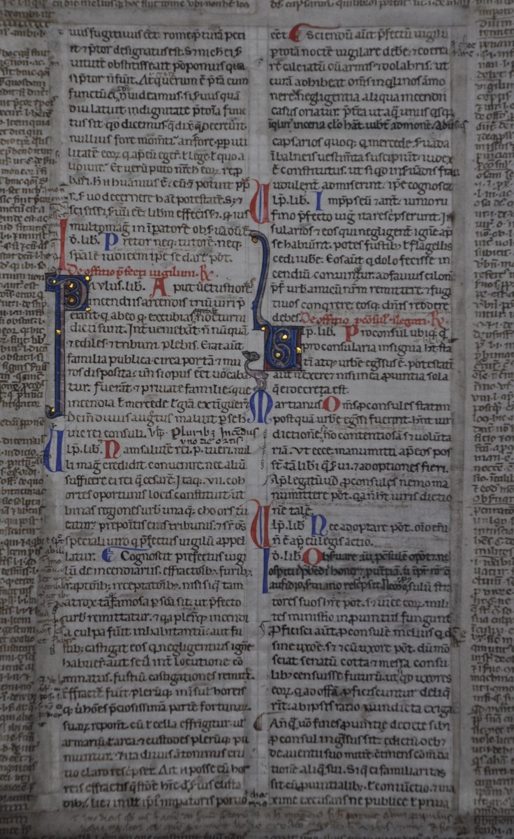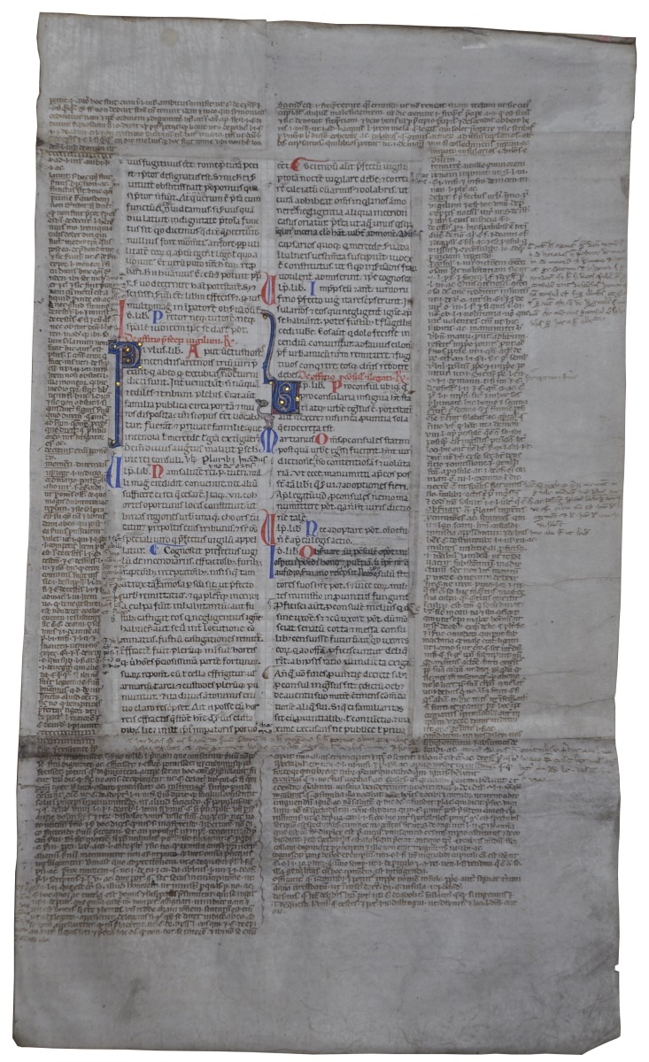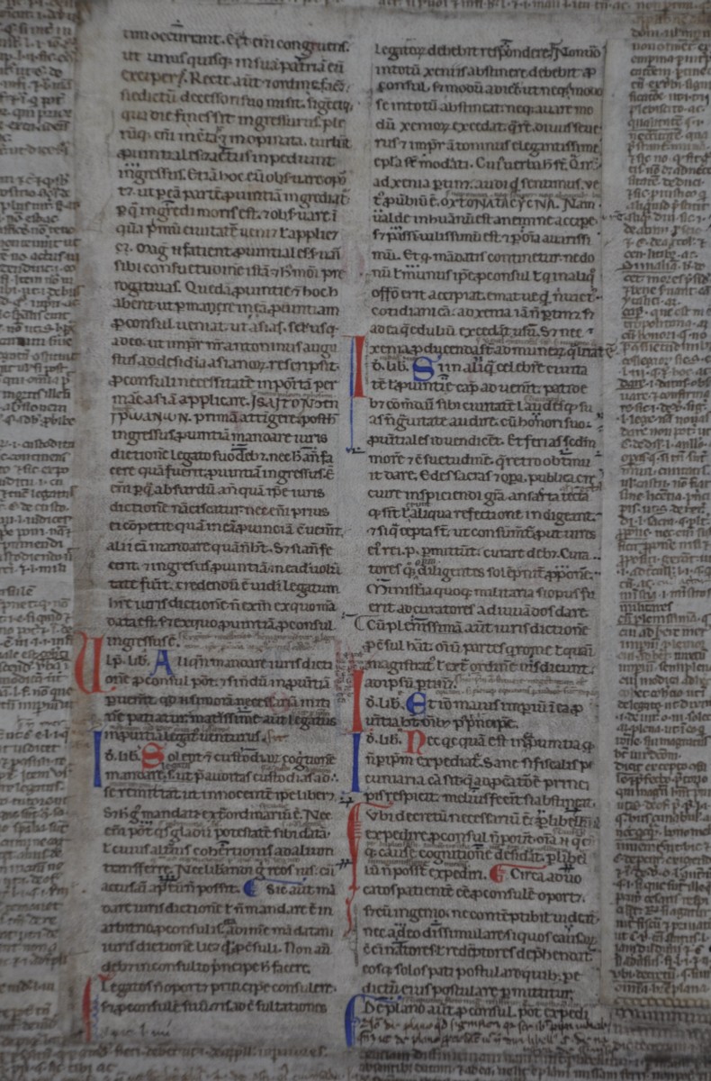 Feuillet de manuscrit de droit canon du premier tiers du 13 éme siècle (circa 1230) du sud de la France , Avignon ou plus probablement Toulouse. La feuille se trouve enchâssée dans un vélin , qui a été glosé dans une écriture Parisienne et plus tardive, vers 1280.