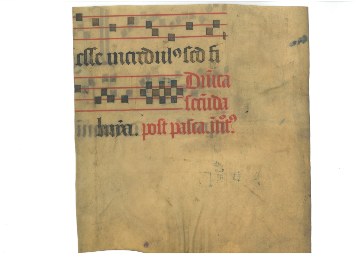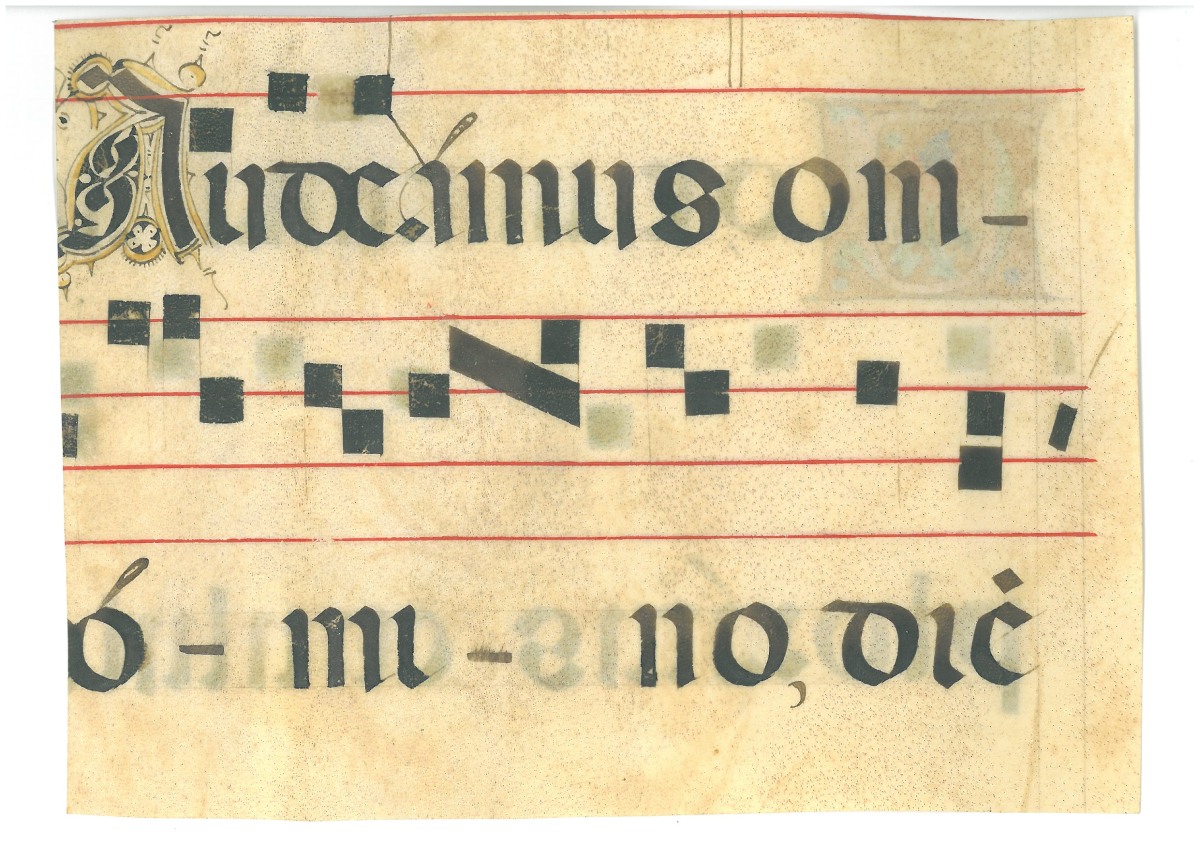 Quelques fragments, dont un début XIVe (54 x 35,5 cm). 14 x 19, 30 x 27,5 et 28 x 20,5 cm.