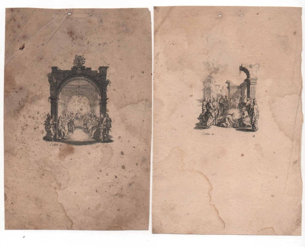Suite de 11 estampes gravées en taille-douce sur papier vergé, les deux premières portant en bas à gauche Callot in. Numérotées [manque la planche n°12, Jésus percé d'une lance]. Env. 15,5 x 10,5 cm. Piqûres, mouillures, pliures.