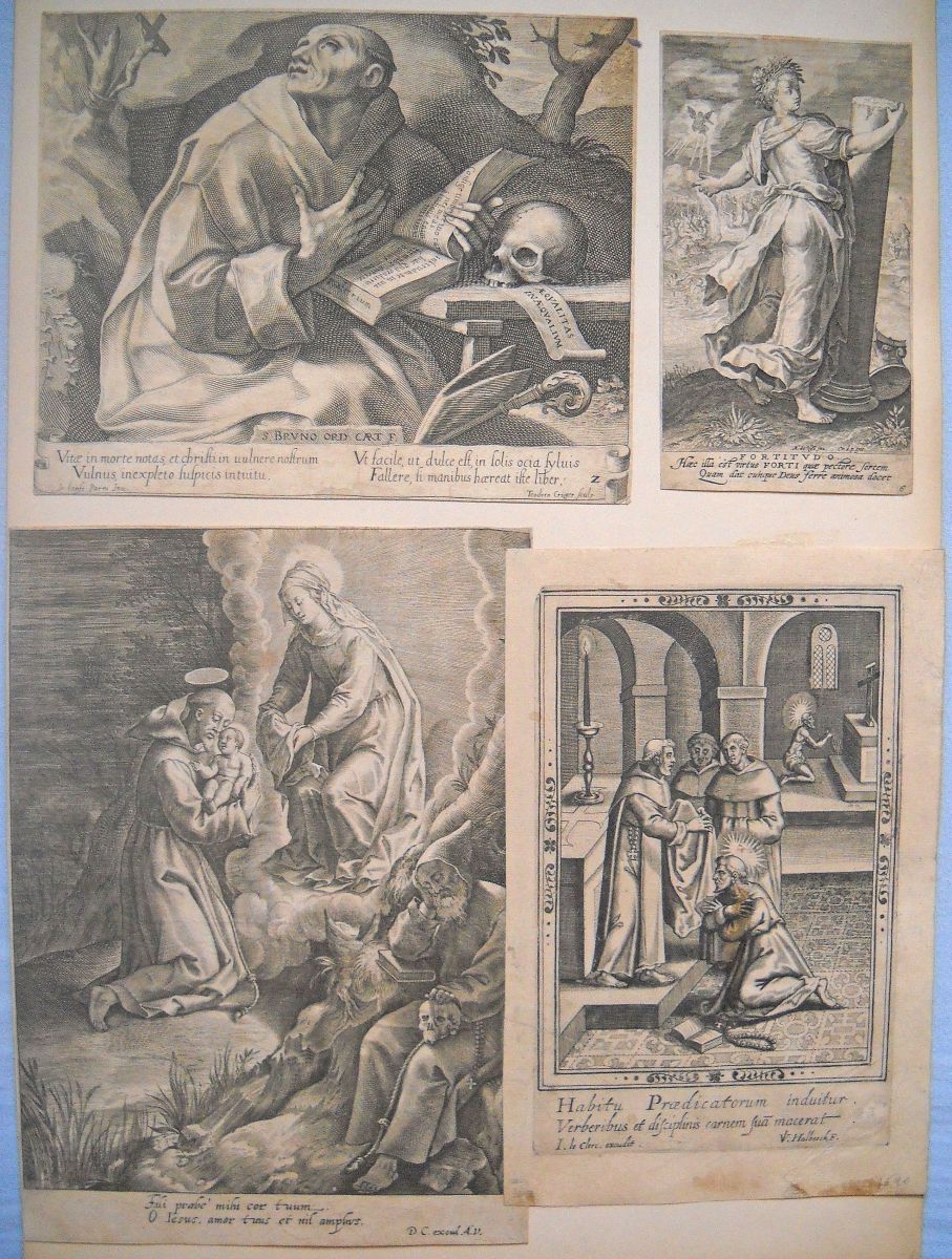 Réunion de plus de 100 estampes à sujets religieux et d'images pieuses, d'époque ou de reproductions anciennes, gravées en taille-douce, certaines rehaussées. Toutes dimensions, états divers, la plupart contrecollées sur papier fort. Dont Albrecht Dürer, 3 p. - Hendrick Goltzius, 3 p. - Jérôme Wierix, 2 p. - Jacques Honervogt, 5 p. - Jacques Granthomme, 4 p. - 6 p. tirées de la vie vie de Saint Benoît, 4e quart du XVIe s.