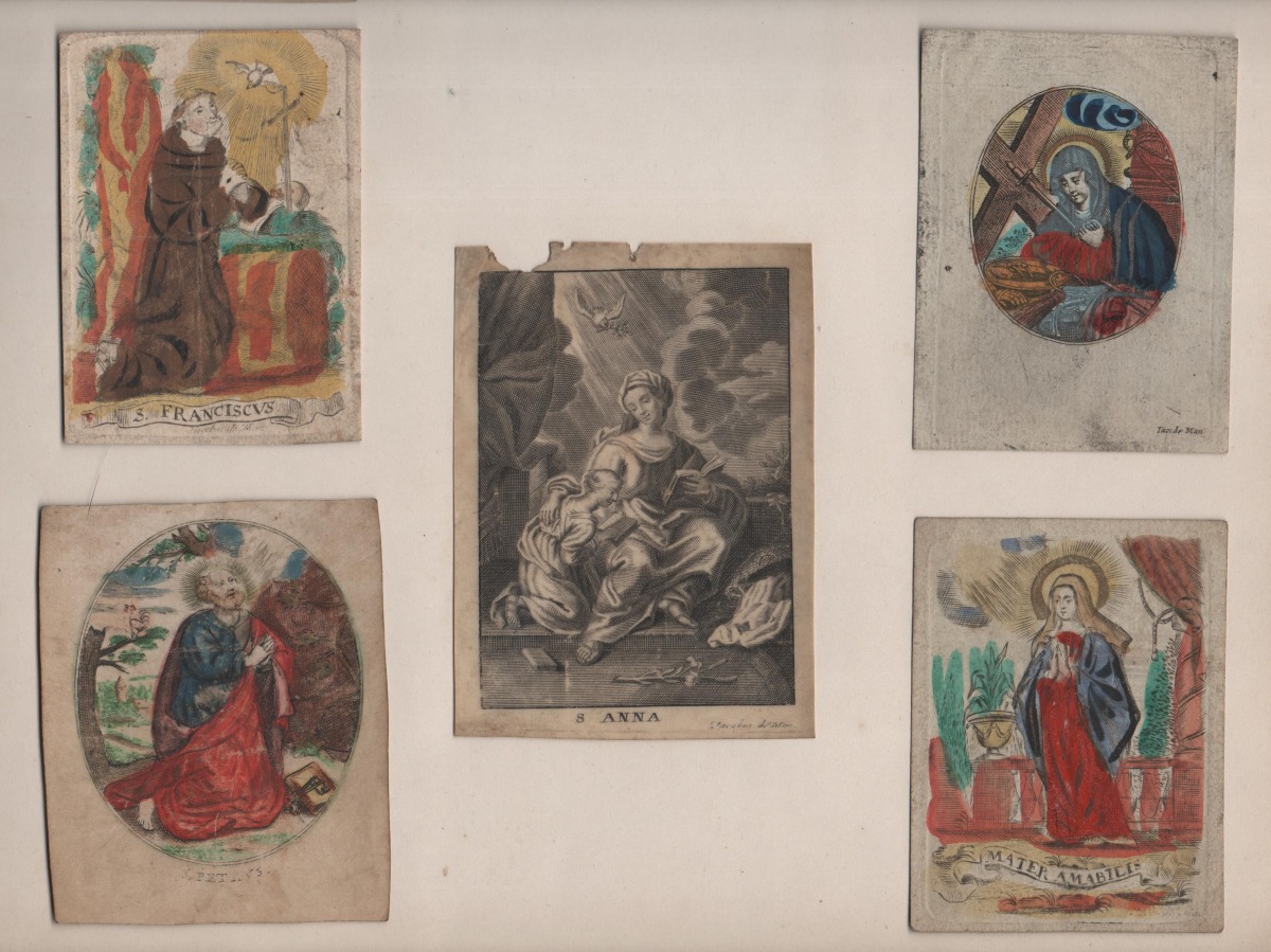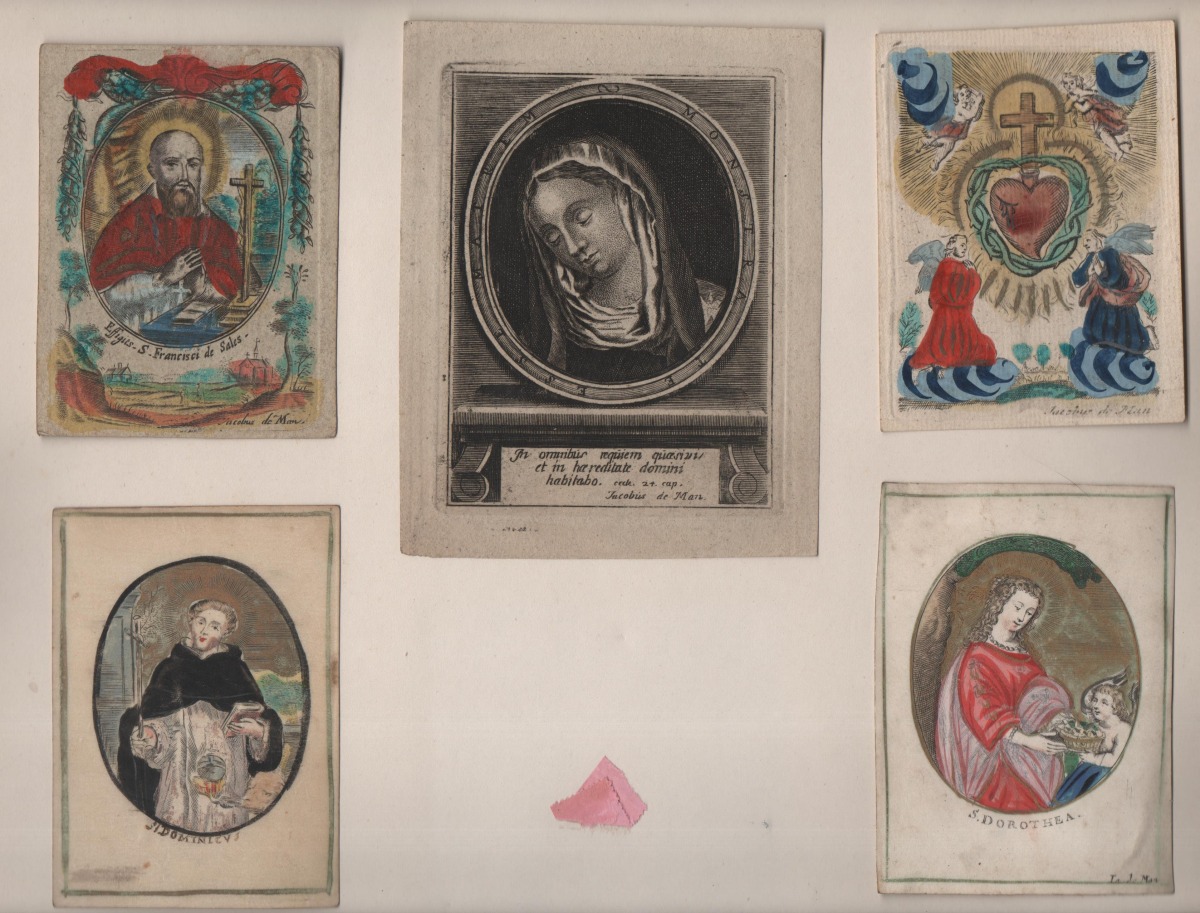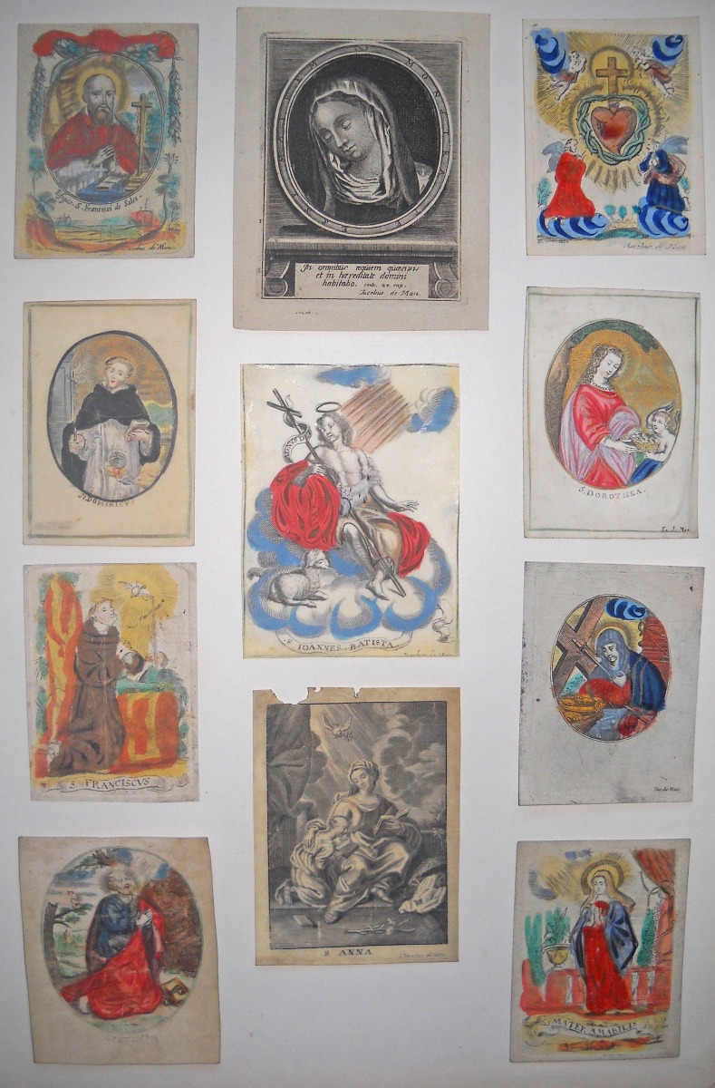 11 images pieuses, gravure sur cuivre, formats divers: 9 p. signées Jacobus de Man sur papier vergé, vélin et parchemin dont 7 rehaussées à la gouache et aquarelle ; 2 p. sur parchemin non signées. Contrecollées sur papier épais.