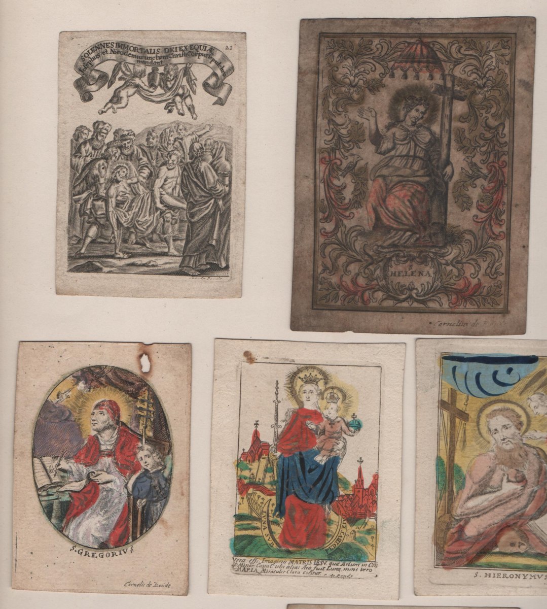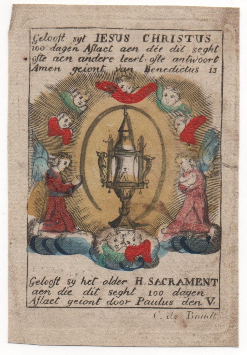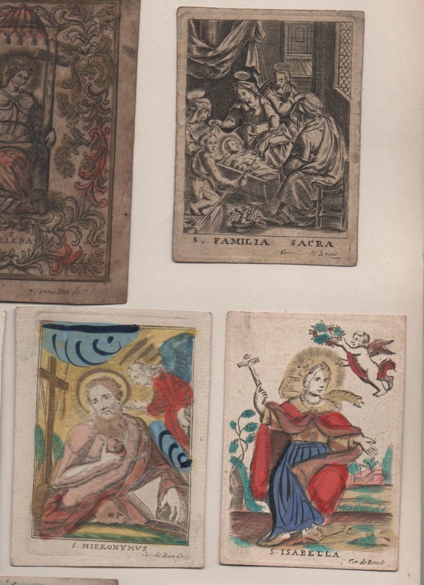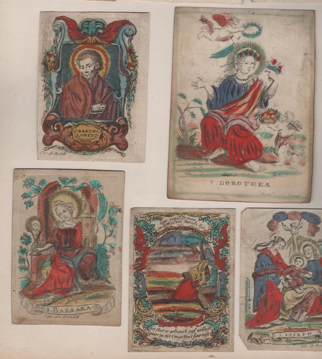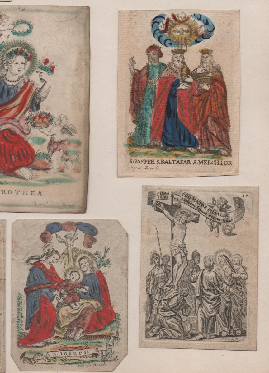15 images pieuses, gravure sur cuivre, formats divers, signées Cor. De Boudt, sur papier vergé, vélin et parchemin dont 12 p. rehaussées à la gouache et aquarelle. Contrecollées sur papier épais.