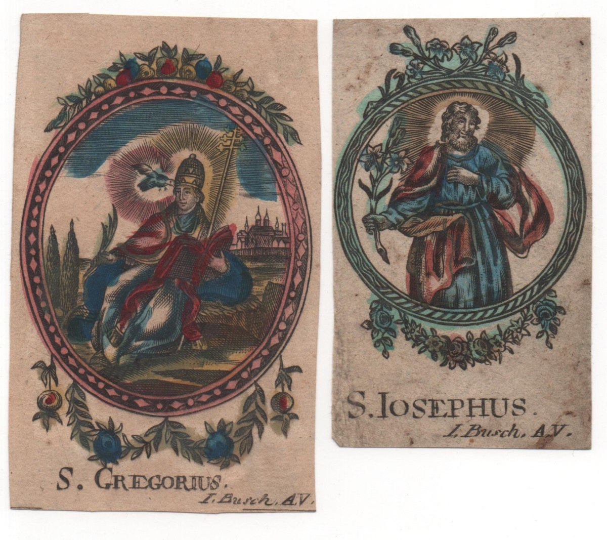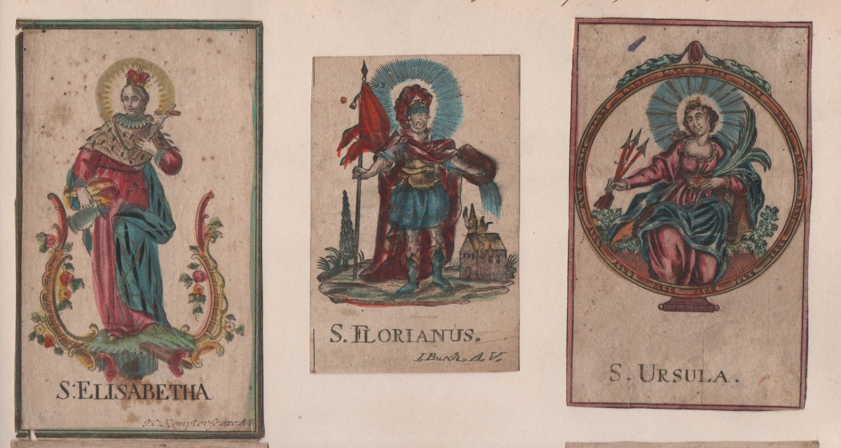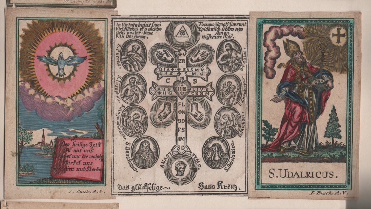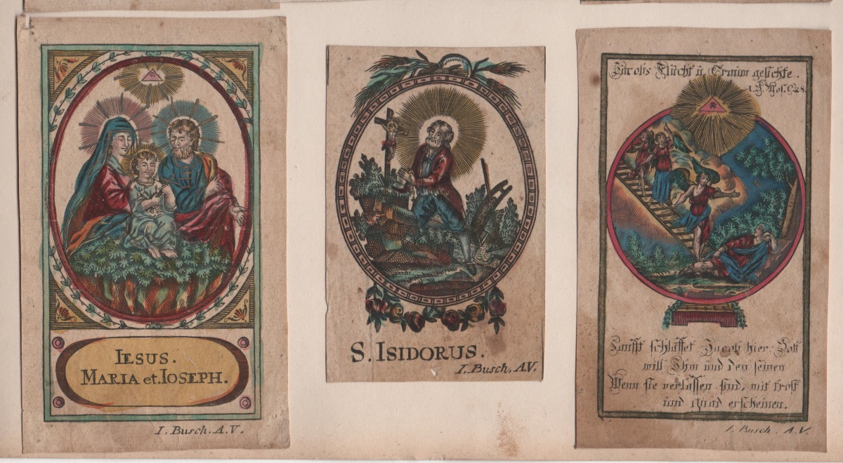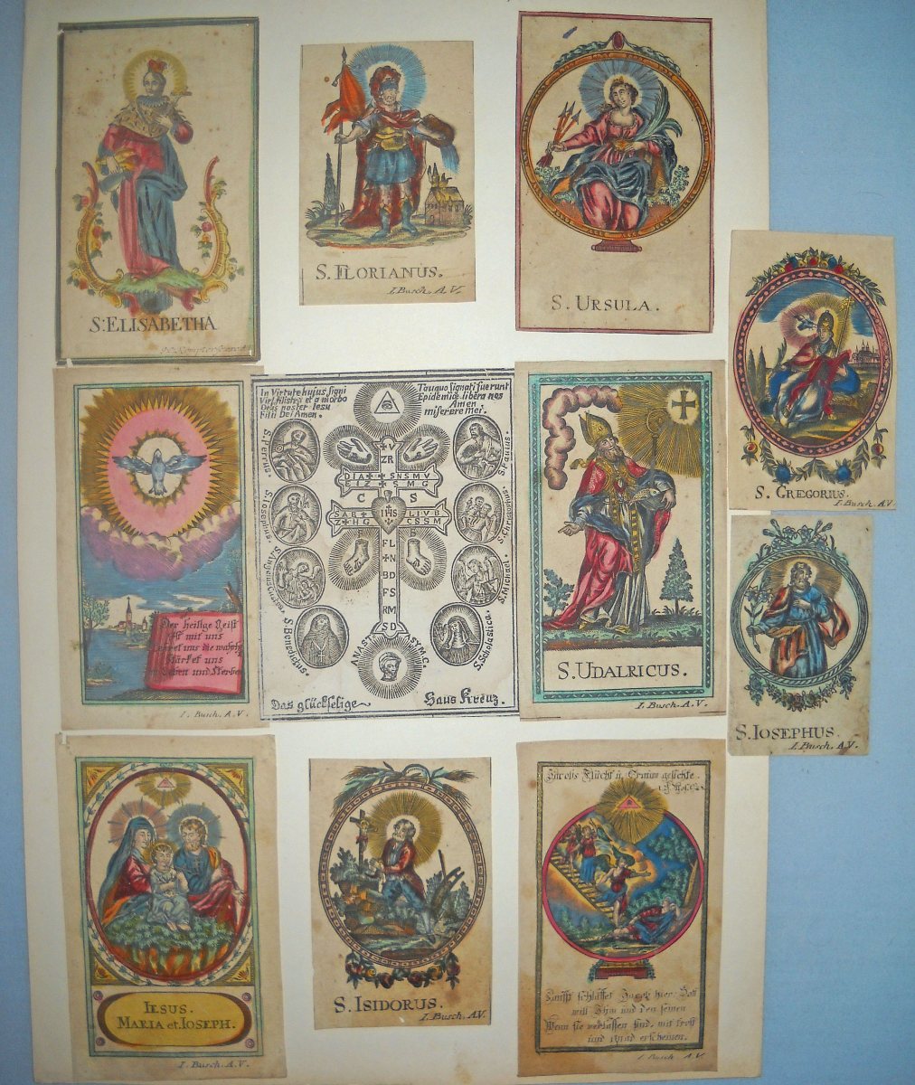 11 images pieuses, gravure sur bois et sur cuivre, formats divers, sur papier vergé et vélin, dont: 8 p. signées I. BUSCH A.V. rehaussées à l'aquarelle et dorure ; 1 p. signée J.C. KEMPTER rehaussée à l'aquarelle et dorure ; 2 p. non signées. Contrecollées sur papier épais.