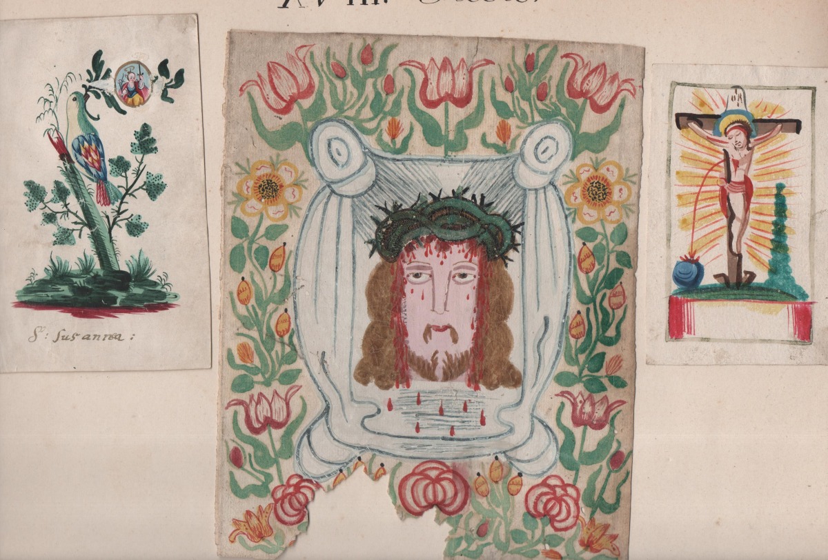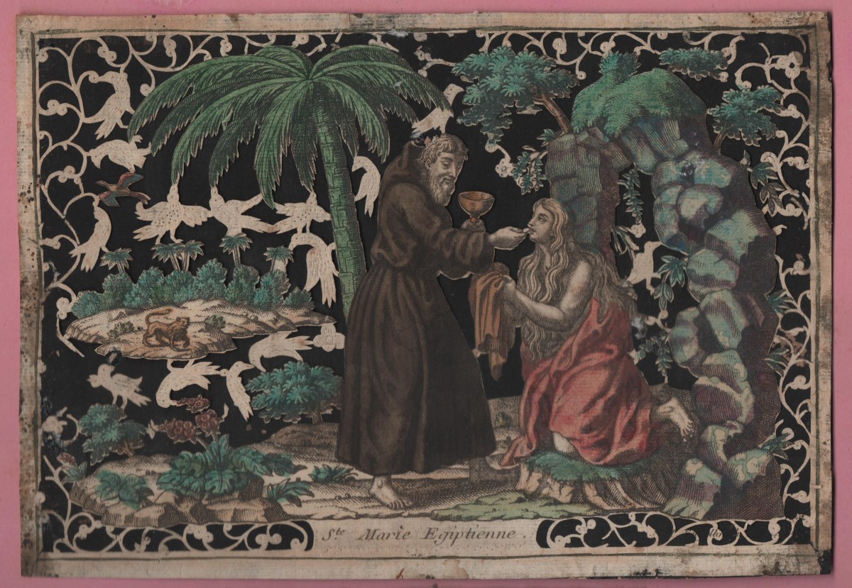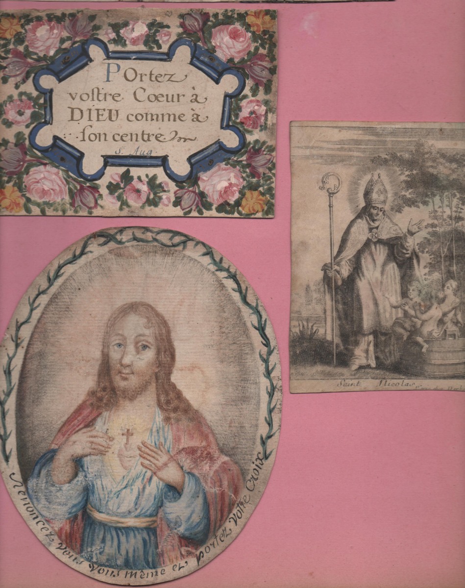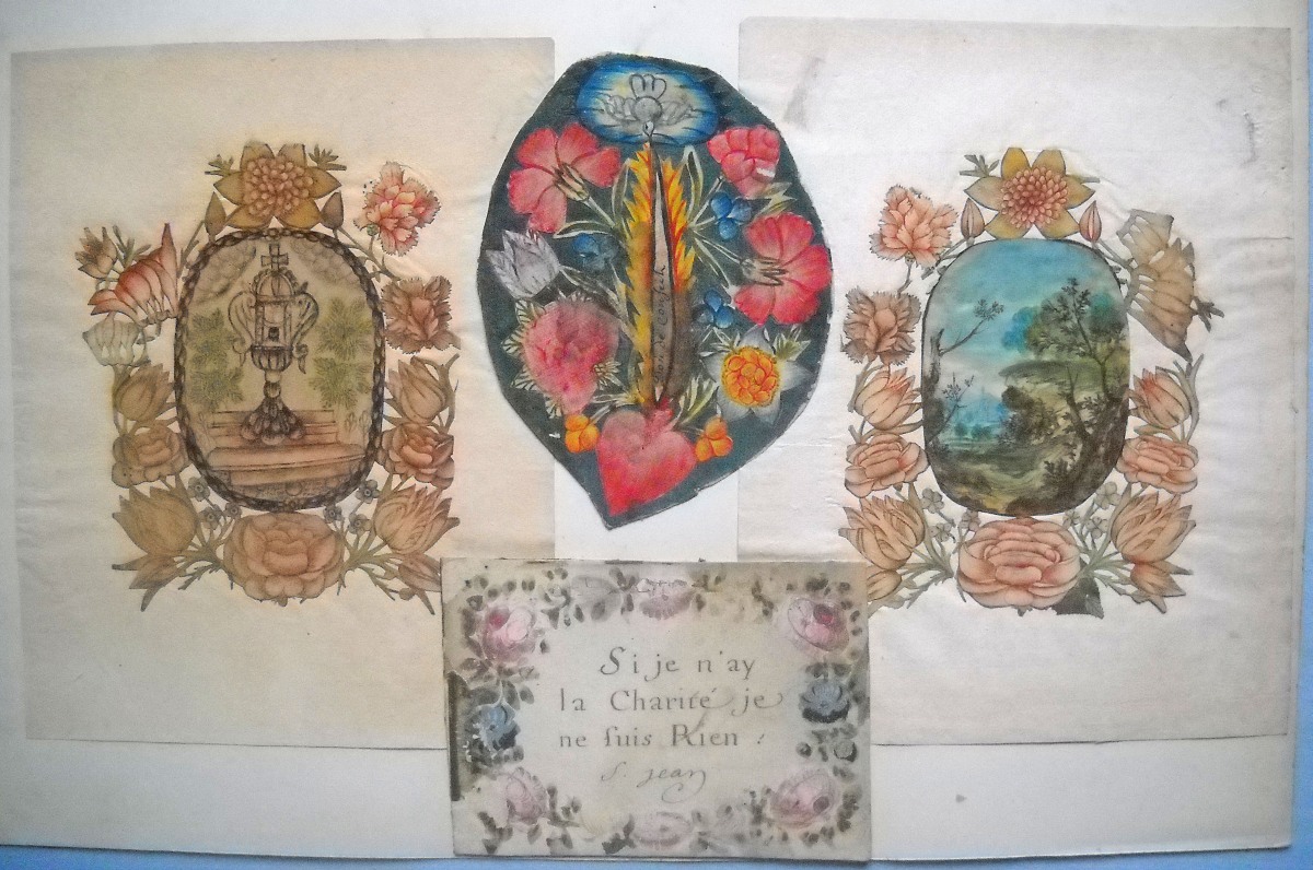 Réunion de 17 images pieuses peintes et découpis: représentation de Saint Vincent de Paul, aquarelle sur papier légendée St Vincent de Paul, prêchant aux galères de Marseille, se chargea des chaînes d'un forçat, pour rendre un père à quatre enfants, et un mari à une épouse désolée, 32 x 40 cm ; un cardinal agenouillé lisant le Saint Evangile, aquarelle sur parchemin, 23,5 x 32,5 cm ; 2 uvres de jeunesse, scènes de vie en médaillon central à contour floral à la gouache et aquarelle sur parchemin légendées Que je trouve de douceur en ce doux nom du Sauveur, 23 x 20,5 cm, et Pour preuve de mes faveurs je vous présente ses fleurs, 26 x 25 cm ; Ste Marie Egiptienne, en papier imprimé et découpis rehaussés, 24 x 16,5 cm ; etc.