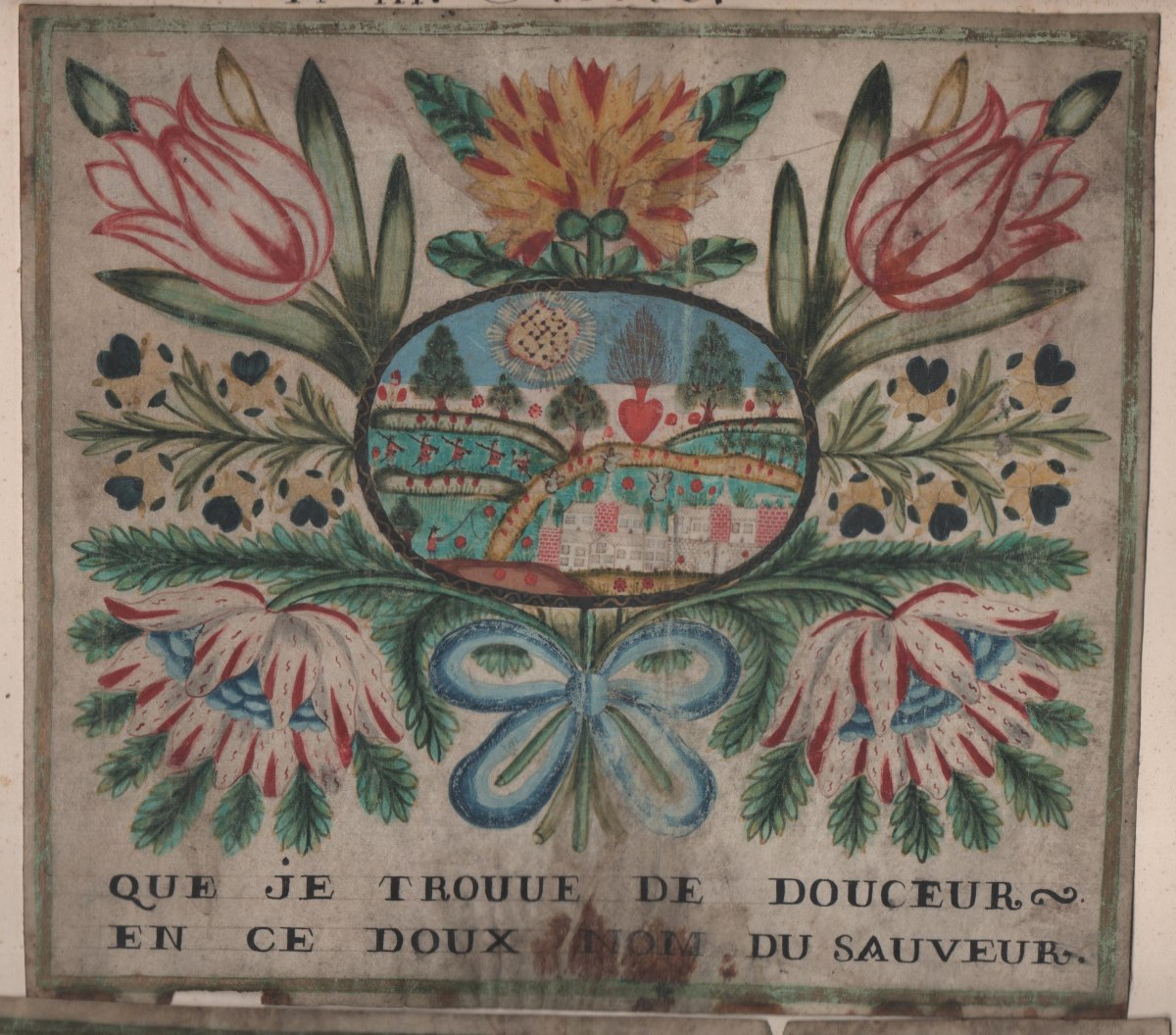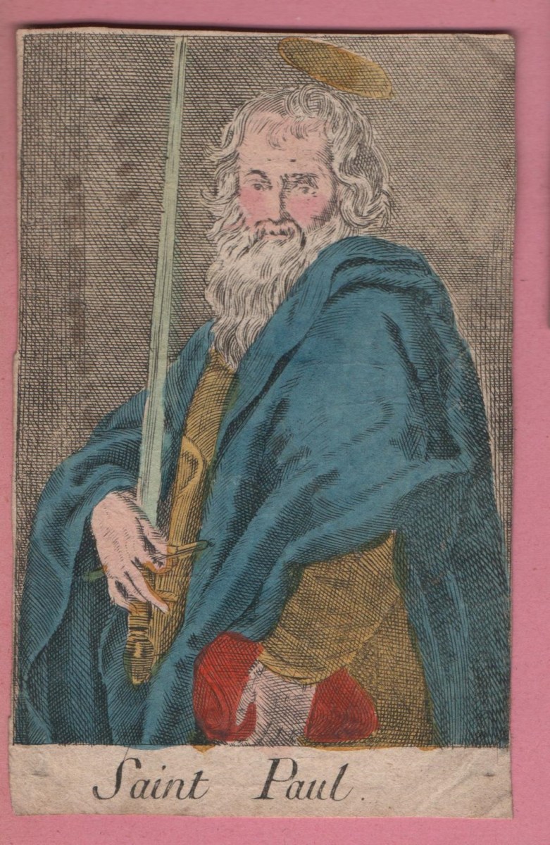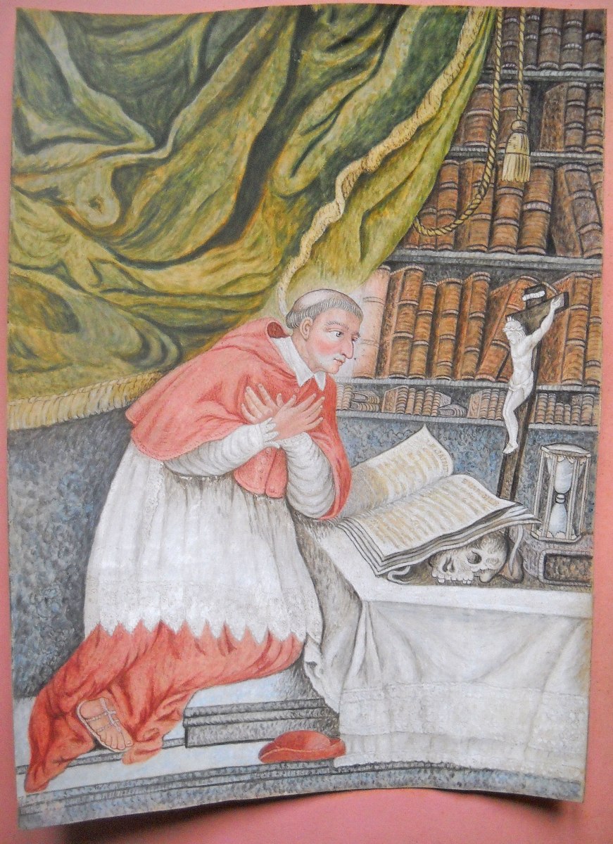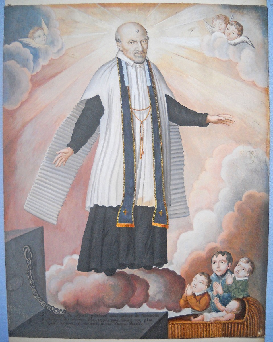 Réunion de 17 images pieuses peintes et découpis: représentation de Saint Vincent de Paul, aquarelle sur papier légendée St Vincent de Paul, prêchant aux galères de Marseille, se chargea des chaînes d'un forçat, pour rendre un père à quatre enfants, et un mari à une épouse désolée, 32 x 40 cm ; un cardinal agenouillé lisant le Saint Evangile, aquarelle sur parchemin, 23,5 x 32,5 cm ; 2 uvres de jeunesse, scènes de vie en médaillon central à contour floral à la gouache et aquarelle sur parchemin légendées Que je trouve de douceur en ce doux nom du Sauveur, 23 x 20,5 cm, et Pour preuve de mes faveurs je vous présente ses fleurs, 26 x 25 cm ; Ste Marie Egiptienne, en papier imprimé et découpis rehaussés, 24 x 16,5 cm ; etc.