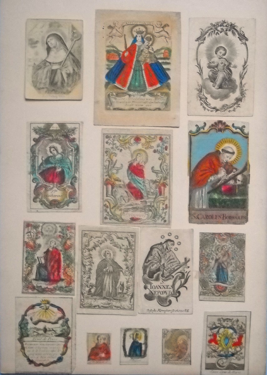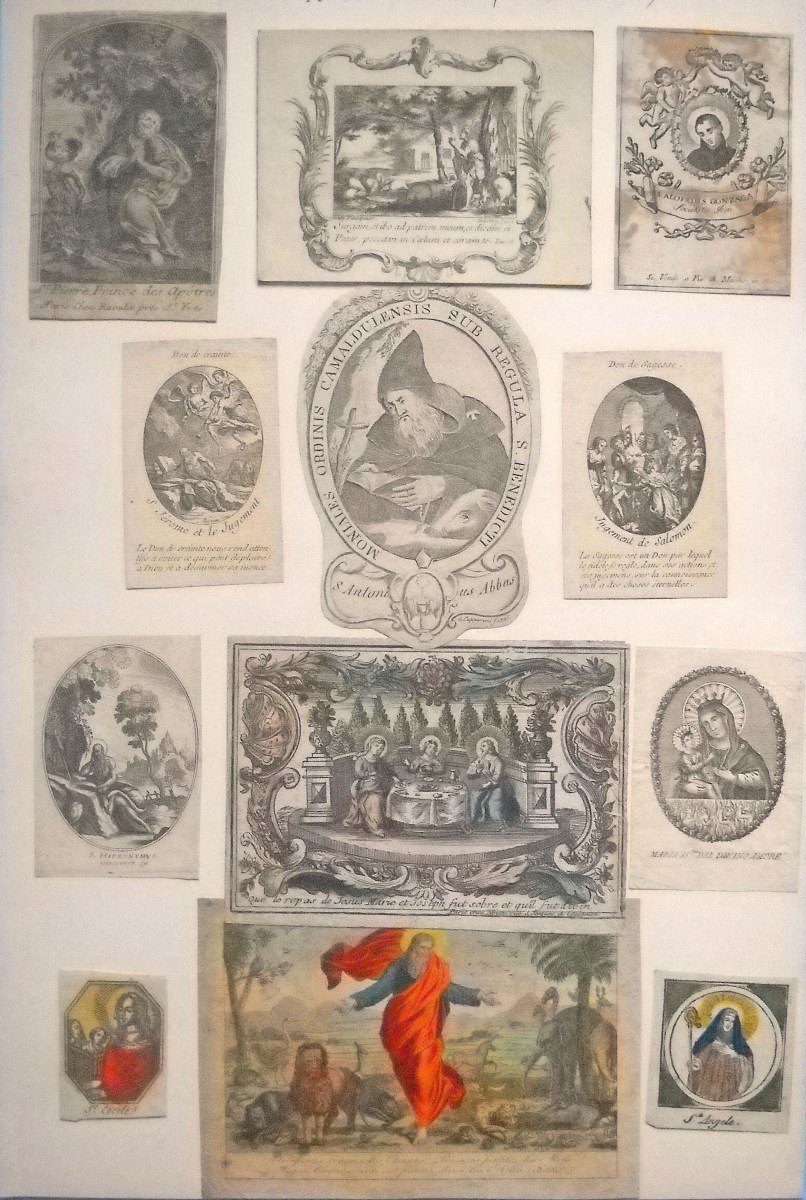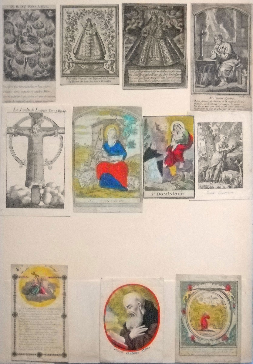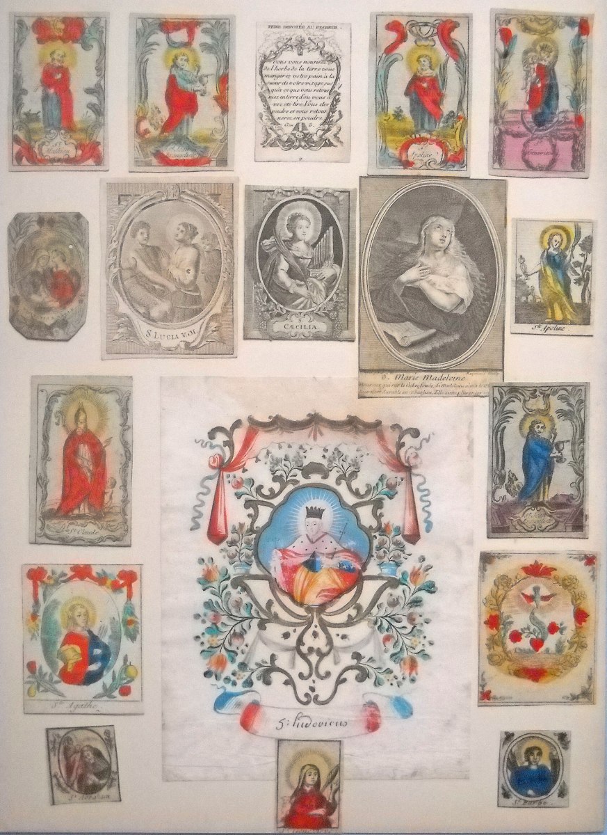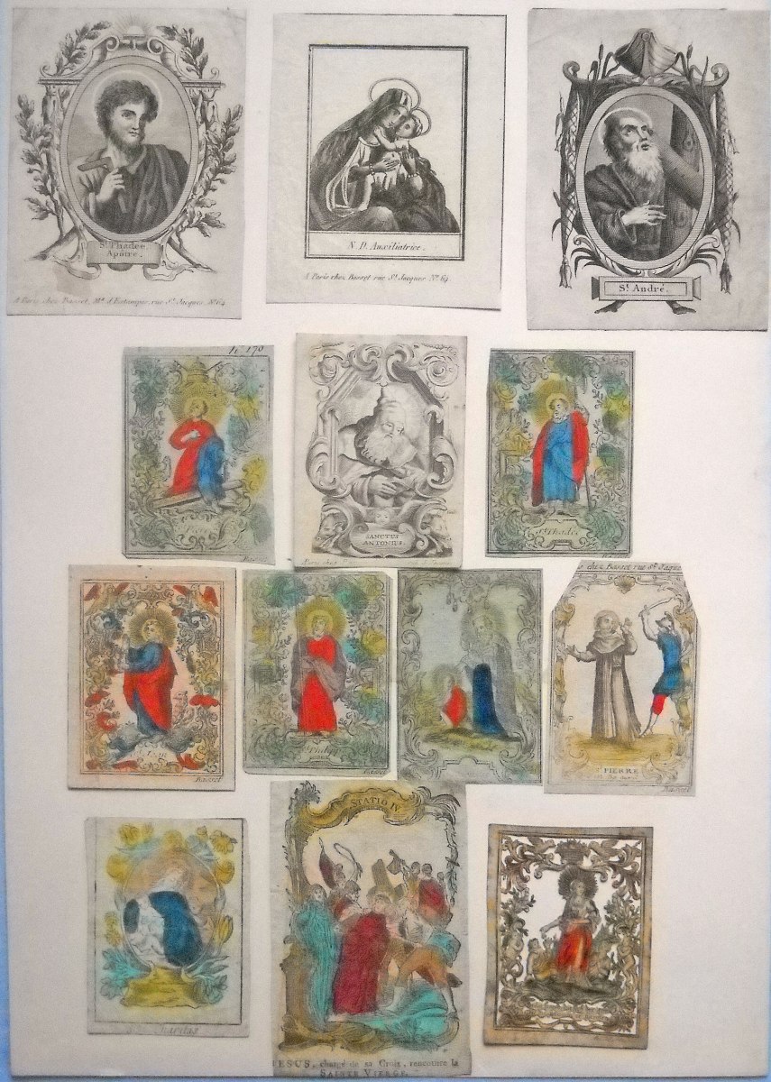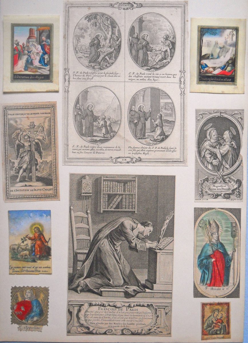 Env. 145 images pieuses, gravure sur cuivre, sur papier vergé et parchemin, la plupart rehaussées à l'aquarelle, formats divers, dont une suite de 10 images légendées de prophéties ; petit canivet en parchemin à rehaut polychrome signé An. Mar. Bunel ; 9 images de saints éditées chez " Basset " rue St Jacques à Paris ; 2 miniatures peintes sur parchemin Adoration des mages et Jésus au jardin des olives ; S. Ludovicus peint sur papier vergé à la gouache polychrome, argentée et dorée, école allemande, 16 x 20,5 cm ; etc. Contrecollées sur papier épais.