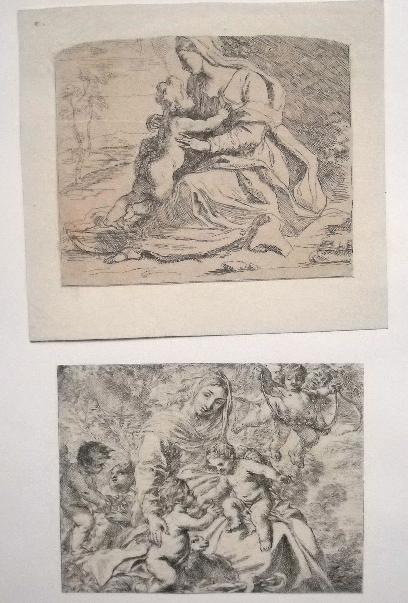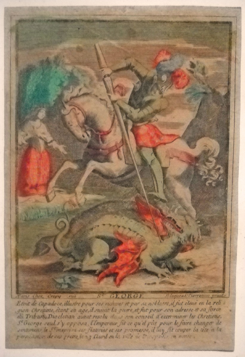 Joint: 5 estampes gravées sur cuivre dont école italienne sur parchemin à rehauts polychromes, 18,5 x 23, cm ; St George à Paris chez Crépy, 19,5 x 28,5 cm ; belle planche à taille douce de 4 images à découper, 27 x 36 cm.