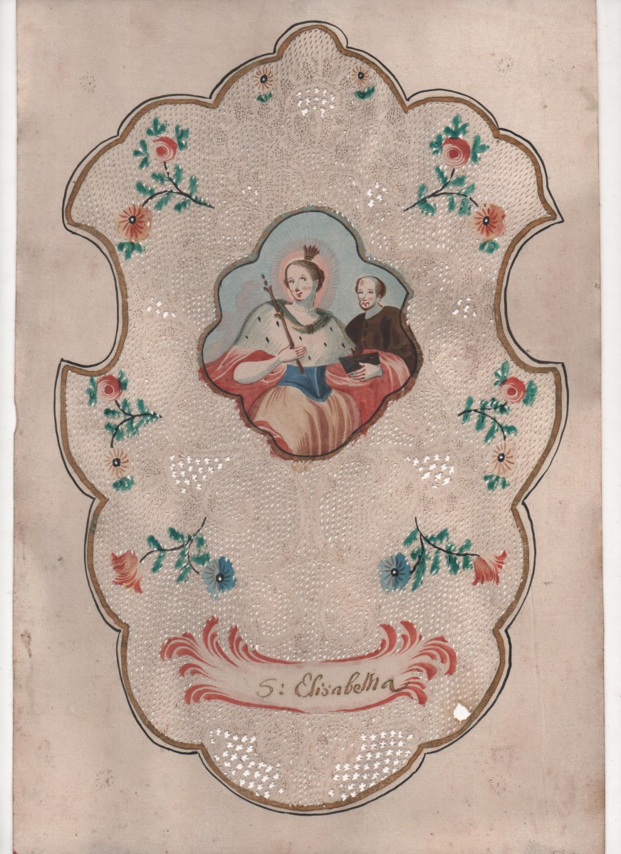 Grand canivet sur papier: dans un écusson baroque à double filet noir et or sur marge blanche, à décor de découpes à motifs géométriques et de fleurs peintes, un médaillon festonné à décor peint sur fond azur représentant sainte Élisabeth auréolée et couronnée d'un diadème or. Vêtue d'une lourde chape d'hermine à traîne rouge sur une robe jaune à plastron bleu, elle tient dans sa main droite le sceptre royal et dans sa main droite un livre noir à couronnes. Derrière elle, sur son côté gauche, un homme habillé de brun - probablement Conrad de Marbourg son directeur spirituel. Cartouche à frange rouge portant l'inscription en lettres dorées S. Elisabetha. 33 x 20,5 cm. Petit manque, mouillures en bordure.