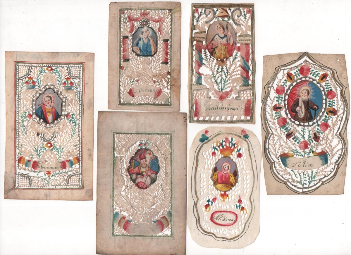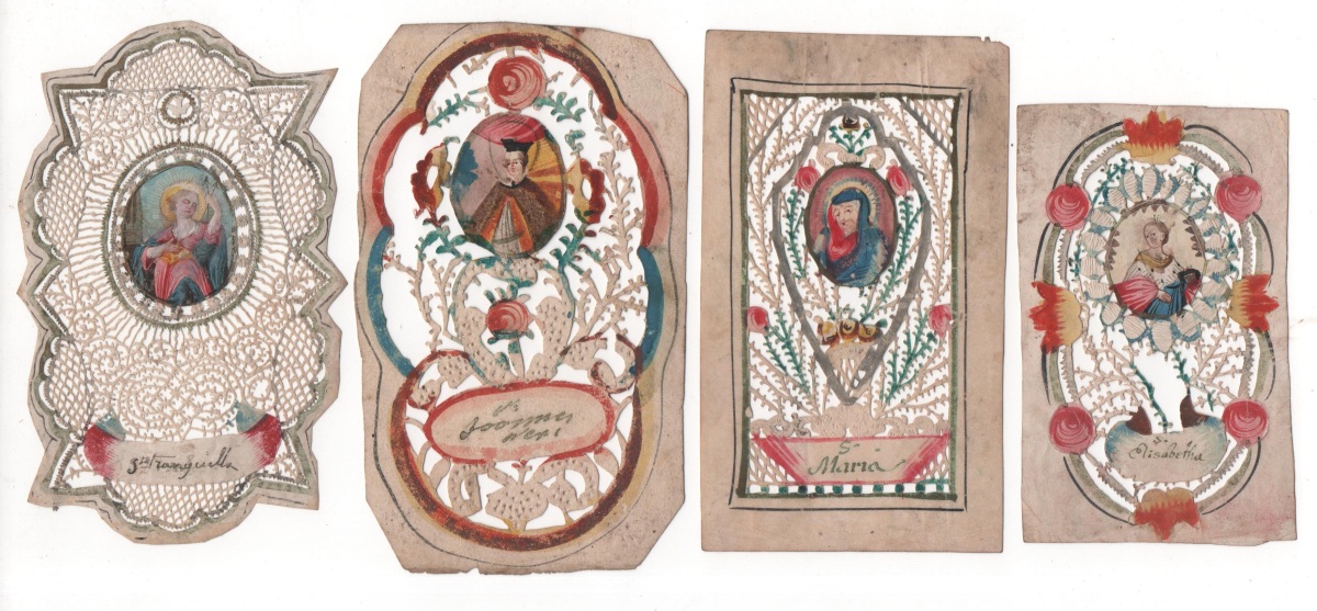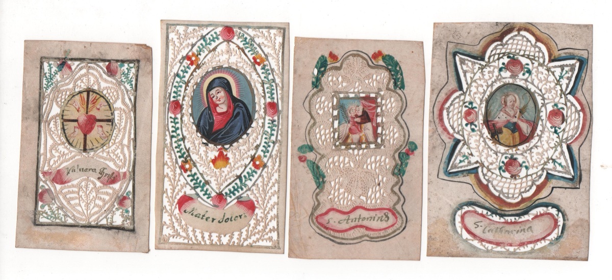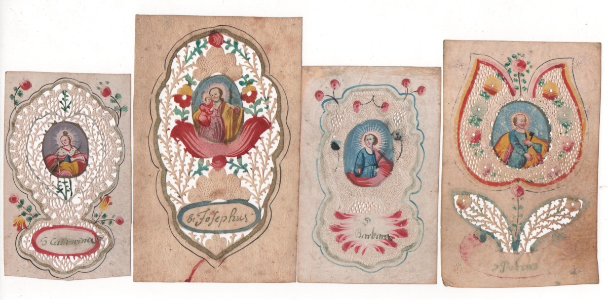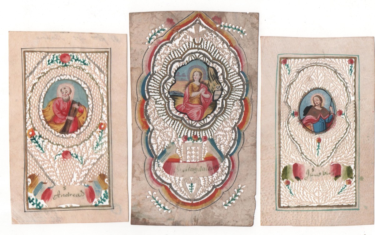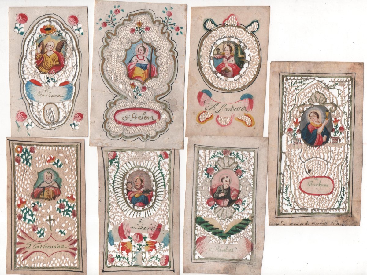 Lot de 28 canivets sur vélin et papier, formats divers, entre 9,5 x 6 cm et 14 x 8 cm, à décor de découpes de motifs géométriques et à décor floral peint, ornés chacun d'un médaillon central peint représentant sainte Elisabeth, sainte Barbe, sainte Hélène, saint Paul, sainte Catherine, sainte André, sainte Madeleine, sainte Pierre, saint Félix, saint Tranquilla, saint Joseph, etc. États divers. État moyen à T.B.E.