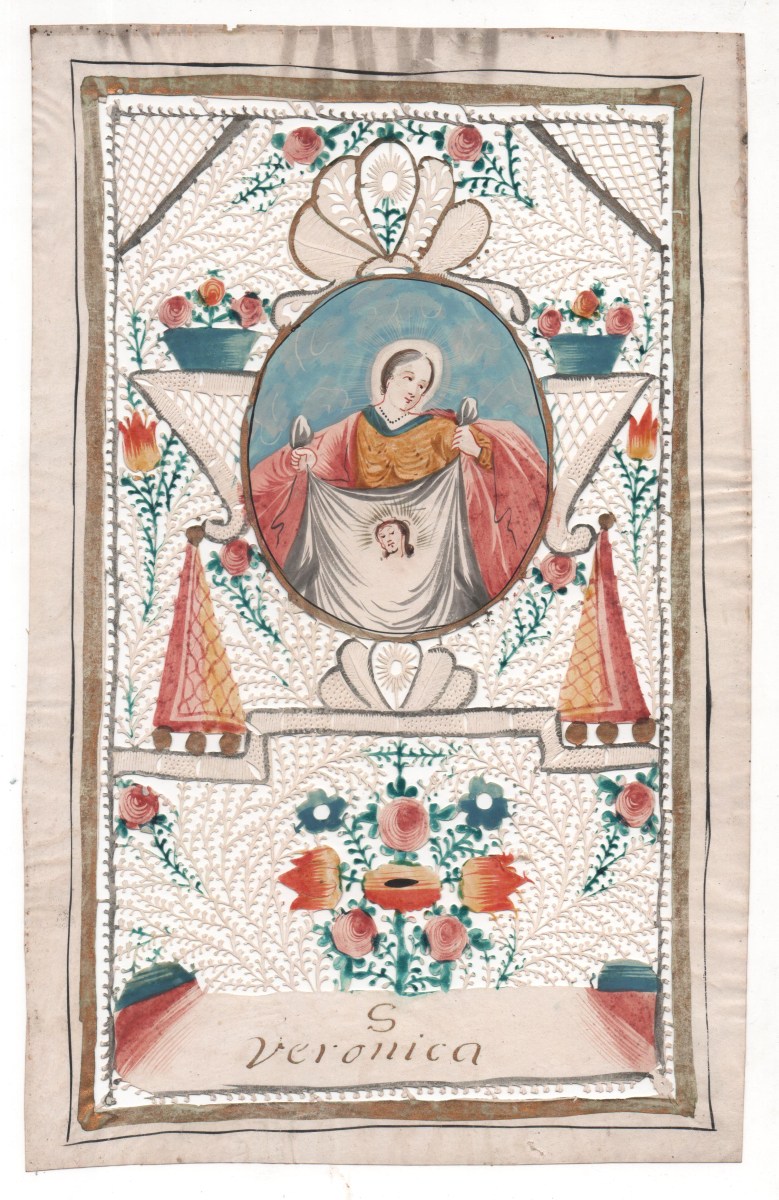 - Au centre un médaillon peint et cerné d'or représentant sainte Véronique auréolée, vêtue d'une robe jaune à liserai bleu couvert d'un ample manteau rouge, tenant entre ses main le voile sur lequel apparaît la Sainte Face. Les entours sont richement décorés de découpes de Valenciennes, fins capillaires, picotés, volutes, coquilles, bouquet et corbeilles floraux, roses, tulipes et autres fleurs peintes. Cartouche tricolore portant l'inscription en lettres or: S. Veronica. 28 x 17,5 cm. Petits accidents et manques.