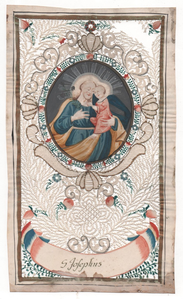 - Dans un riche décor de découpes de réseau de capillaires, volutes, entrelacs, fleurs peintes, coquilles, se détache un médaillon central peint cerné d'un filet d'or et d'une guirlande florale. Sur fond mauve apparaît Saint Joseph auréolé, vêtu d'une tunique bleue et d'un manteau drapé jaune, tenant contre lui l'Enfant Jésus auréolé et habillé d'une tunique rouge. Cartouche tricolore portant l'inscription en lettres d'or: S. Josephus. 26,5 x 15,5 cm. Mouillures, accidents et manques.