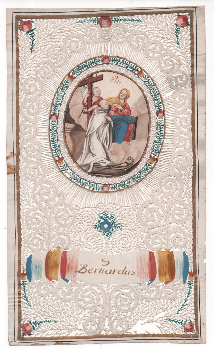 - Dans un riche décor de découpes rayonnantes, capillaires, volutes, fleurs et guirlande florale peintes, un médaillon central peint représente la lactation de saint Bernard de Clairvaux. Cartouche tricolore portant l'inscription à lettres d'or: S. Bernardus. 28,5 x 17 cm. Petits accidents et manques.
