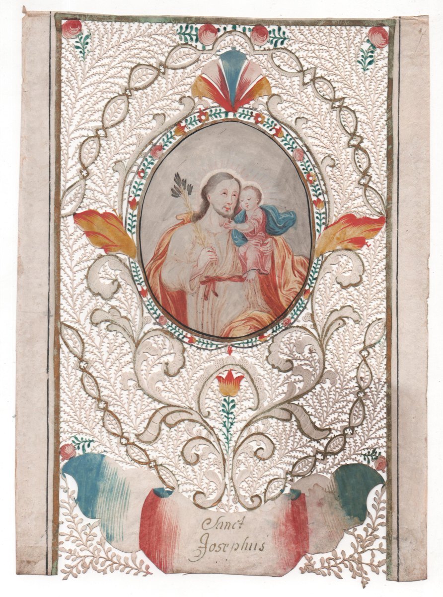 - Un médaillon central peint cerné d'or et de guirlande florale représente saint Joseph, tenant dans sa main droite une tige de lys et dans sa main gauche l'Enfant Jésus, aux entours à décor de découpes de capillaires, volutes, végétaux et fleurs peintes. Cartouche tricolore portant l'inscription en lettres d'or: Sanct. Josephus. 24,5 x 18 cm. Accidents et manques (partie inférieure).