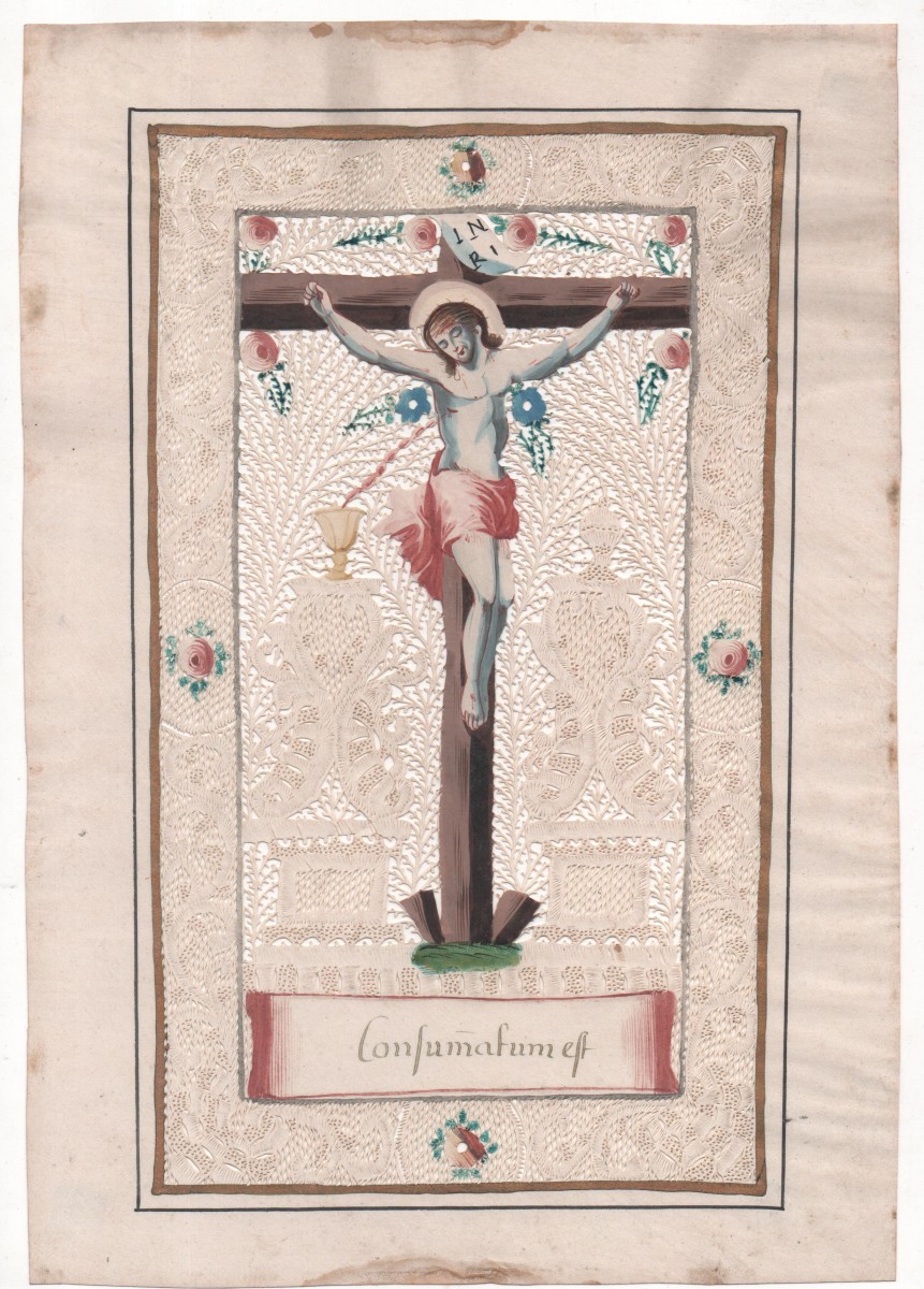 - Sur une lourde croix peinte en brun, maintenue en terre par deux pieux, Jésus, le front ceint de la couronne d'épines, le corps enveloppé dans une draperie rose, nouée sur le côté, porte les marques de son supplice. Ses plaies saignent aux mains, aux pieds et au côté d'où le sang jaillit recueilli par une coupe dorée. Au sommet de la croix, les lettres I.N.R.I. Le sujet s'étale sur un riche décor de fines découpes de capillaires, volutes, Valenciennes, fleurs peintes. Cartouche cerné de rose portant l'inscription en lettres d'or: Consumatum est. 28,5 x 19,5 cm. Mouillures en bordure.