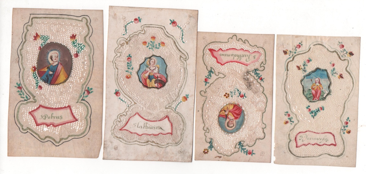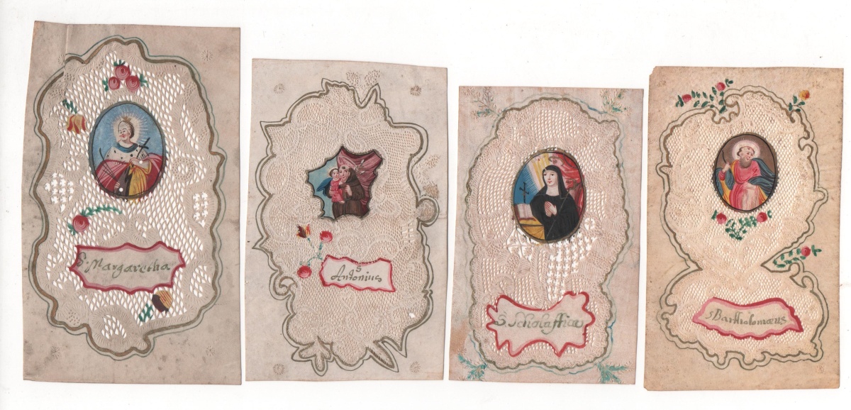 Lot de 8 petits canivets sur vélin, formats divers, entre 10,5 x 6,5 cm et 12,5 x 7,5 cm, au tracé baroque à décor de découpes au réseau de Valenciennes et autres motifs géométriques, au médaillon central peint, ovale ou festonné, représentant saint Barthélemy, sainte Scholastique, saint Antoine, sainte Marguerite, sainte Catherine, saint Pierre et sainte Geneviève. B.E. et T.B.E.