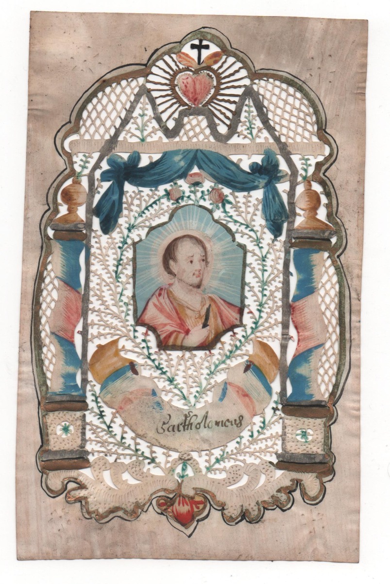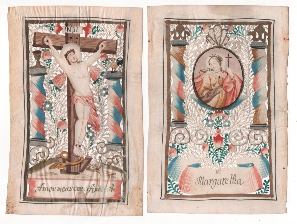 3 canivets sur vélin à cadre rectangulaire ou festonné à double tracé noir et or sur marge blanche, au riche décor de découpes et peint de colonnes torses, capillaires, Valenciennes, entrelacs, fleurs, volutes représentant saint Barthélemy dans un médaillon peint festonné et cerné d'or (16,5 x 10,5 cm), le Christ en croix avec l'inscription en lettres d'or: Amor meus crucifiscus est (19 x 12 cm), et sainte Marguerite dans un médaillon peint ovale (19 x 12,5 cm). Mouillures.