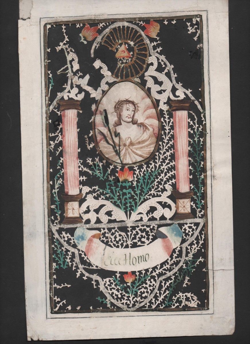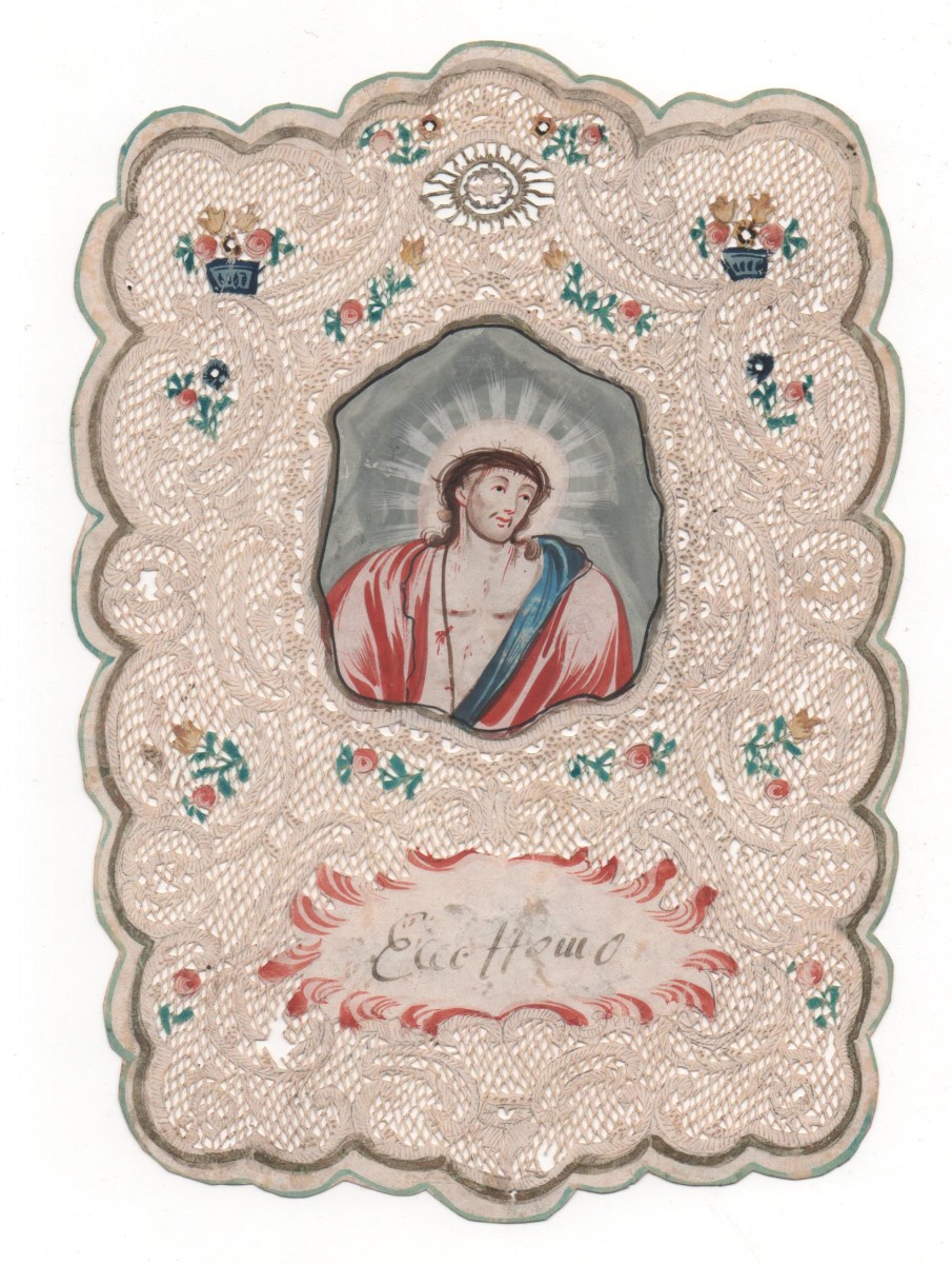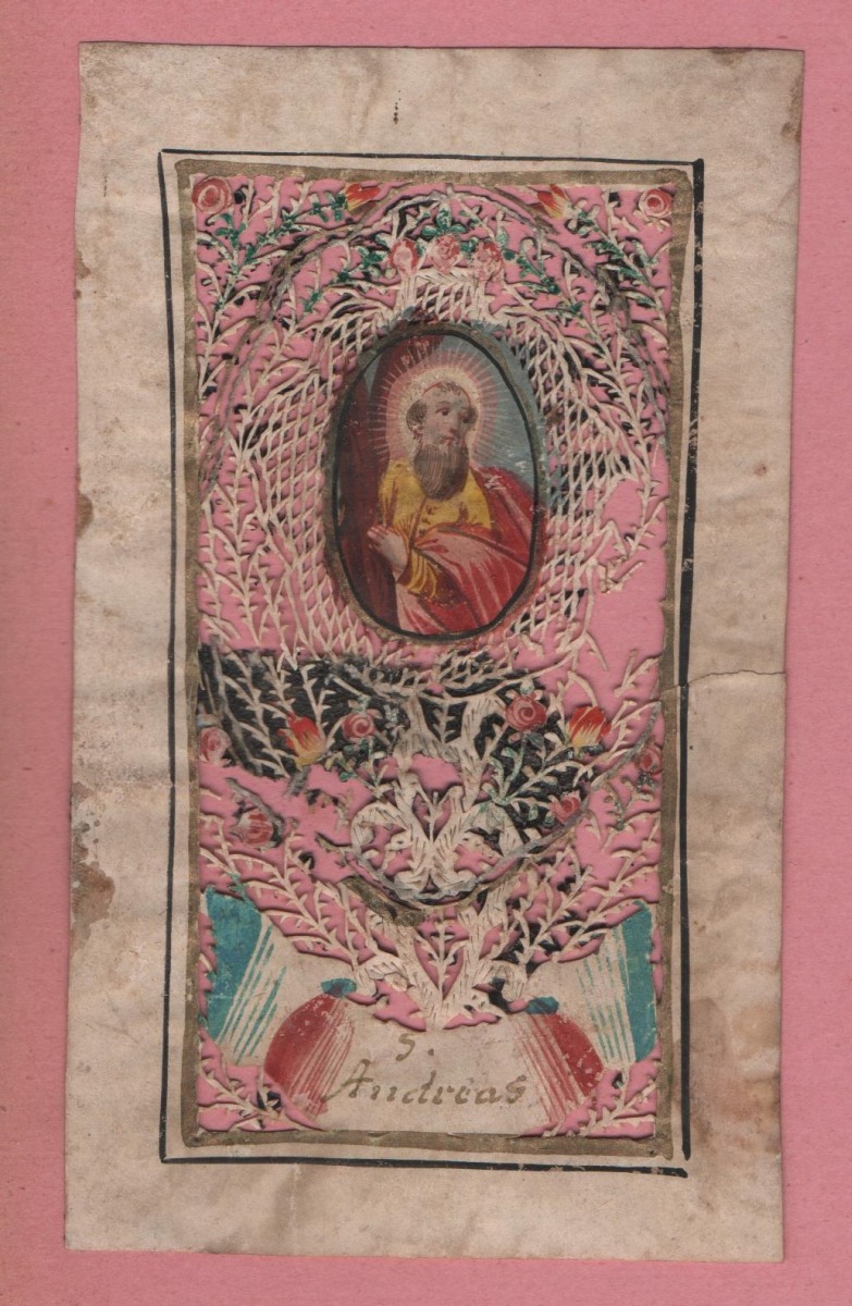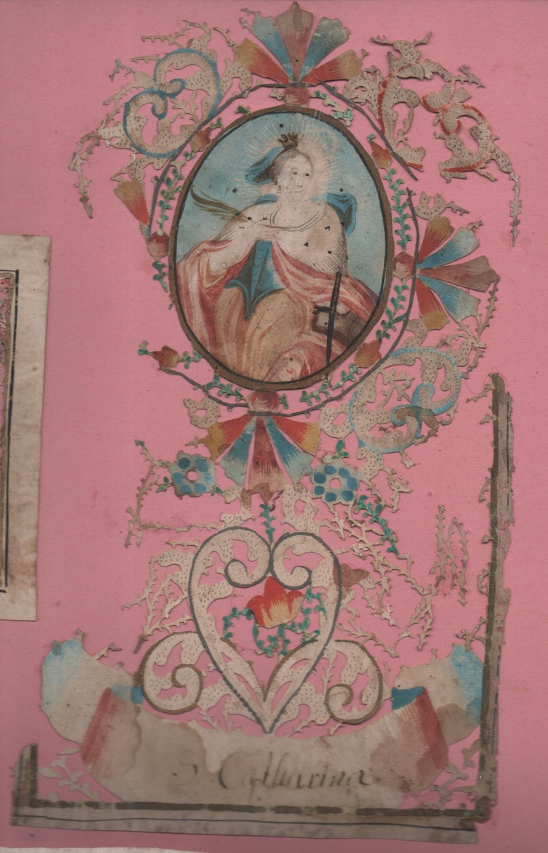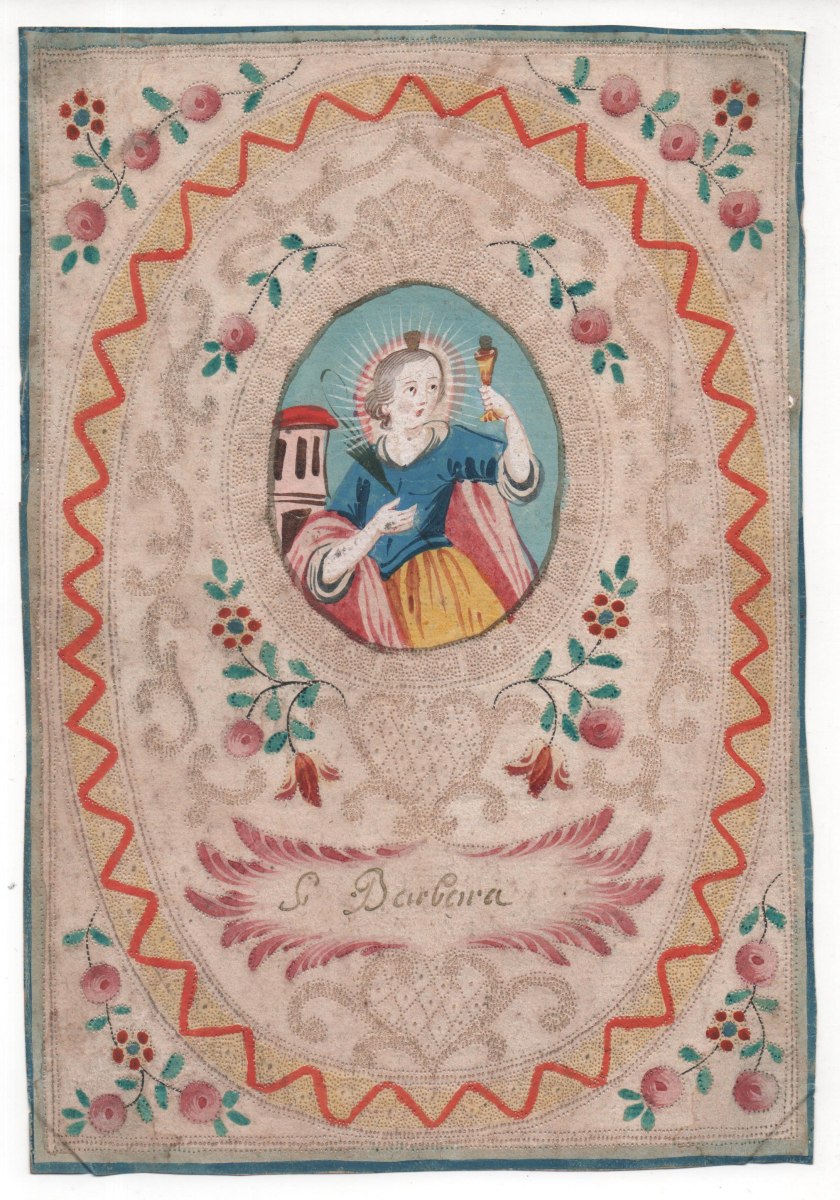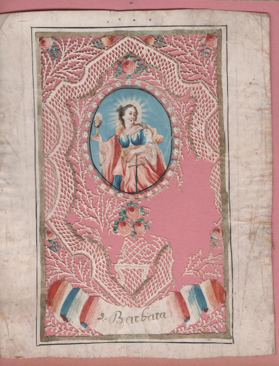 Canivet sur papier représentant dans un médaillon peint sainte Barbe vêtue d'un juste au corps bleu et d'une robe jaune drapée dans un manteau rouge, tenant dans sa main droite la palme du martyr et dans sa main gauche le ciboire surmonté d'une hostie. Les contours sont ornés d'un riche travail de picoté et de roses, pensées et tulipes peintes. Cartouche frangé en rose à l'inscription en lettres d'or: S. Barbara. 25 x 17 cm.