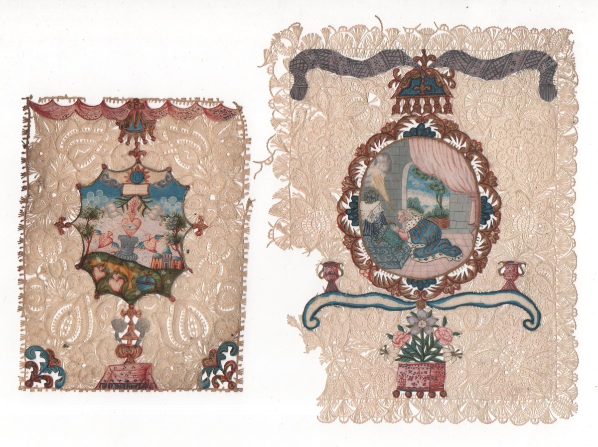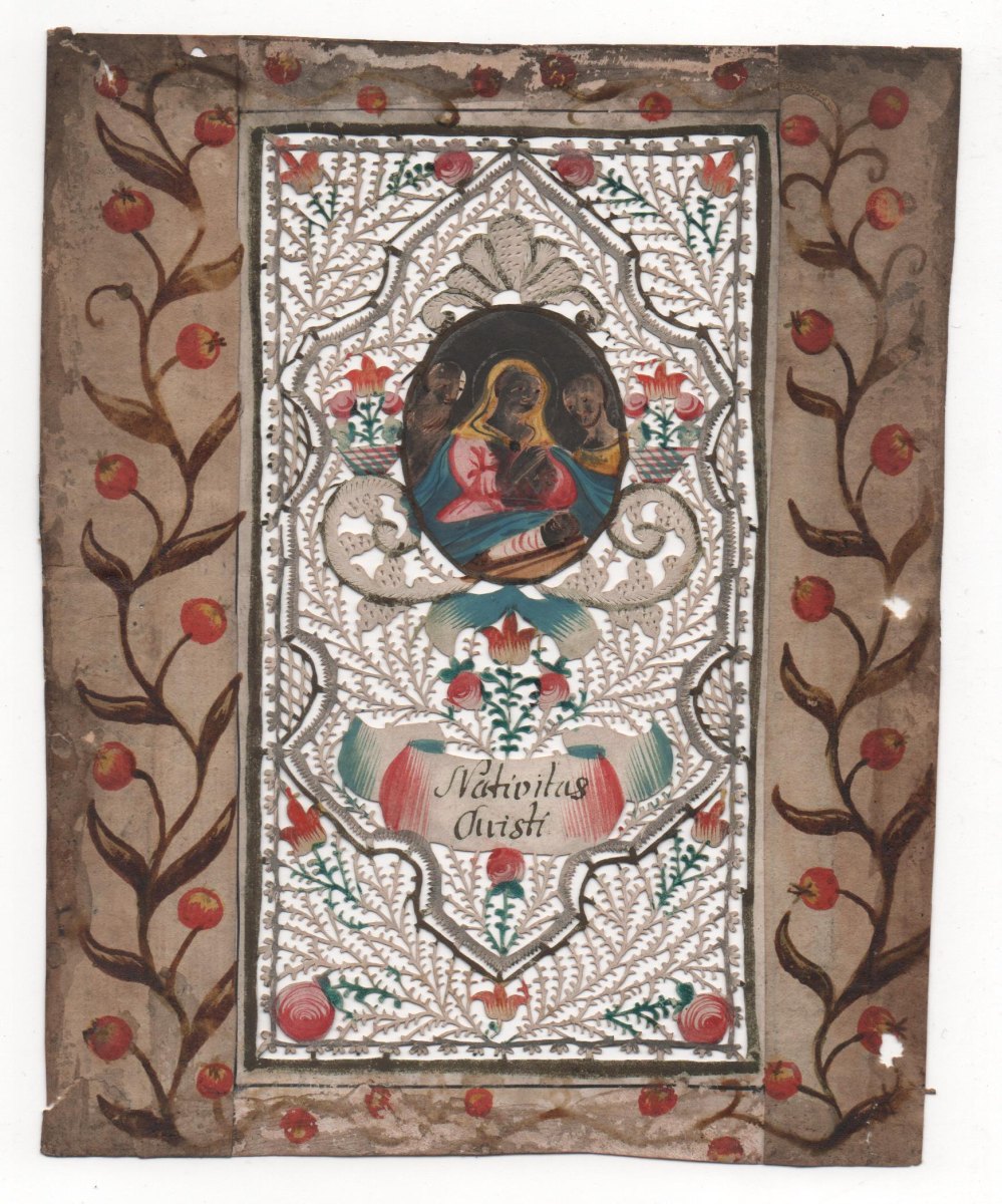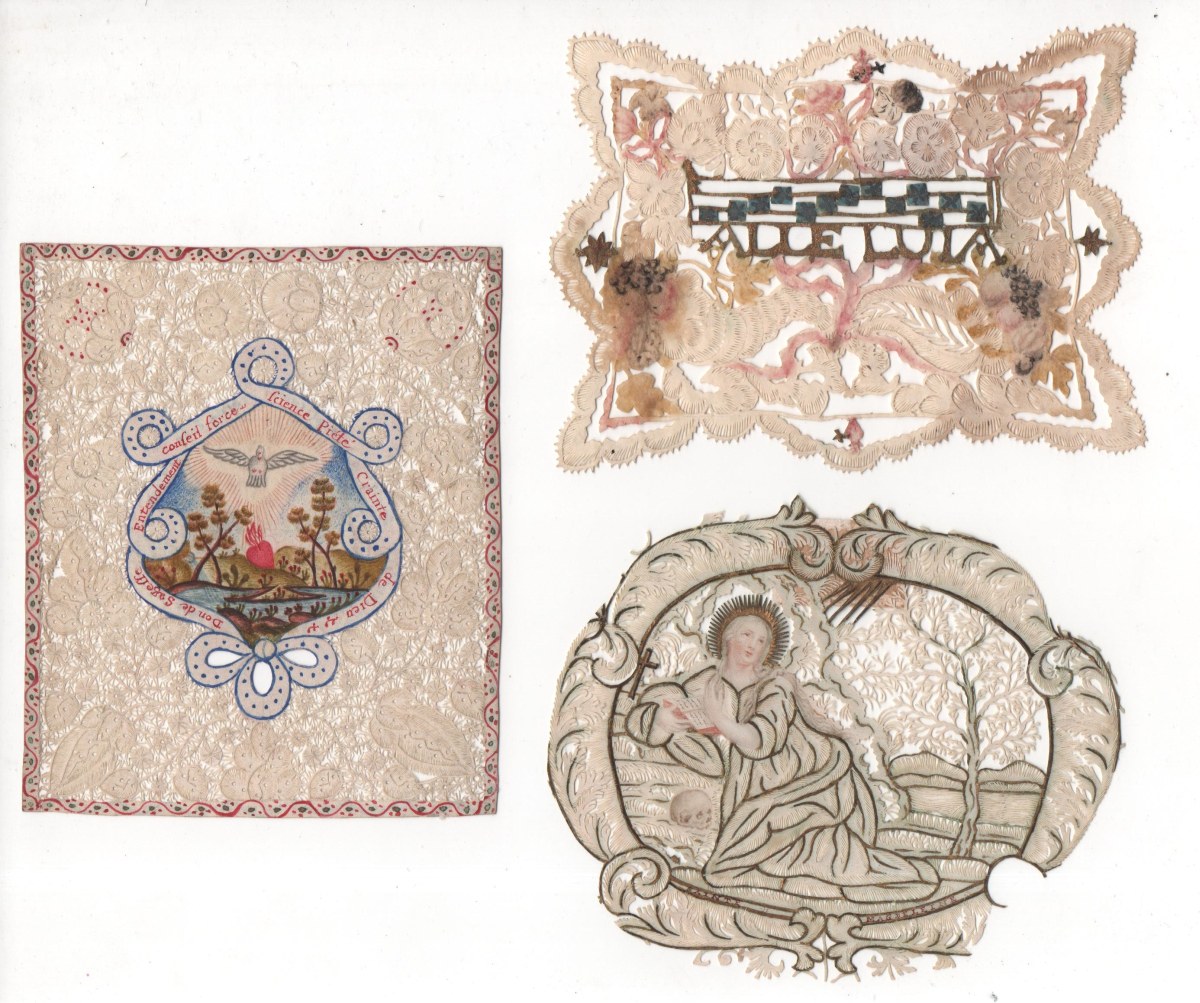 Joint: canivet sur vélin dans un encadrement en papier représentant la Nativité dans un médaillon peint sur fond et personnages noircis, 16,5 x 13 cm, accidents - 4 canivets en mauvais état, contrecollés sur papier épais - 6 canivets sur vélin à découpe ajourée en dentelles ou en réseau de Valenciennes, XIXe siècle, accidents et manques.