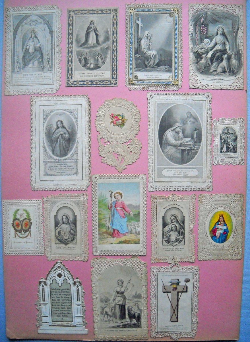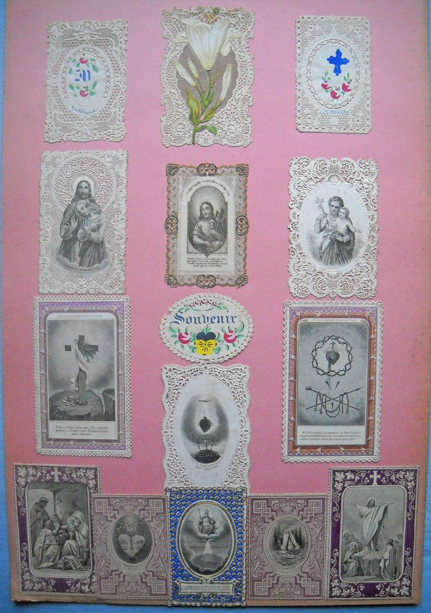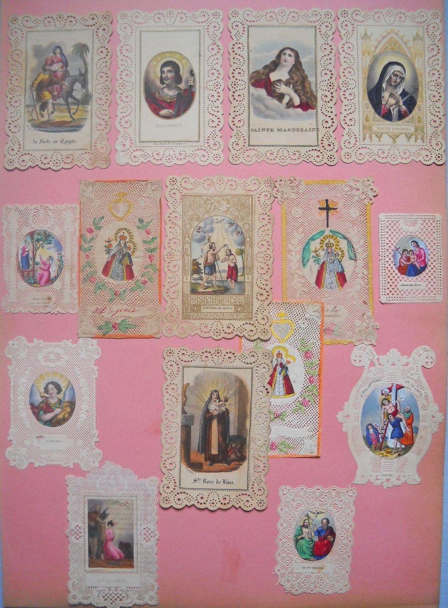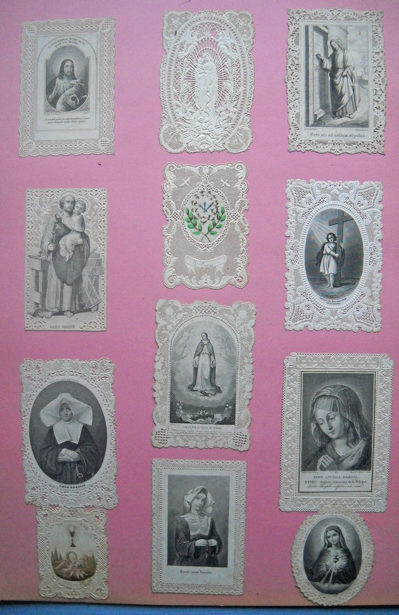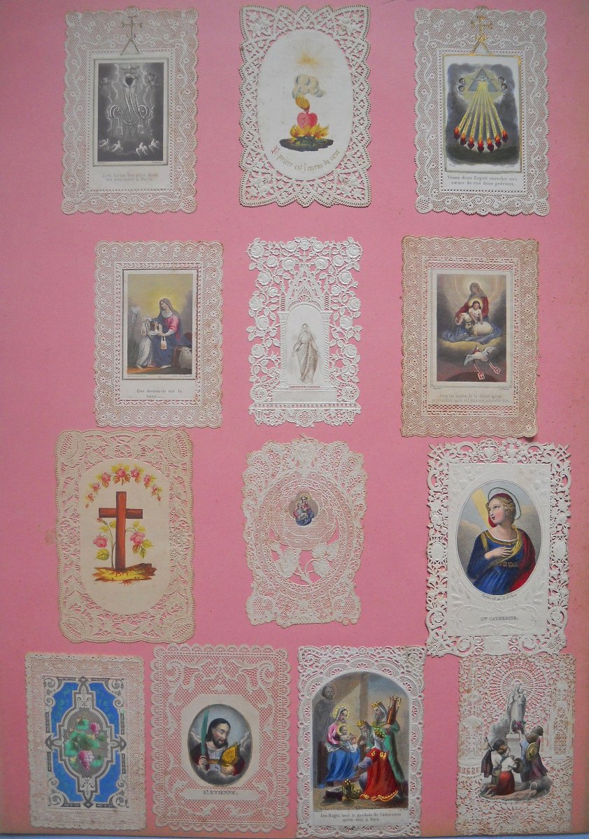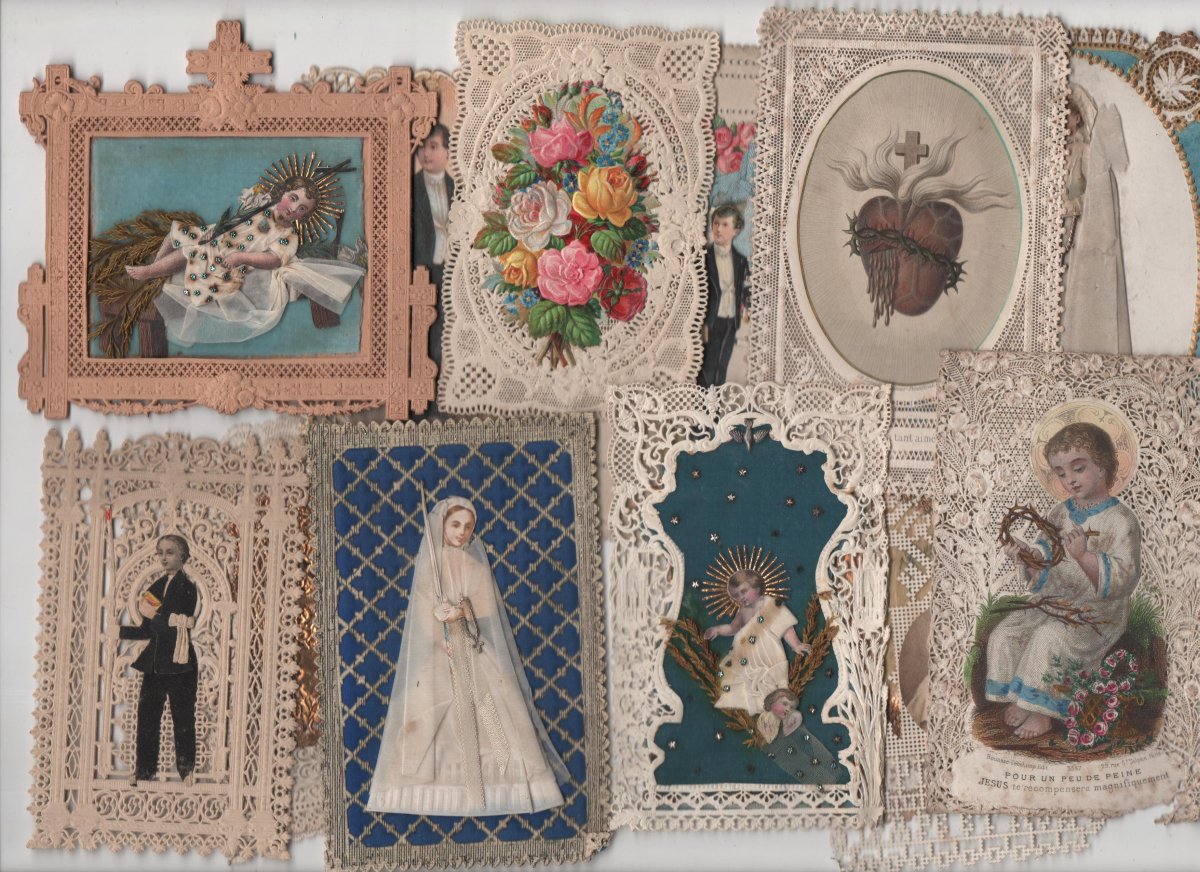 Lot de + de 350 images pieuses à dentelles industrielles, de la 1ère moitié du XIXe jusqu'au début du XXe siècle, dont une partie contrecollée sur papier épais. Formats divers.