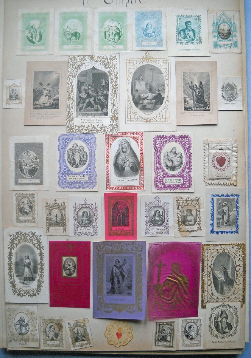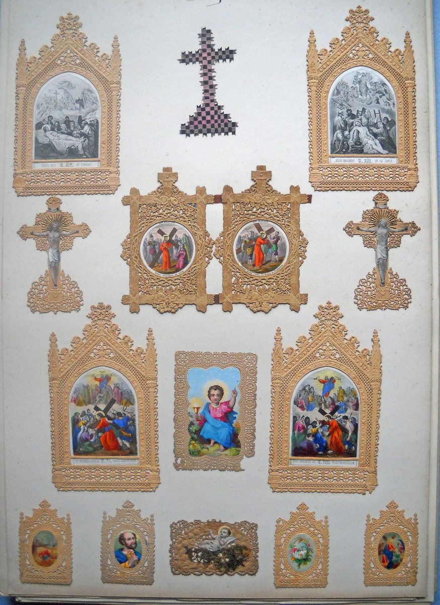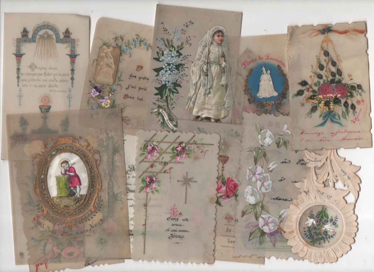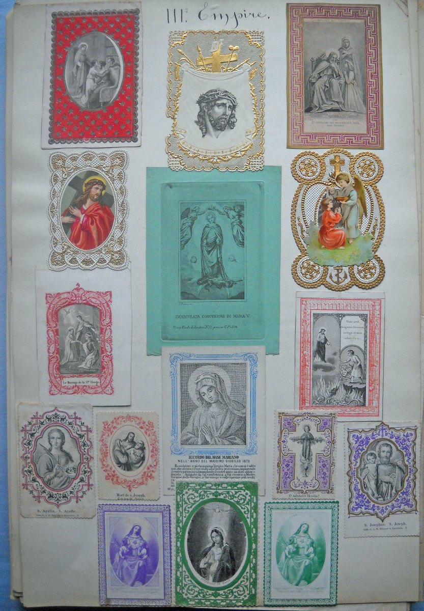 Lot de + de 730 images pieuses: gravures en taille douce, dentelles mécaniques, chromolithographies, gravures sur tissu, images à système, cachets de communion, images sur gélatine ou " Rhodoïd ", etc. Tous formats. Une partie contrecollée sur papier épais. À découvrir.