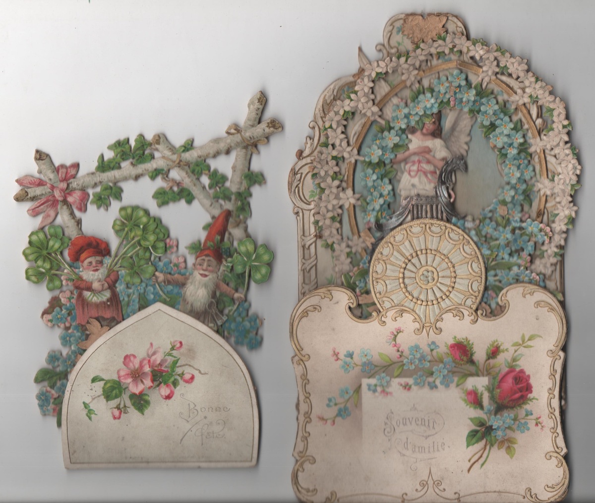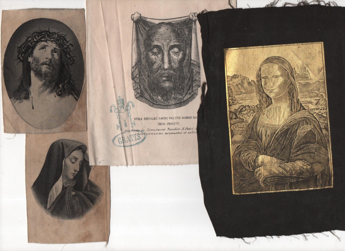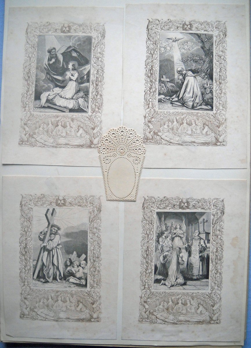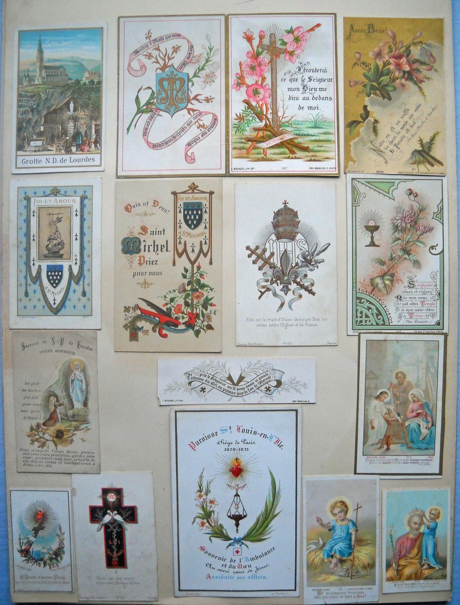 Lot de + de 730 images pieuses: gravures en taille douce, dentelles mécaniques, chromolithographies, gravures sur tissu, images à système, cachets de communion, images sur gélatine ou " Rhodoïd ", etc. Tous formats. Une partie contrecollée sur papier épais. À découvrir.