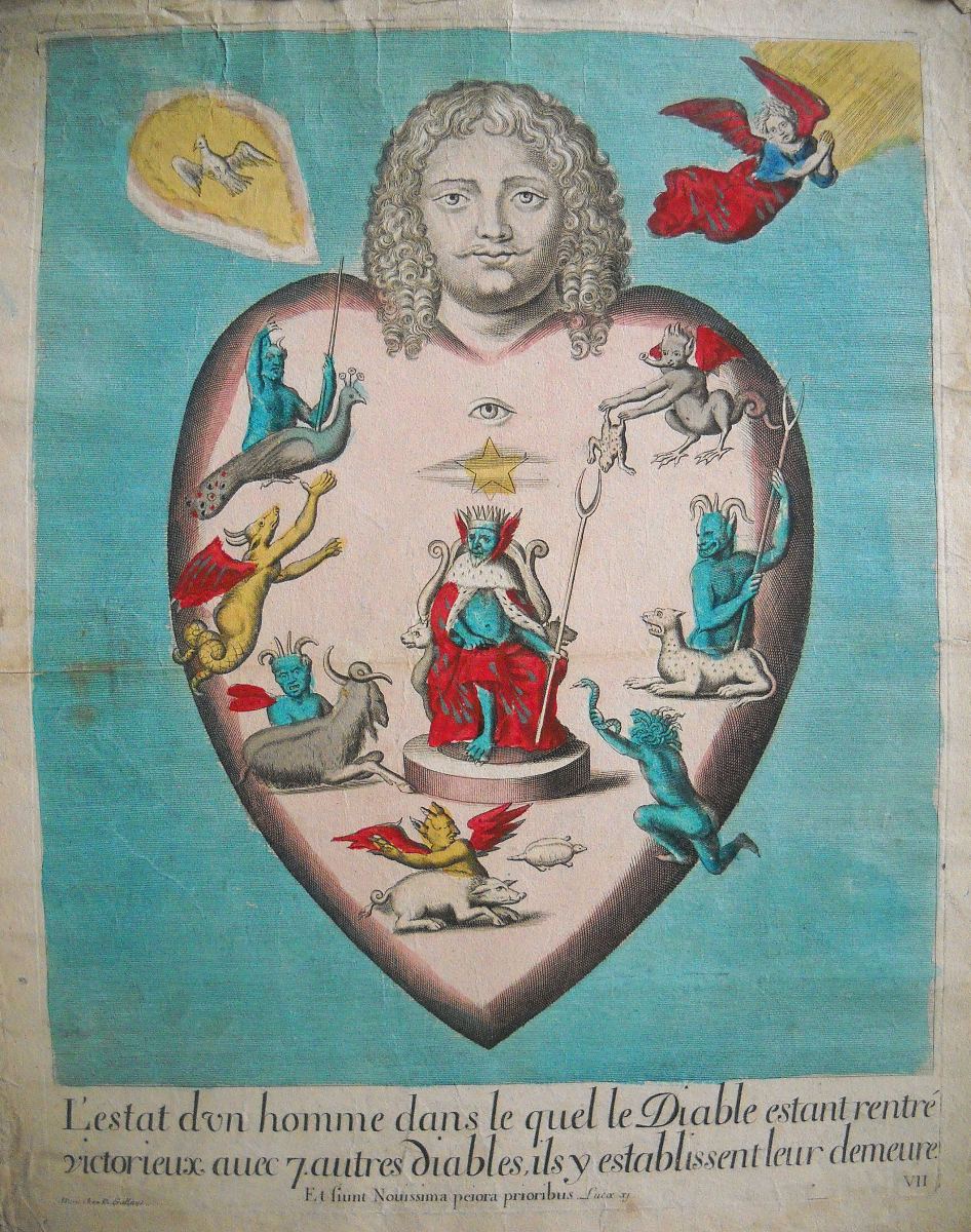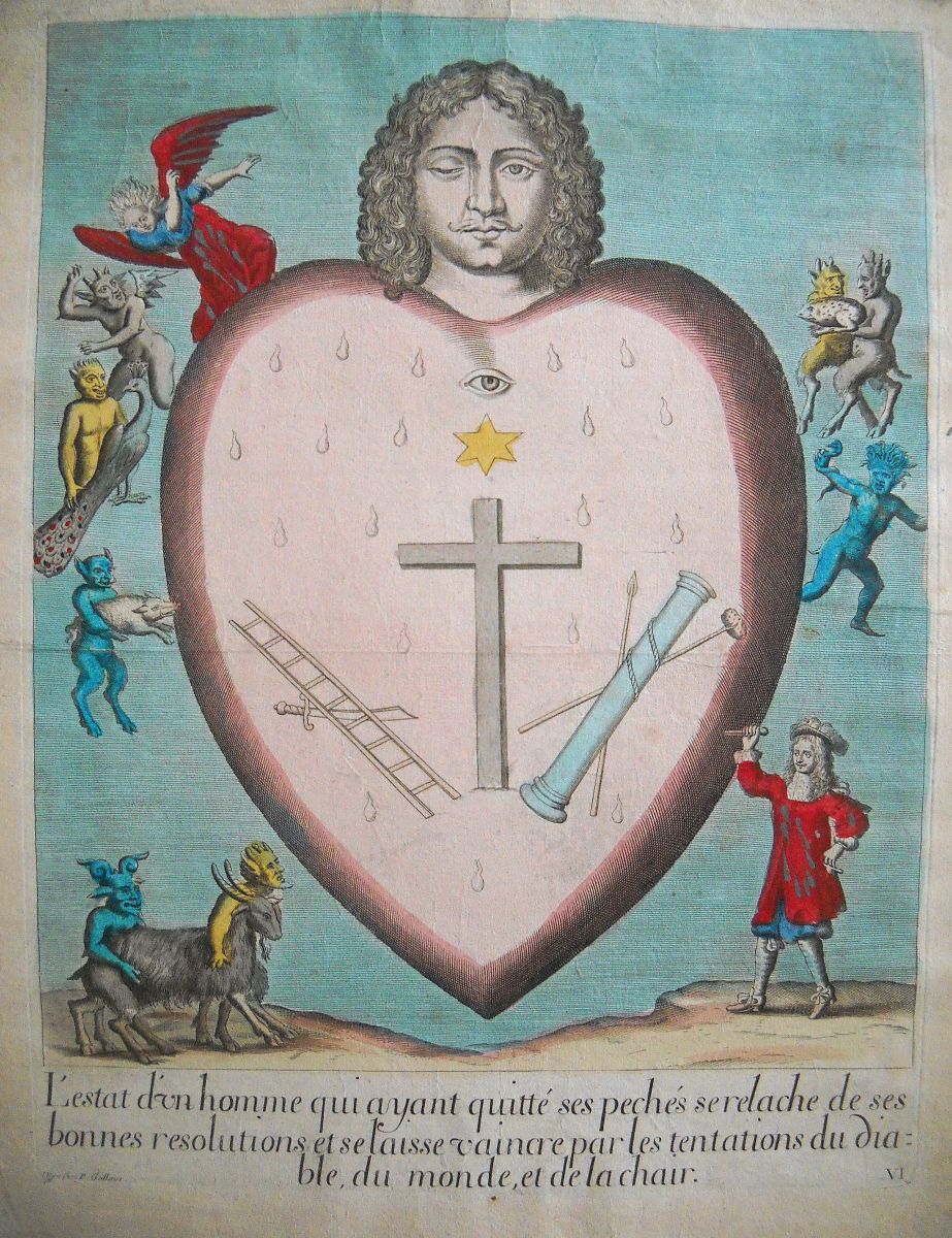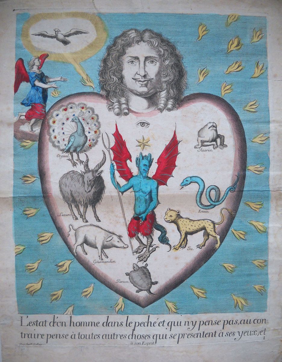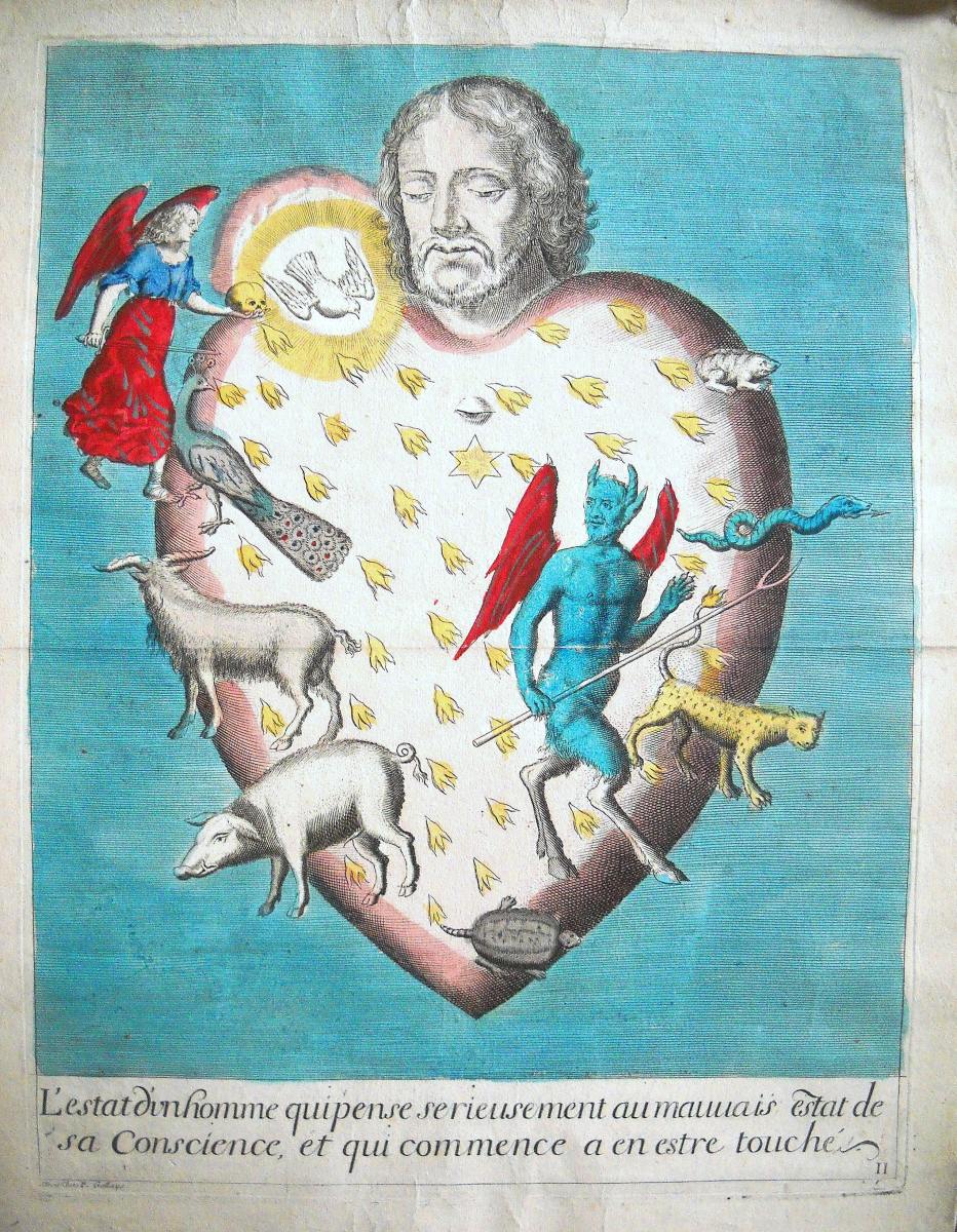 6 épreuves sur papier vergé gravées en taille-douce et rehaussées de coloris d'époque, signées en bas à gauche, A Paris, chez P. Gallays [actif de la du fin XVIIe siècle à 1749]: " l'estat d'un homme dans le peché et qui ny pense pas, au contraire pense à toutes autres choses qui se presentent à ses yeux à son esprit " pl. num. I ; " l'estat d'un homme qui pense serieusement au mauvais estat de sa conscience, et qui commence a en estre touché " pl. num. II ; " l'estat d'un homme vivement penetré du regret de ses pechés et de douleur d'avoir offence Dieu " pl. num. III ; " l'estat d'un homme qui faict penitence et qui en pratique les uvres qui sont les prieres, les aumones et les jeunes " pl. num. IV ; " l'estat d'un homme qui ayant quitté ses pechés se relache de ses bonnes resolutions et se laisse vaincre par les tentations du diable, du monde, et de la chair " pl. num. VI ; " l'estat d'un homme dans lequel le diable estant rentré victorieux avec 7 autres diables, ils y establissent leur demeure " pl. num. VII. 69 x 50 cm. Bon état (manque pl. V). Quelques froissures, traces de plis et mouillures. Très rare.