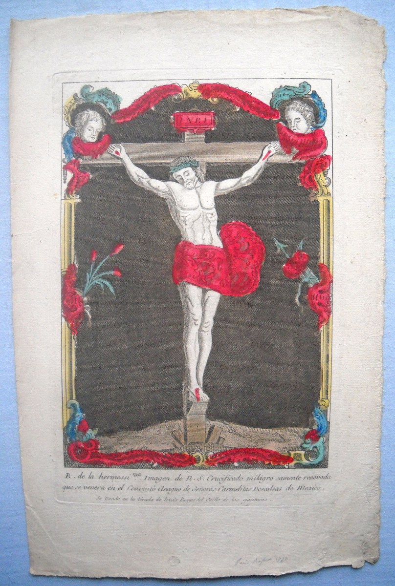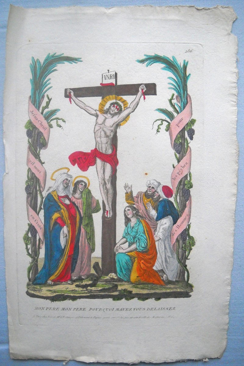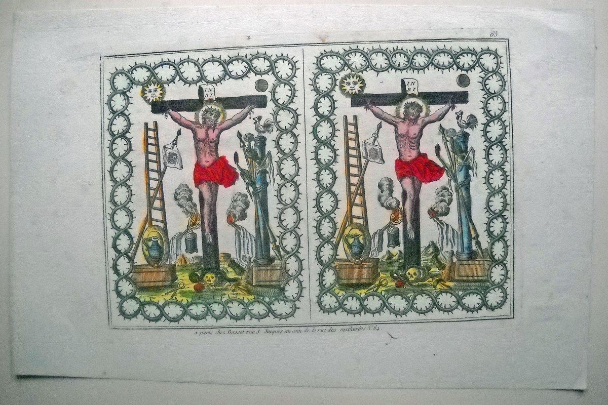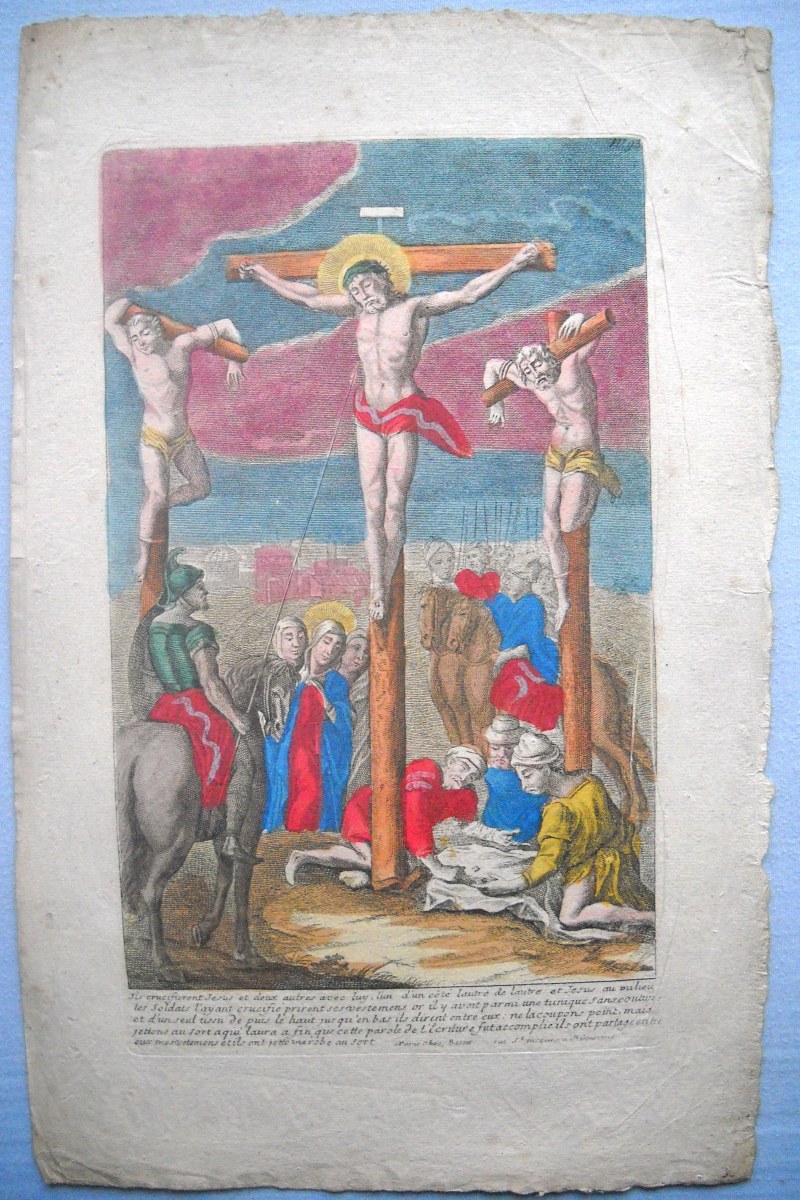 13 estampes gravées en taille-douce sur papier vergé et rehaussées de coloris d'époque, ayant pour thème principal la Crucifixion, 42 x 27 cm.