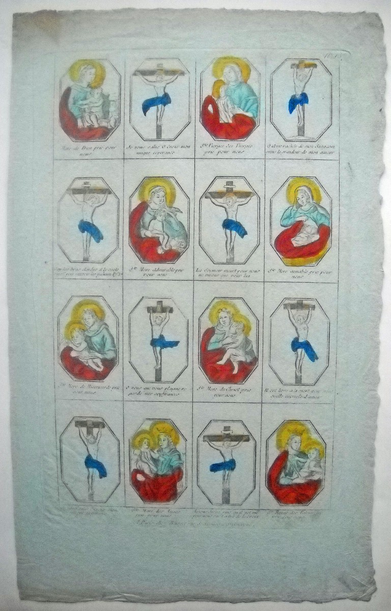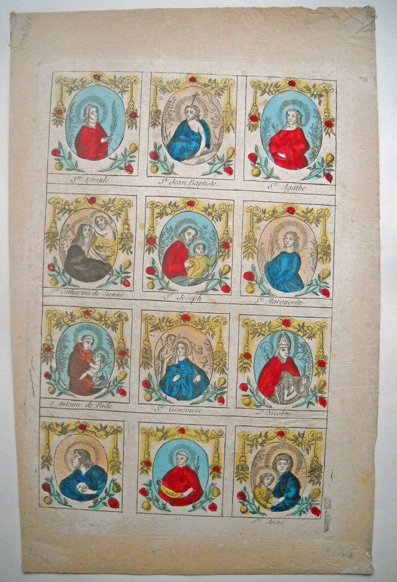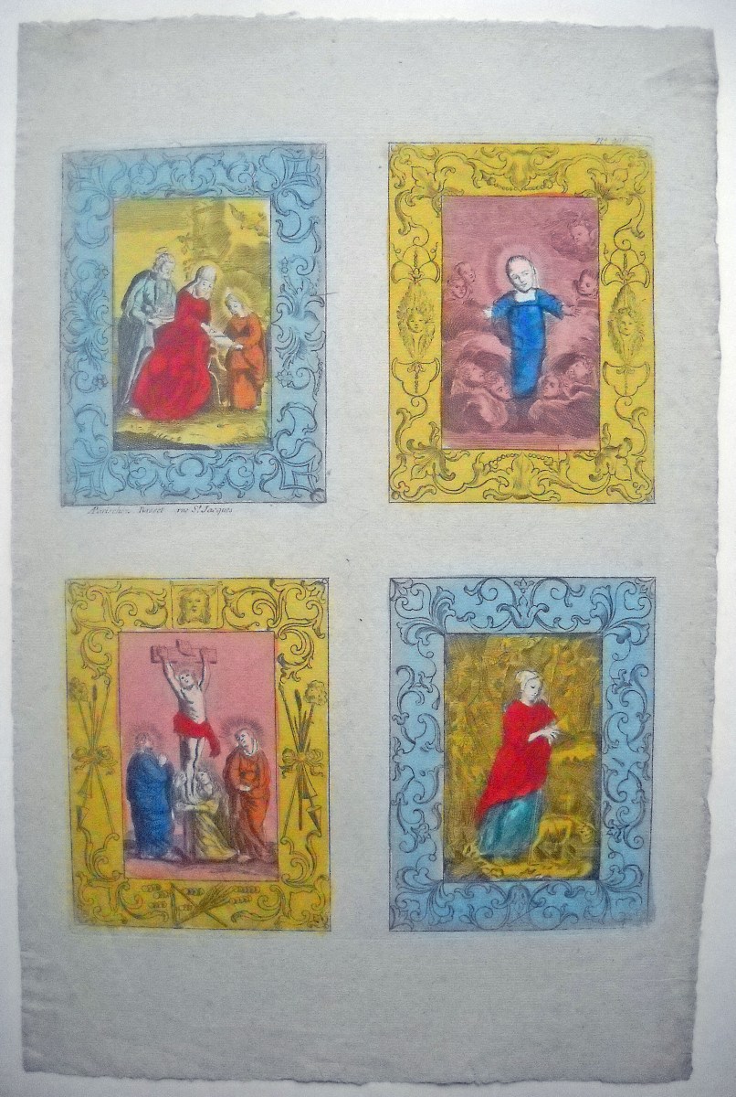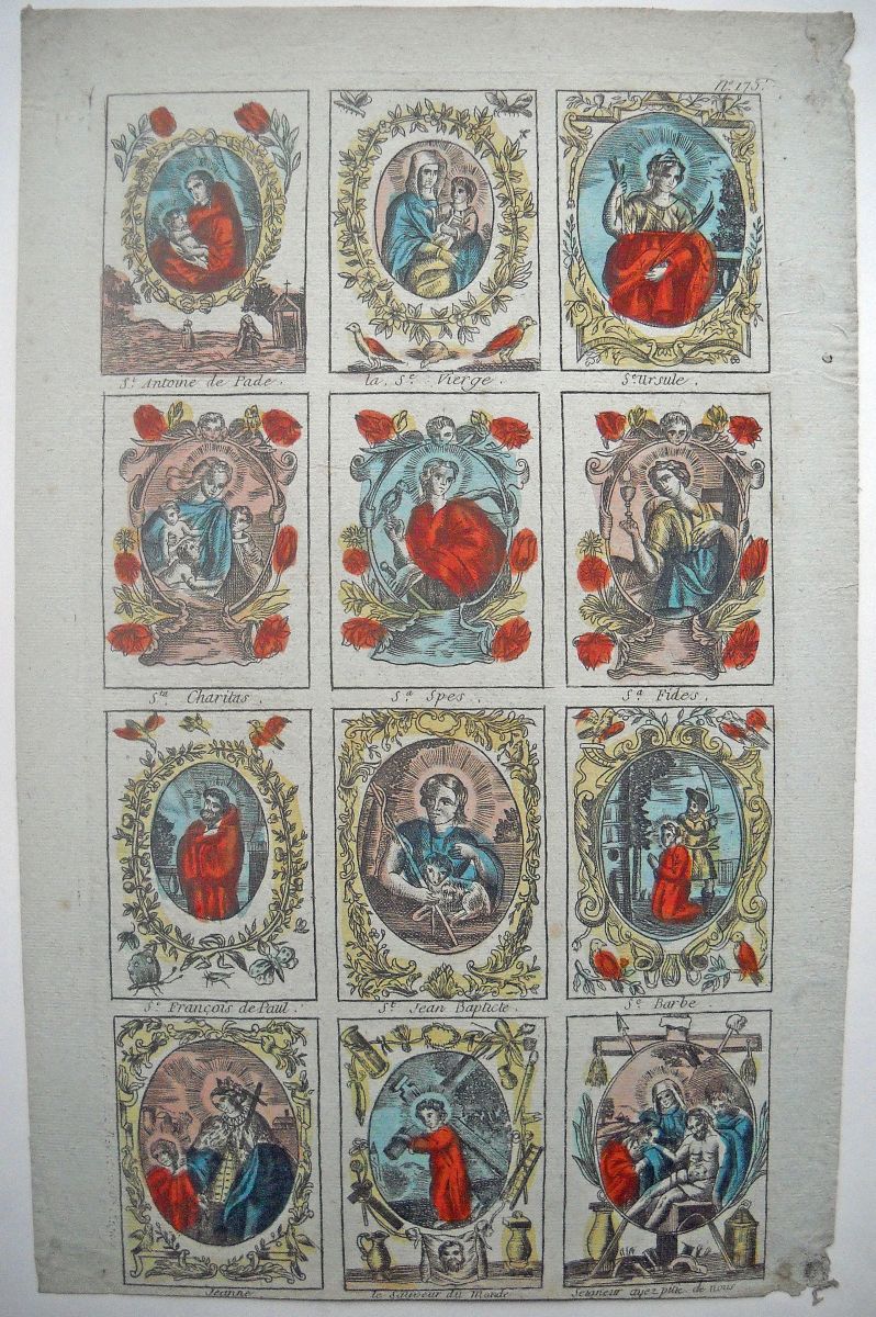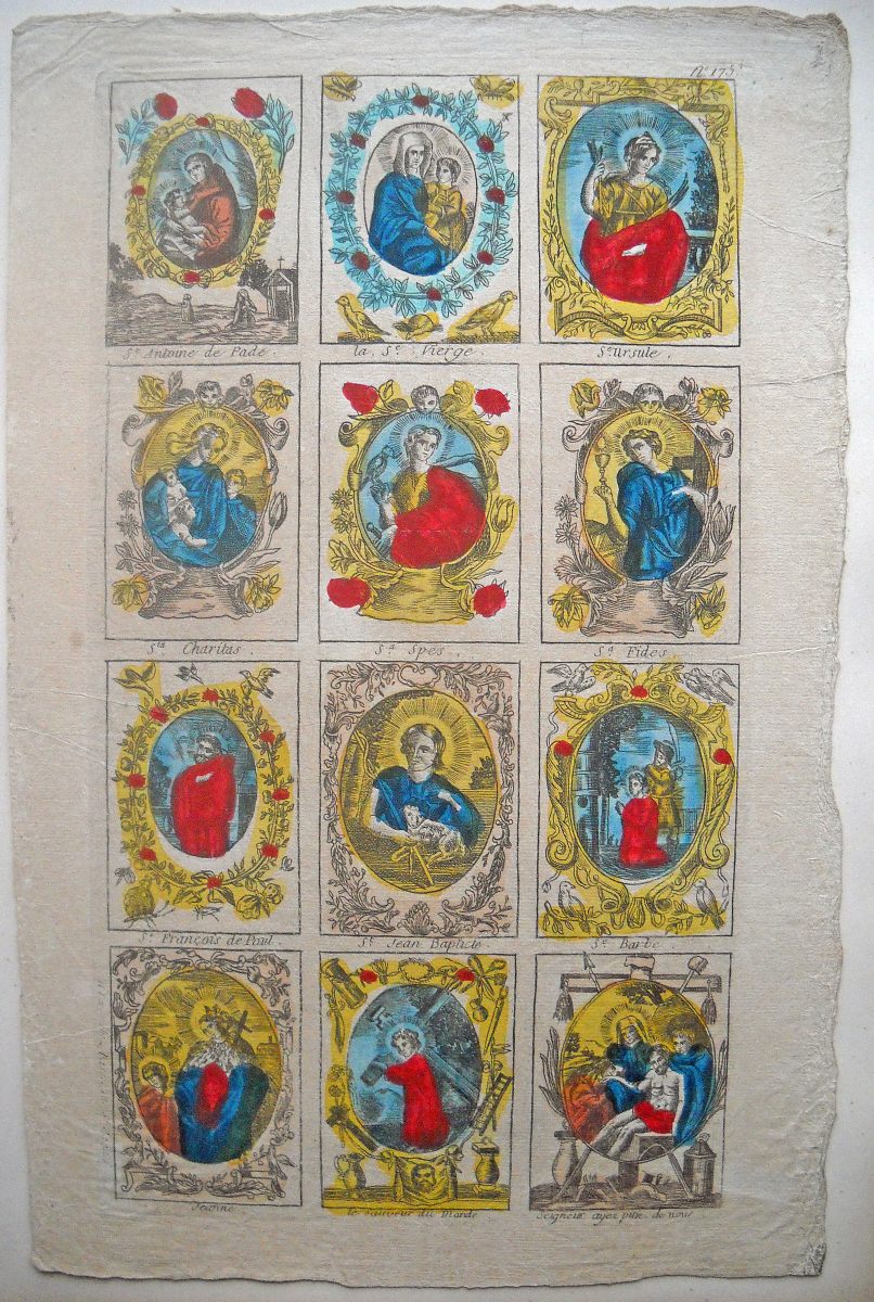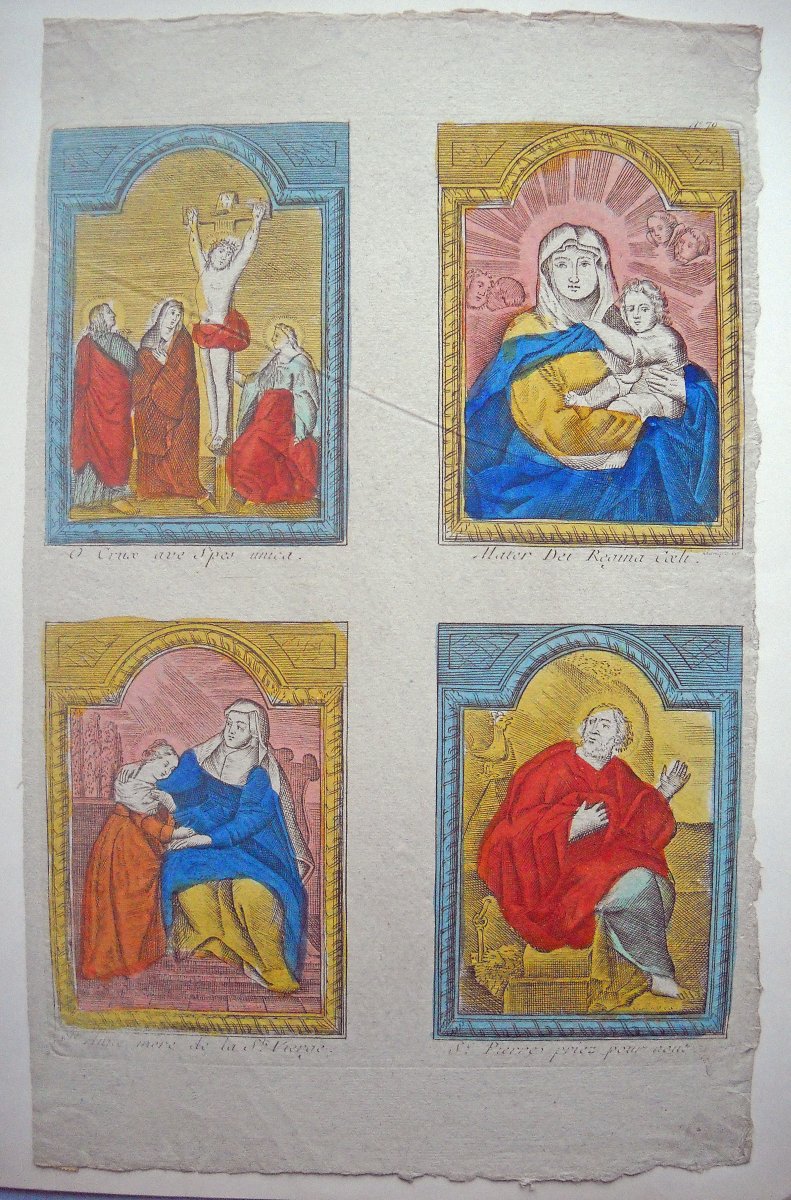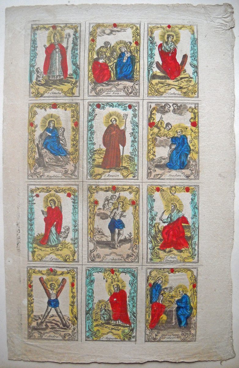 Réunion de 37 planches à compartiments d'images religieuses gravées en taille-douce en majorité sur papier vergé et la plupart rehaussées au coloris d'époque: planches de saintetés, personnages et scènes bibliques. Certaines planches contrecollées sur papier épais. Env. 42 x 27 cm.