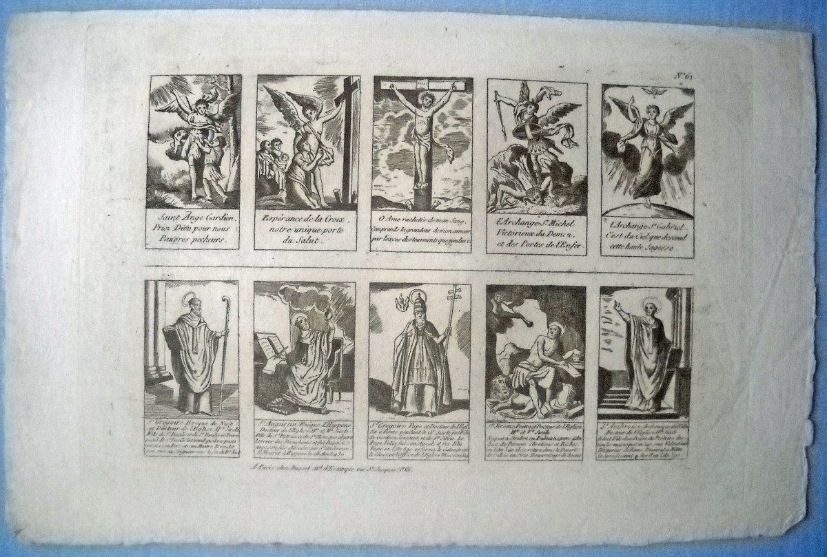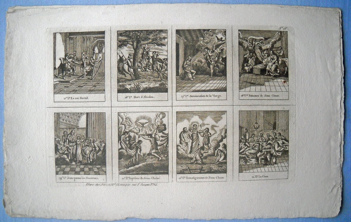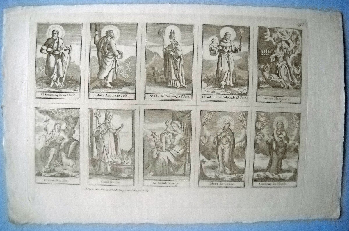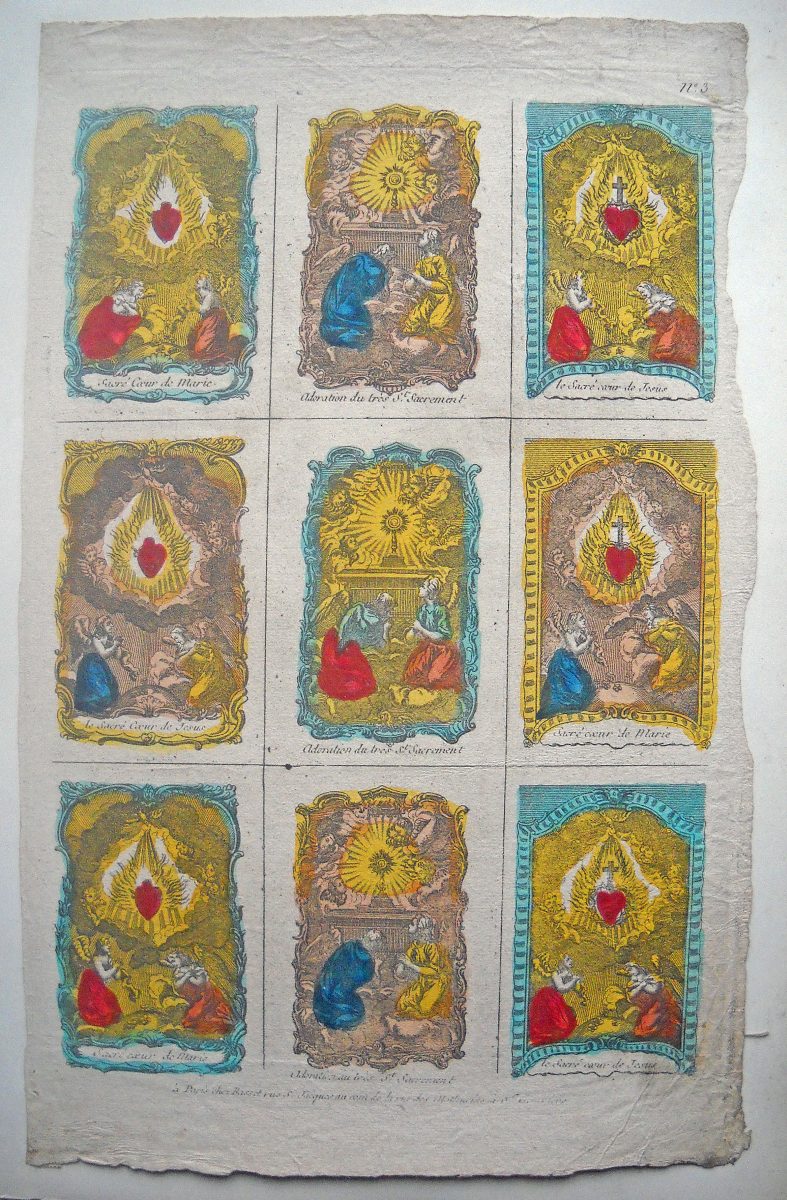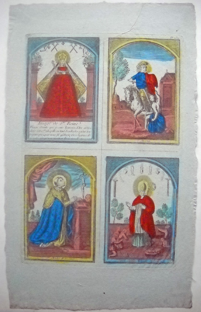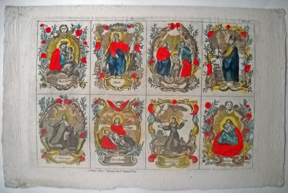 Réunion de 37 planches à compartiments d'images religieuses gravées en taille-douce en majorité sur papier vergé et la plupart rehaussées au coloris d'époque: planches de saintetés, personnages et scènes bibliques. Certaines planches contrecollées sur papier épais. Env. 42 x 27 cm.
