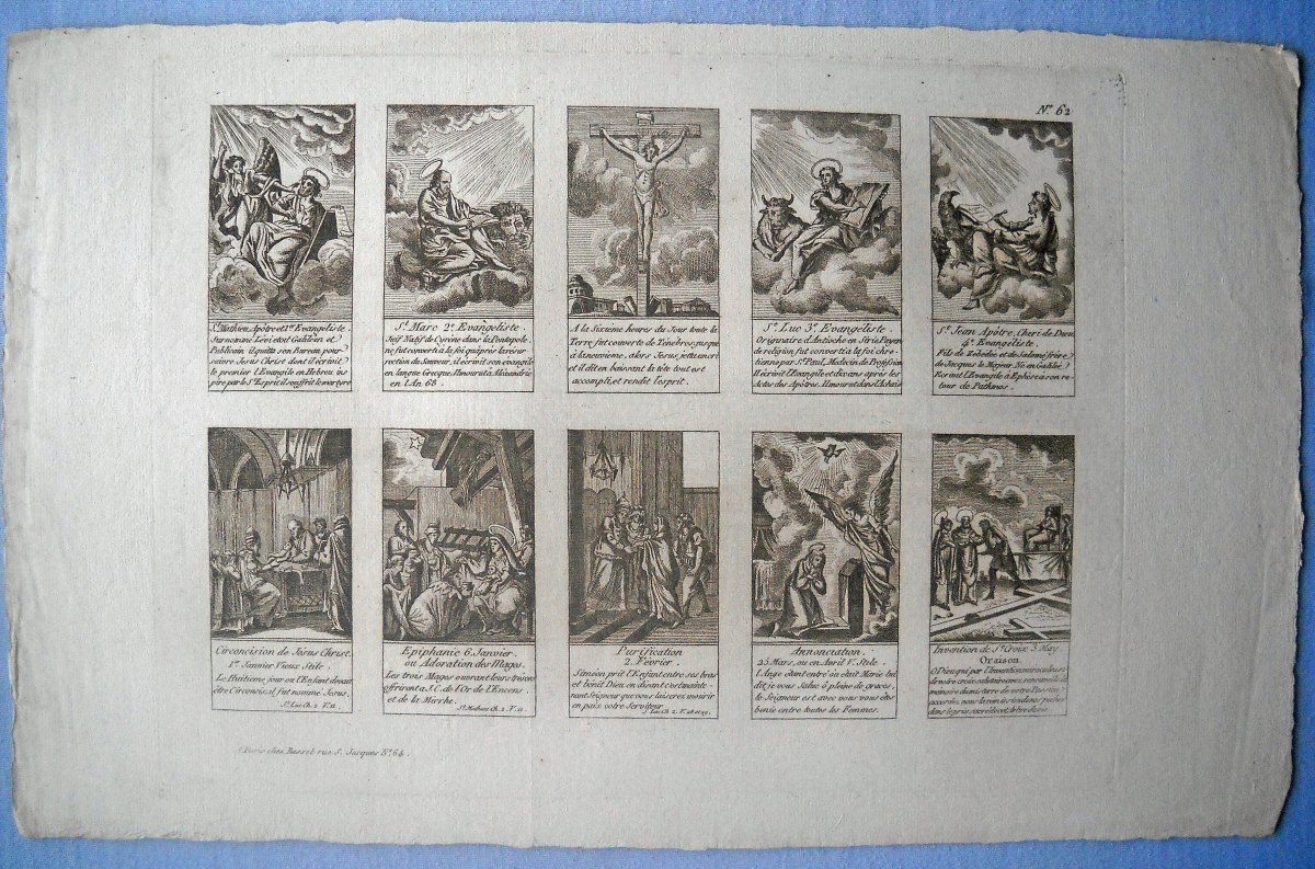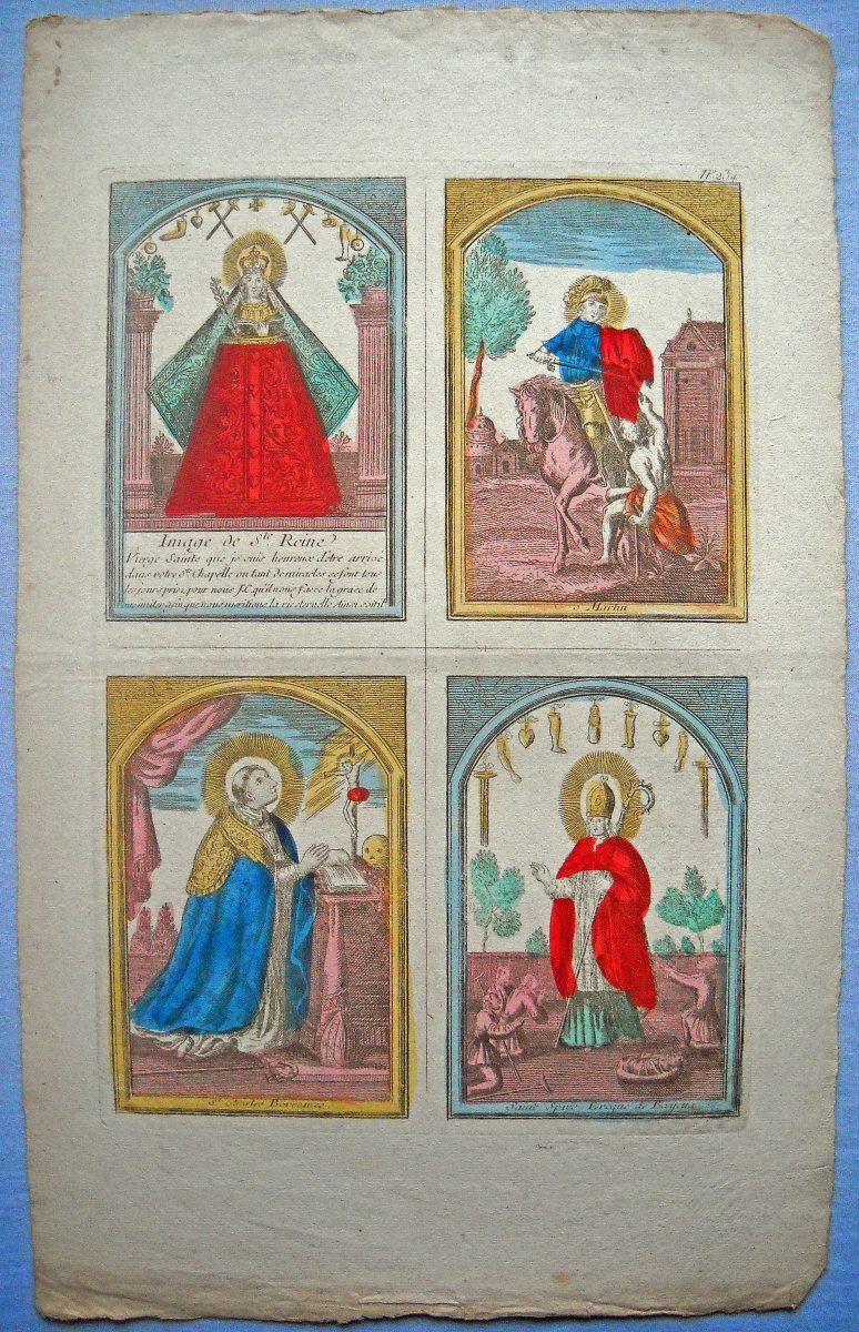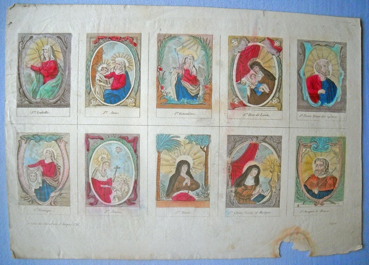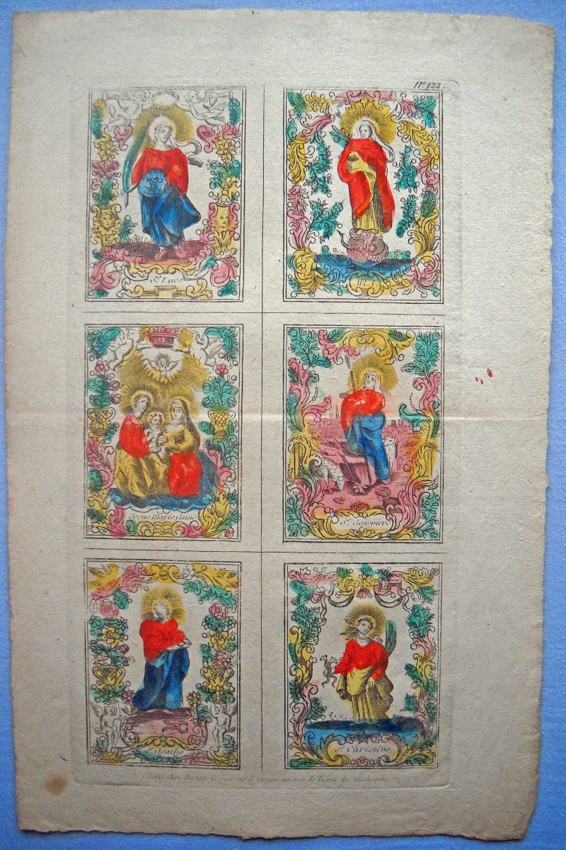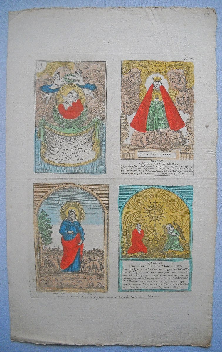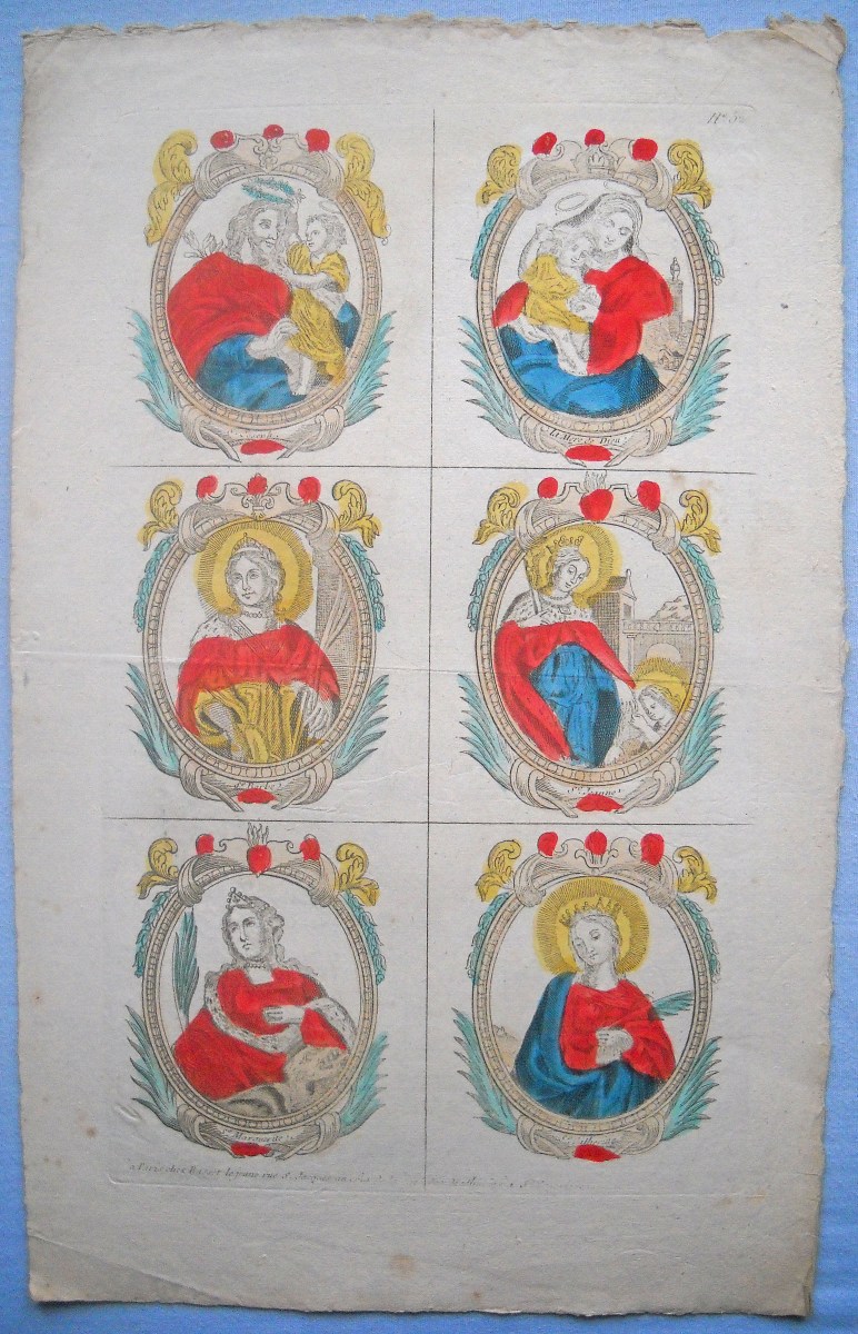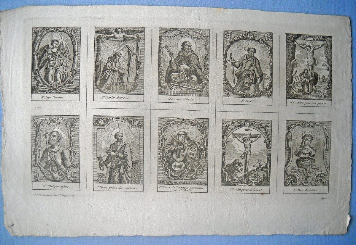 Réunion de 37 planches à compartiments d'images religieuses gravées en taille-douce en majorité sur papier vergé et la plupart rehaussées au coloris d'époque: planches de saintetés, personnages et scènes bibliques. Certaines planches contrecollées sur papier épais. Env. 42 x 27 cm.