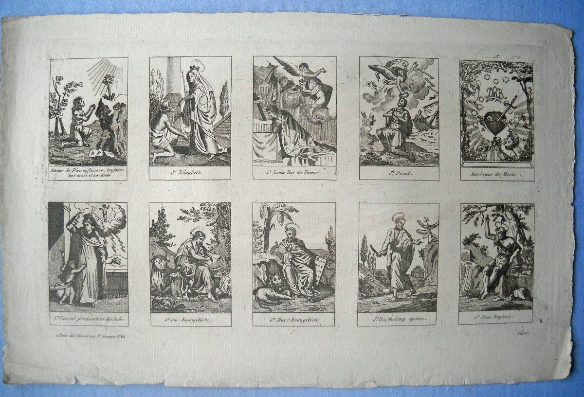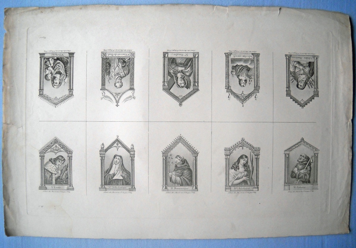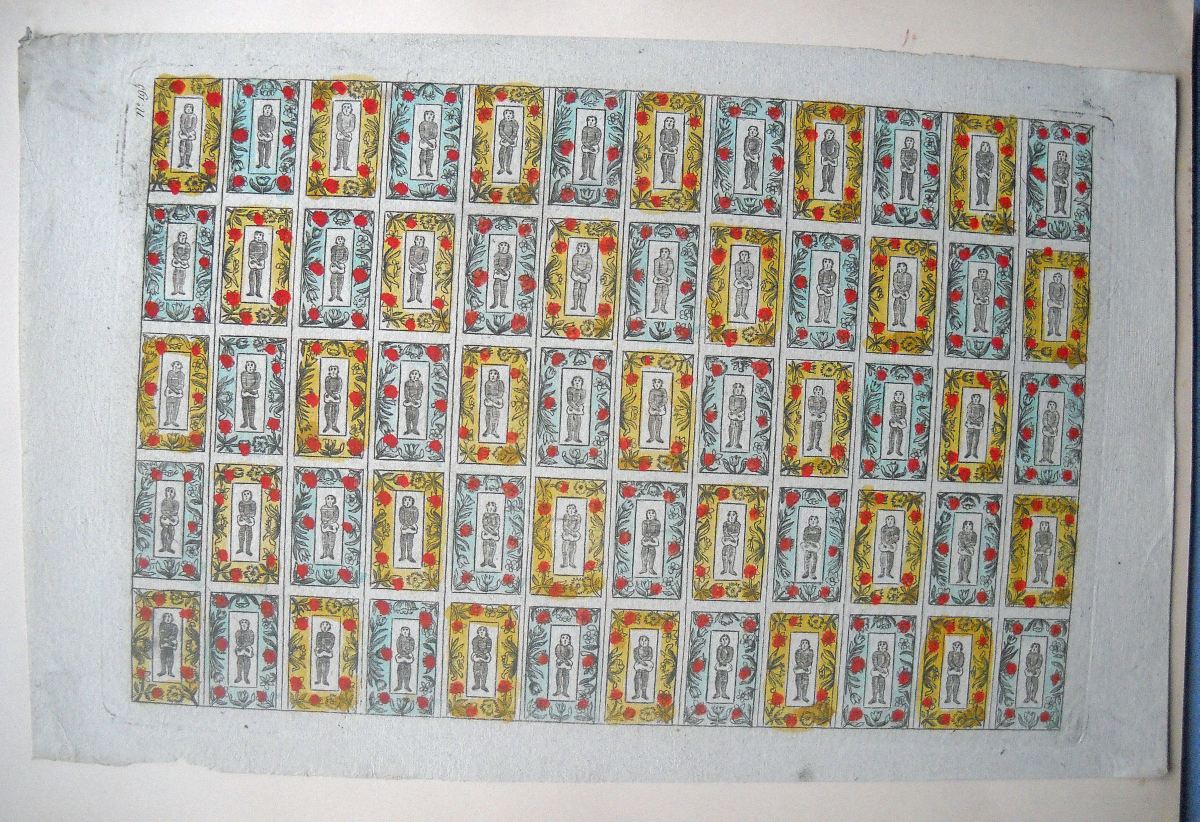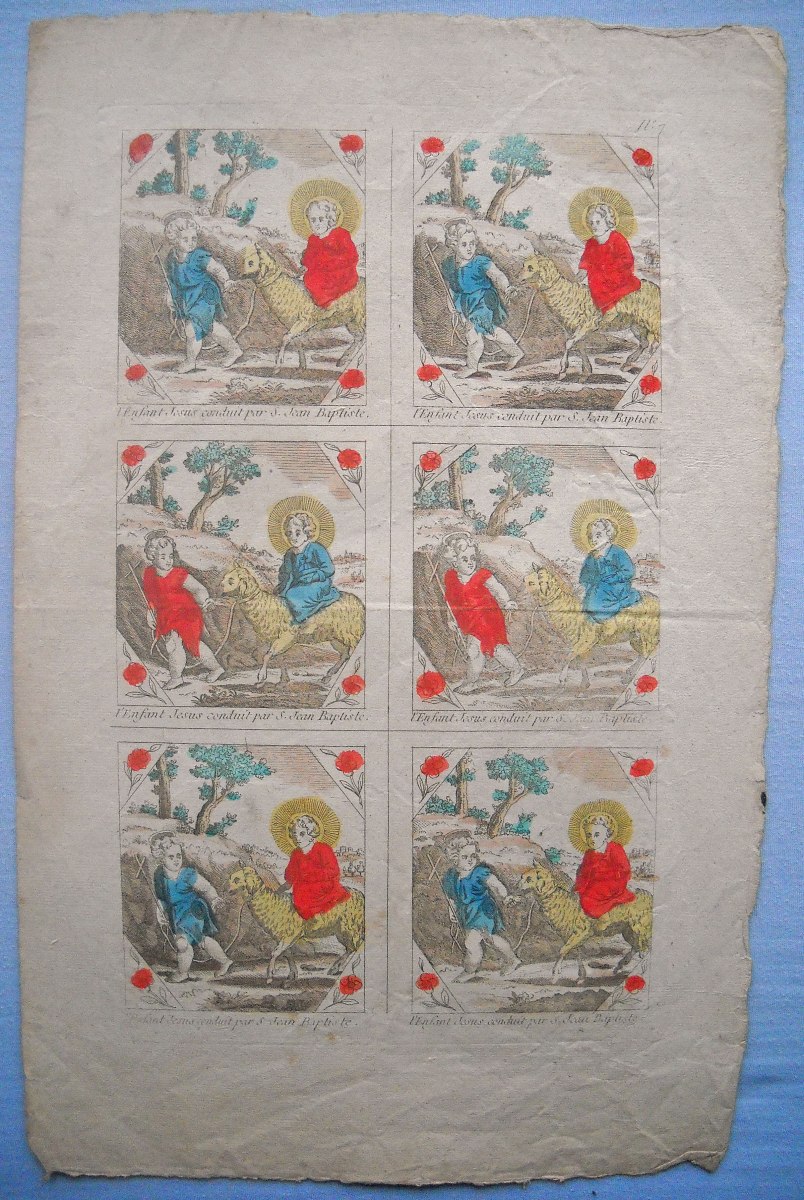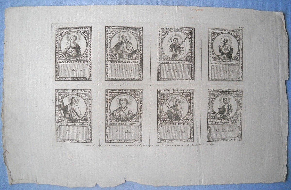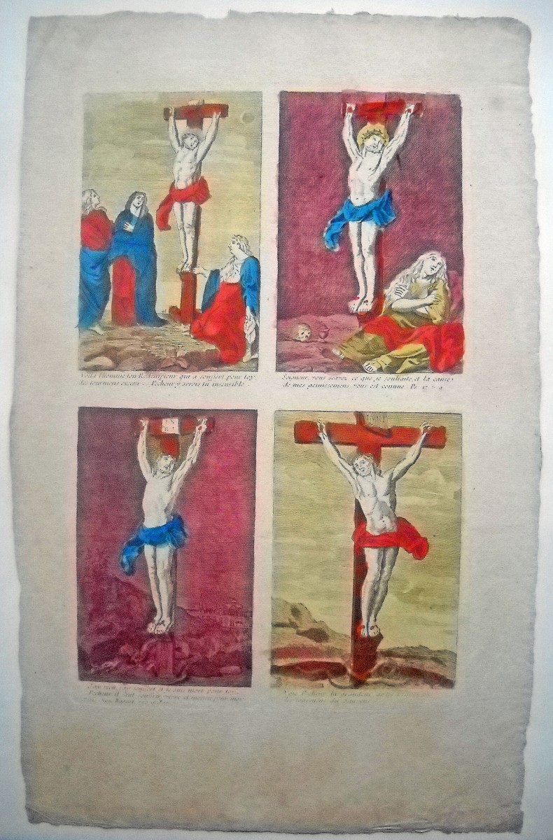 Réunion de 37 planches à compartiments d'images religieuses gravées en taille-douce en majorité sur papier vergé et la plupart rehaussées au coloris d'époque: planches de saintetés, personnages et scènes bibliques. Certaines planches contrecollées sur papier épais. Env. 42 x 27 cm.