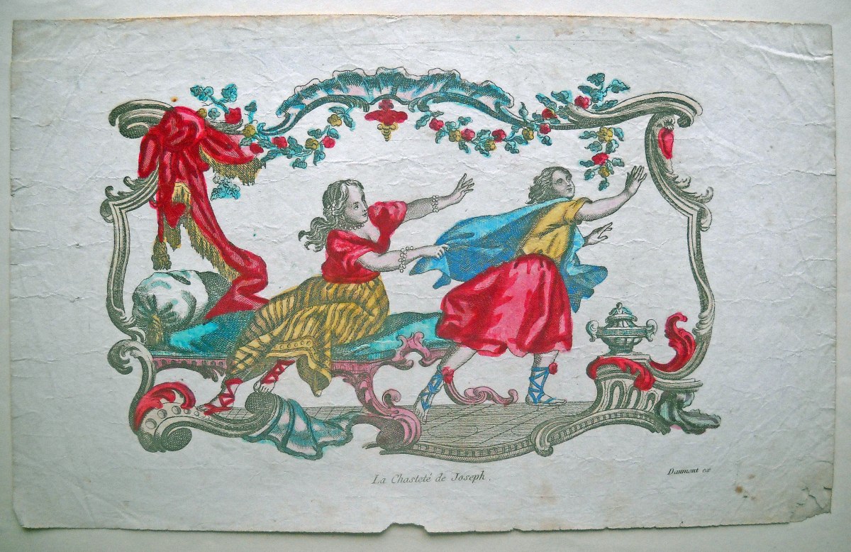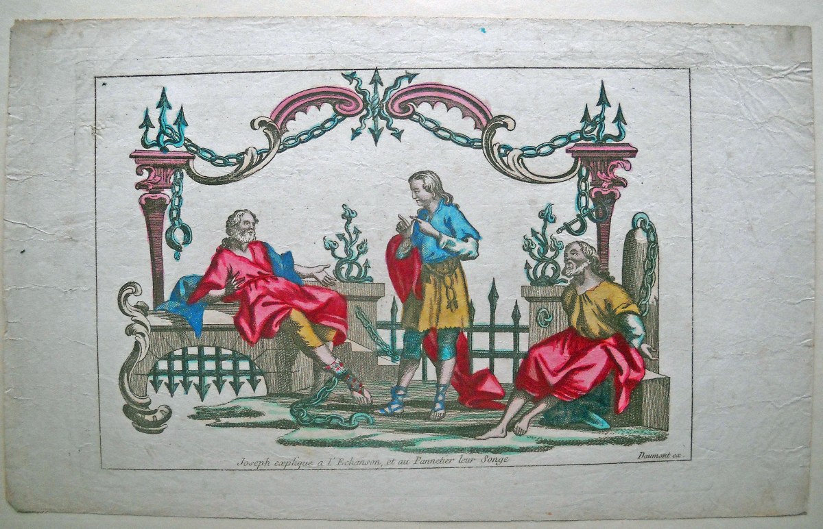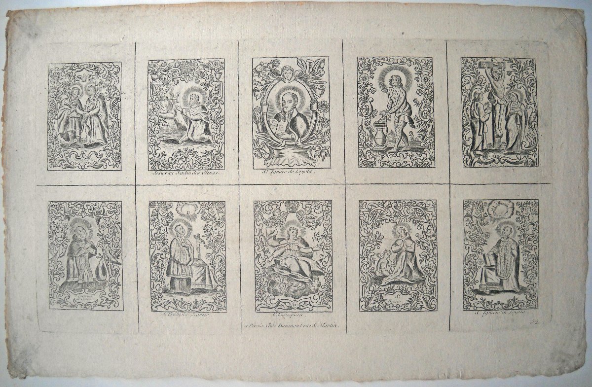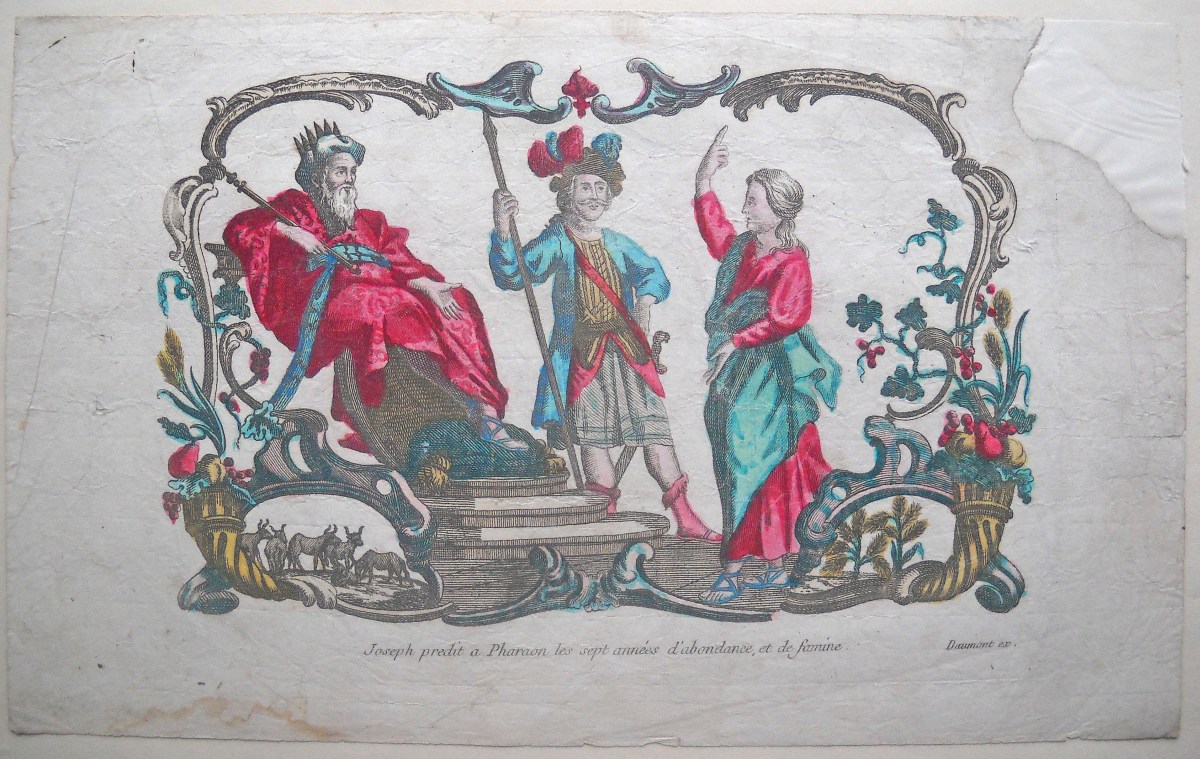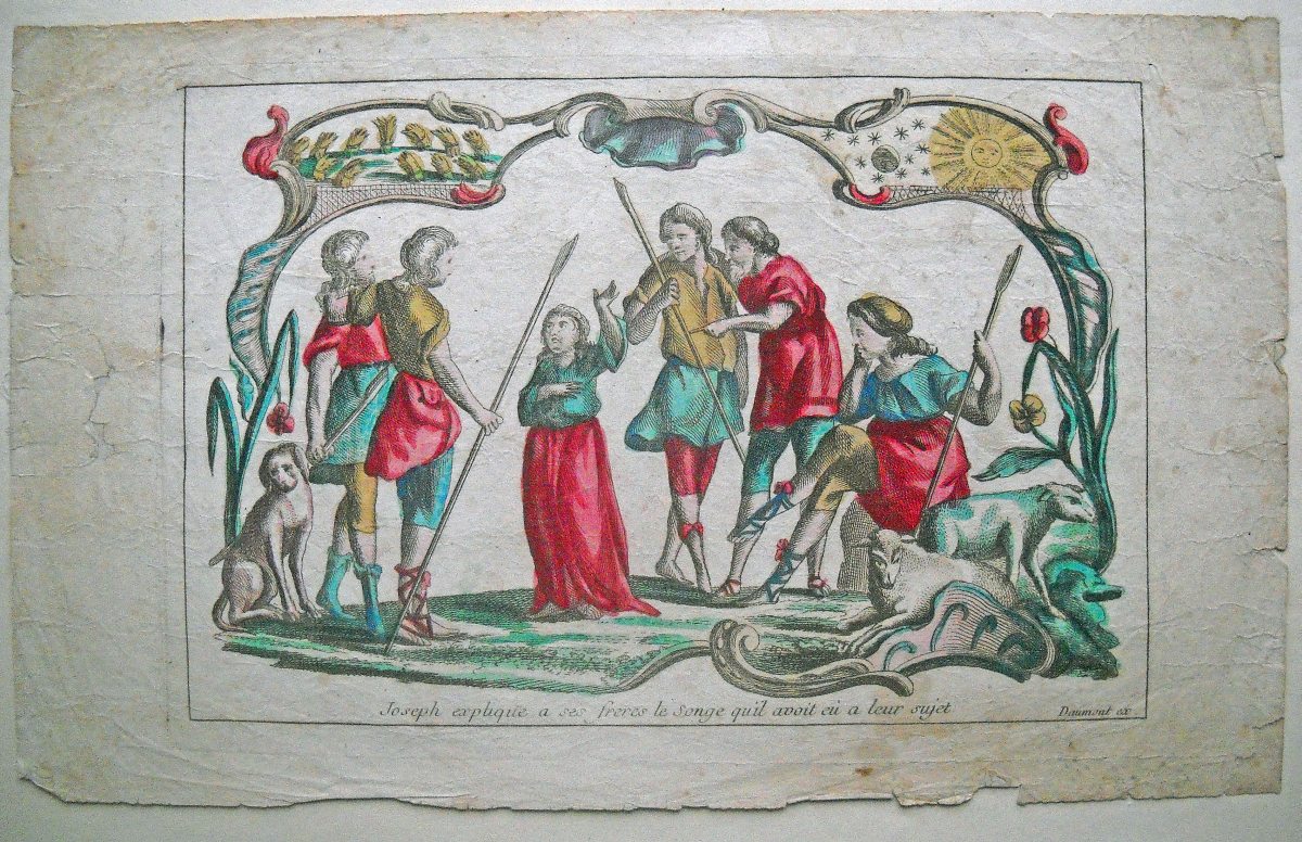 8 estampes gravées en taille-douce sur papier vergé, contrecollées sur papier épais, dont: 4 p. rehaussées de coloris d'époque intitulées La chasteté de Joseph, Joseph prédit à Pharaon les sept années d'abondance et de famine, Joseph explique à l'Echanson et pannetier leur songe, Joseph explique à ses frères le songe qu'il avait eu à leur sujet, 20 32 cm, accidents et restaurations - 3 planches à compartiments de saintetés, 42 x 26 cm et 26 x 42 cm - Ste Thérèse de Jesus d'après Lebrun gravé par Gissey, 28 x 22 cm.