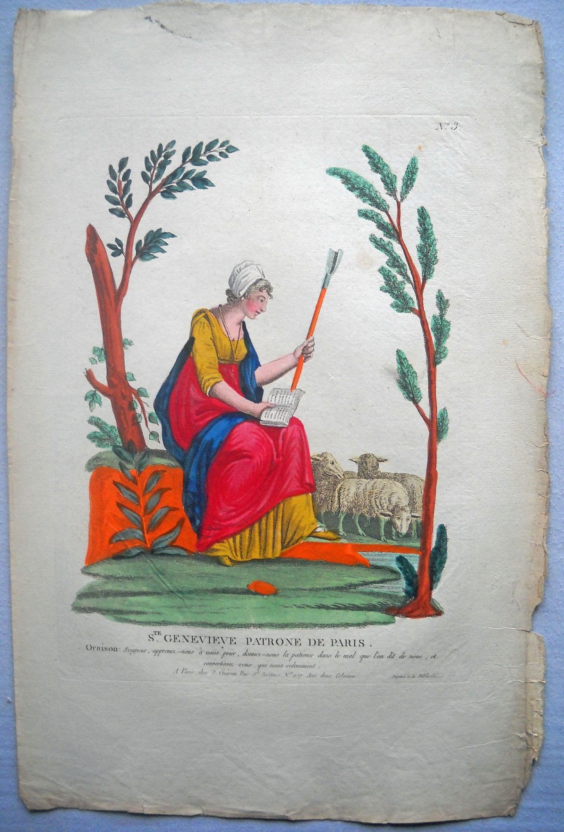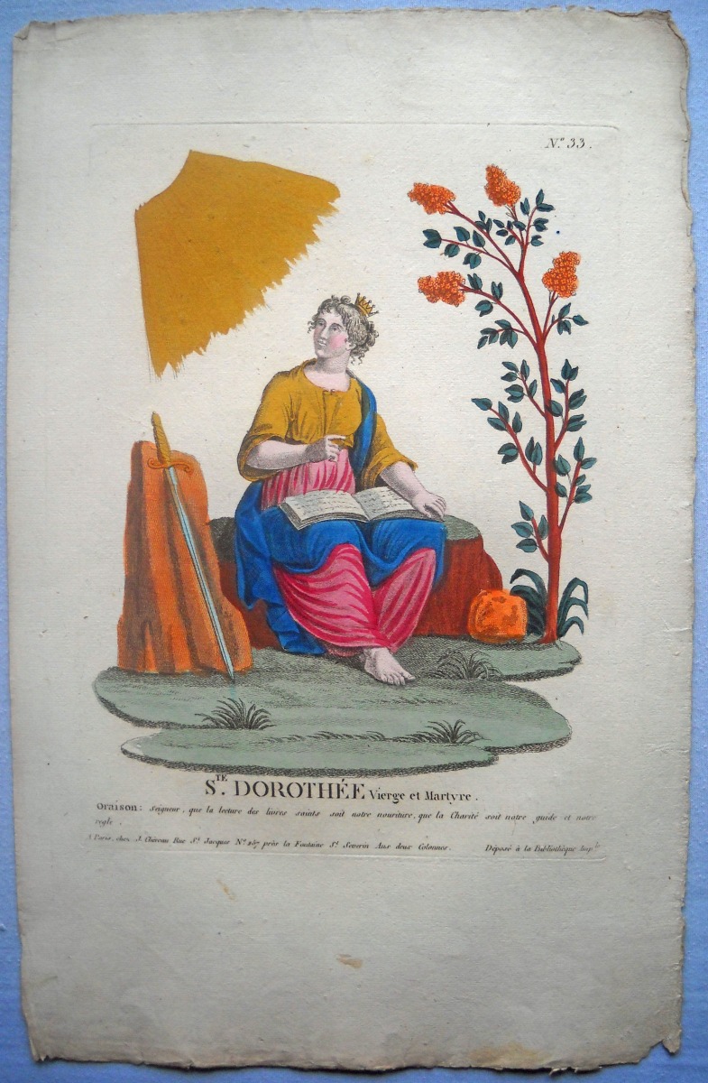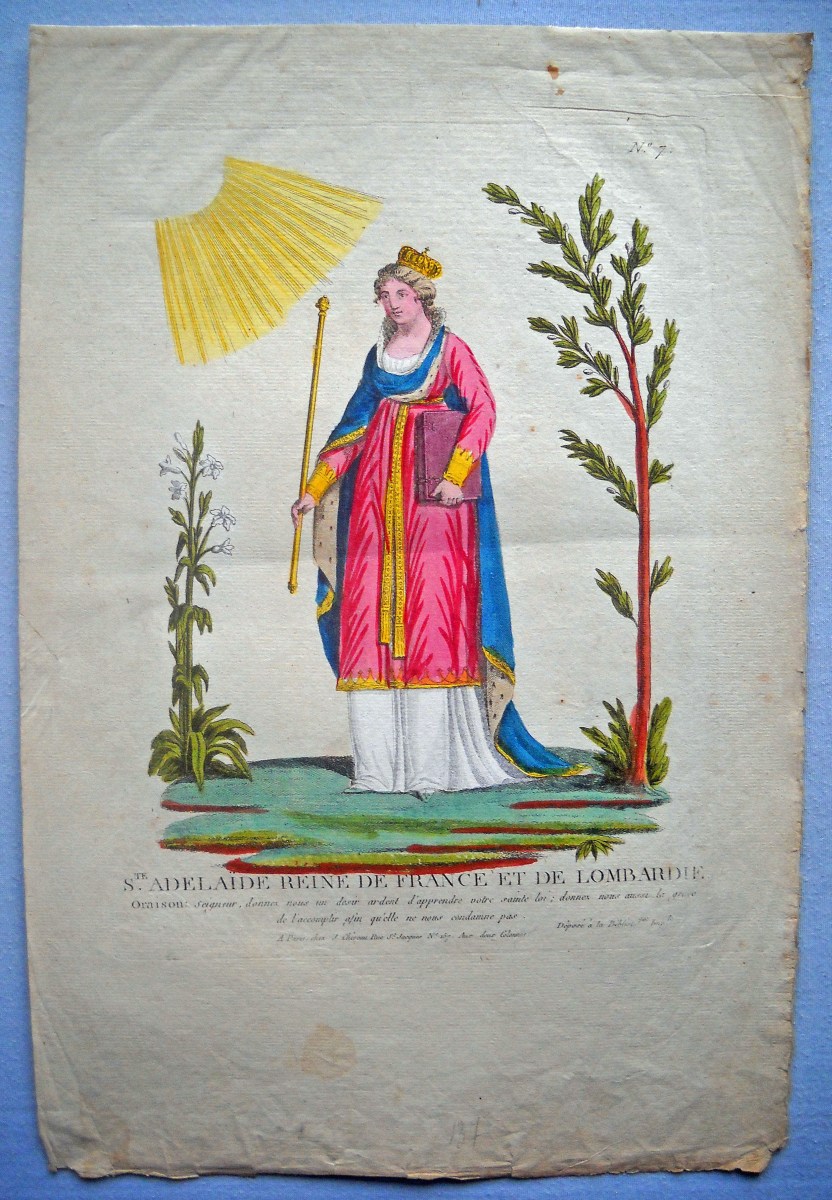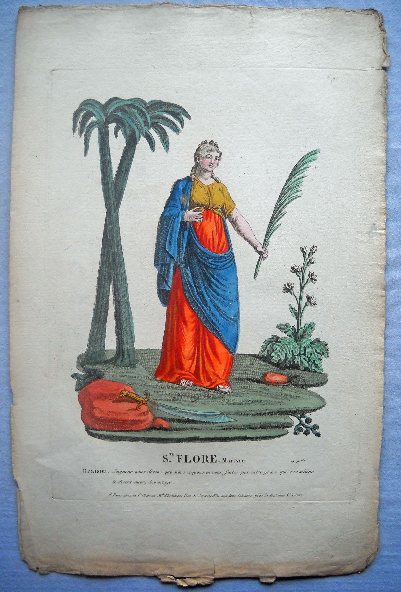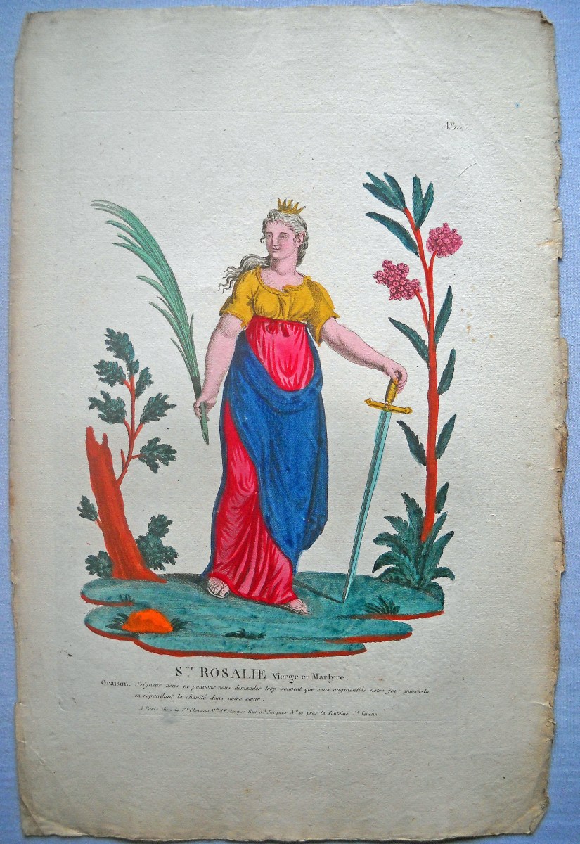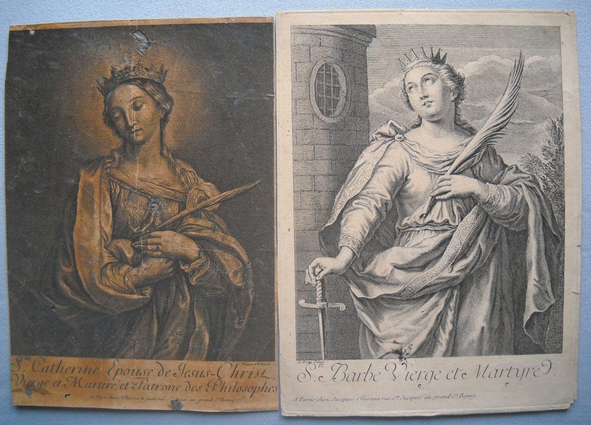 18 estampes gravées en taille-douce sur papier vergé, en majorité rehaussées de coloris d'époque, env. 42 x 27 cm et autres format, dont: L'Annonciation ; le Quatrième mystère le portement de la Croix ; planche à compartiments (2x2) de saintetés ; Ste Dorotée ; St Philippe ; St François d'Assise ; St George ; Ste Geneviève patrone de Paris ; Ste Rosalie ; Ste Euphrasie ; Ste Flore ; Ste Suzanne ; St René évêque ; St Julien ; Le Saint Suaire ; Ste Adélaïde reine de France et de Lombardie ; Ste Barbe ; Ste Catherine (en l'état).