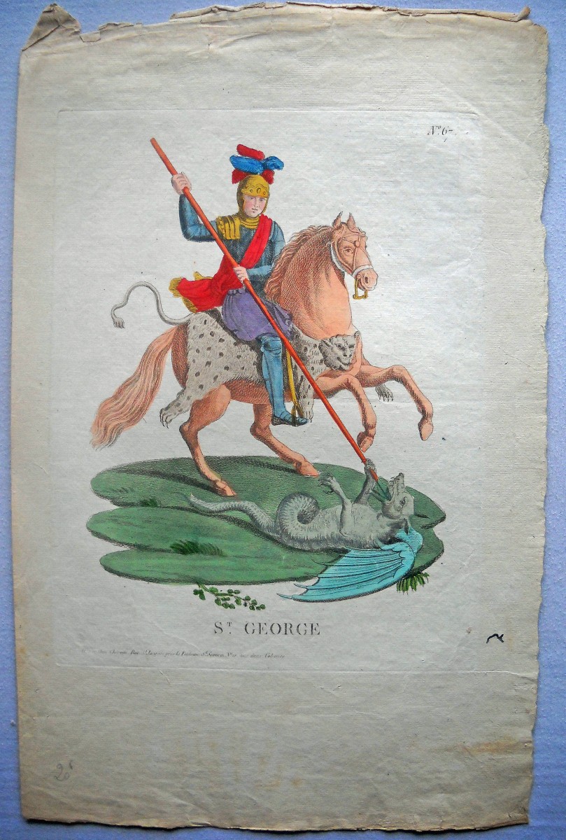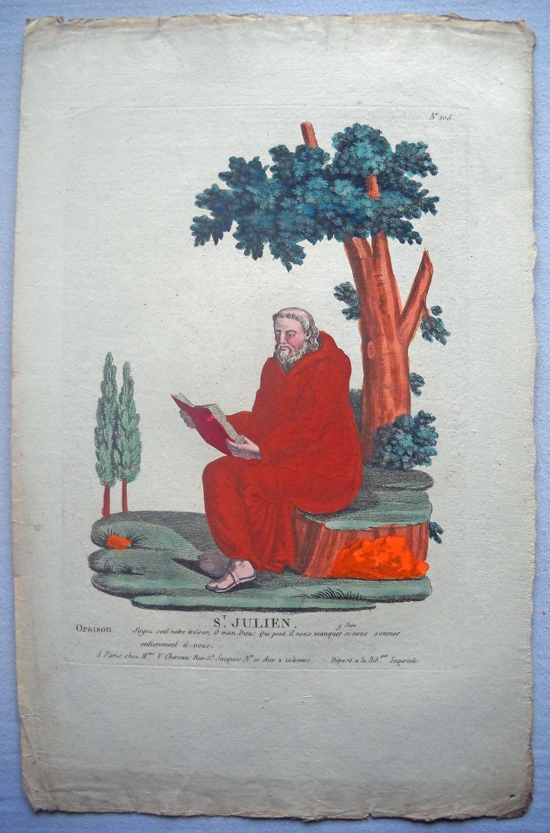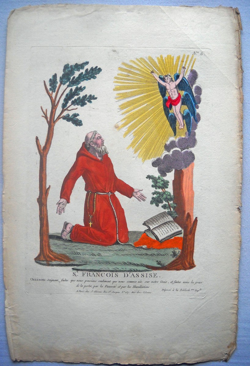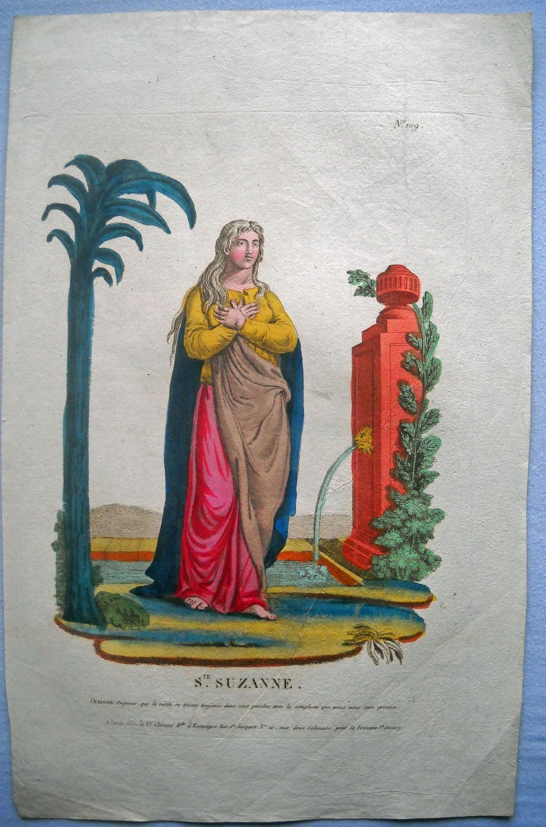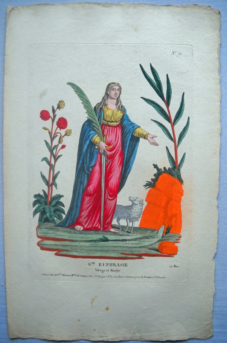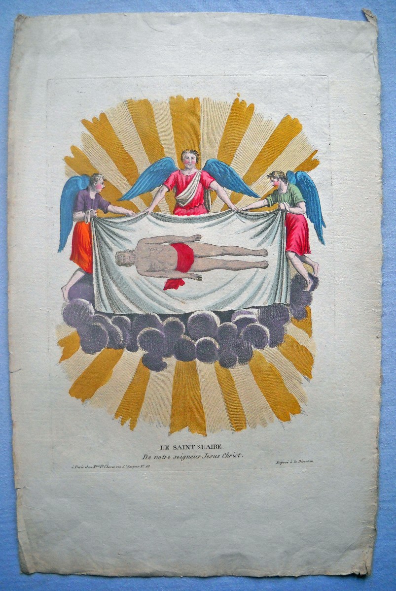 18 estampes gravées en taille-douce sur papier vergé, en majorité rehaussées de coloris d'époque, env. 42 x 27 cm et autres format, dont: L'Annonciation ; le Quatrième mystère le portement de la Croix ; planche à compartiments (2x2) de saintetés ; Ste Dorotée ; St Philippe ; St François d'Assise ; St George ; Ste Geneviève patrone de Paris ; Ste Rosalie ; Ste Euphrasie ; Ste Flore ; Ste Suzanne ; St René évêque ; St Julien ; Le Saint Suaire ; Ste Adélaïde reine de France et de Lombardie ; Ste Barbe ; Ste Catherine (en l'état).