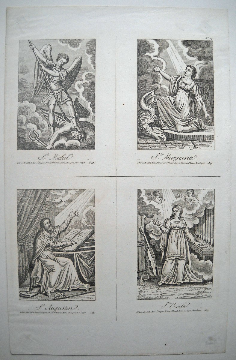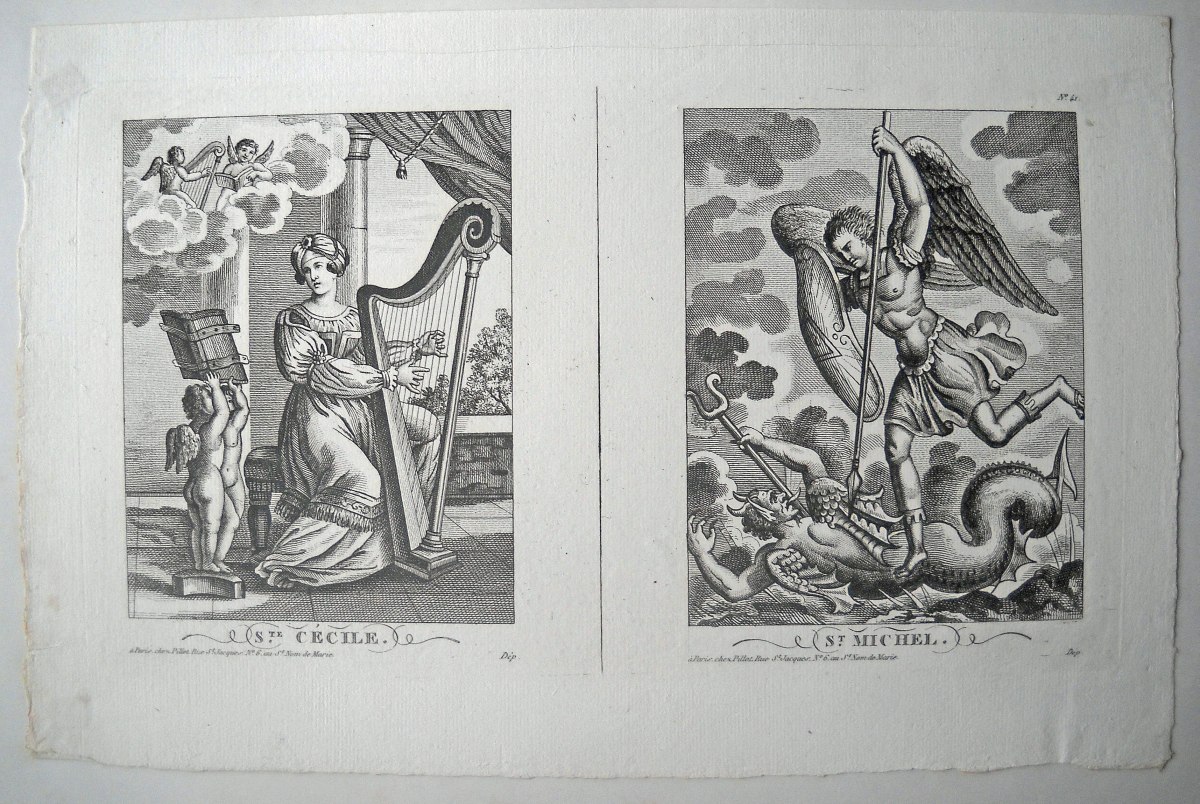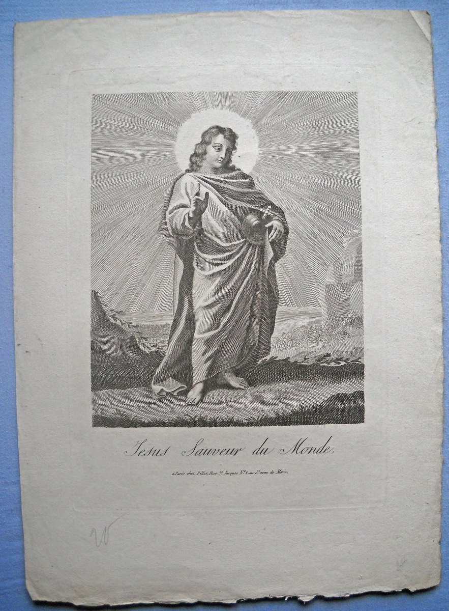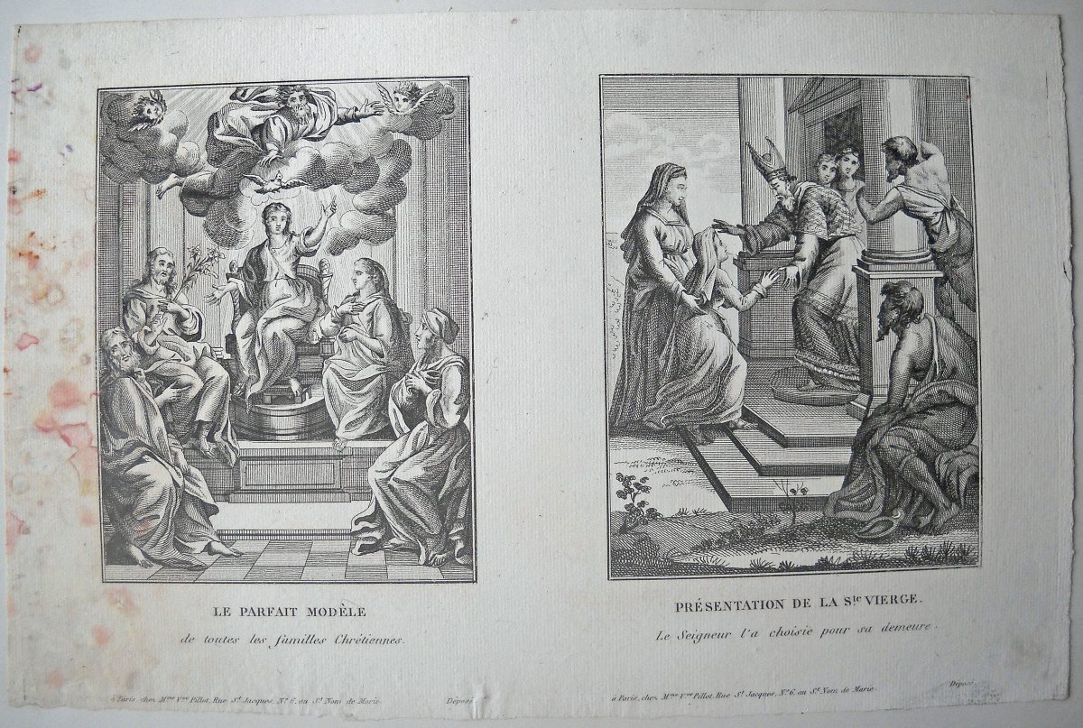 15 estampes gravées en taille-douce, sur papier vergé ou papier simple, dont 2 p. rehaussées au coloris d'époque (XVIIIe siècle), formats divers, la plupart contrecollées sur papier épais, dont: 12 planches à compartiments de saintetés, maximes et scènes bibliques dont une portant mention manuscrite et signature de Pillot: Je déclare le tirage conforme à la présente, Paris, ce 30 mars 1824 ; Le Martire de St Laurent d'après Eustache Lesueur, 42,5 x 30 cm ; Immaculée conception, 36,5 x 28 cm ; Jesus sauveur du Monde, 41,5 x 29 cm.