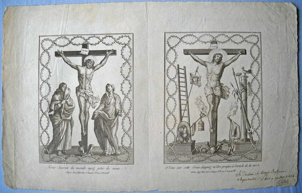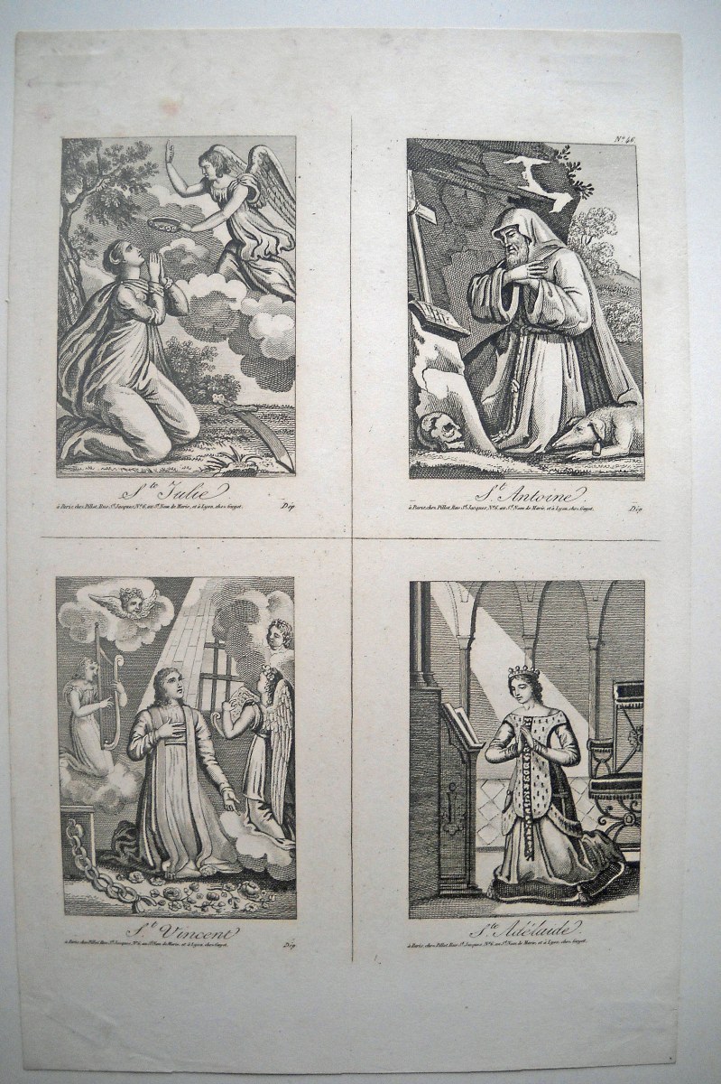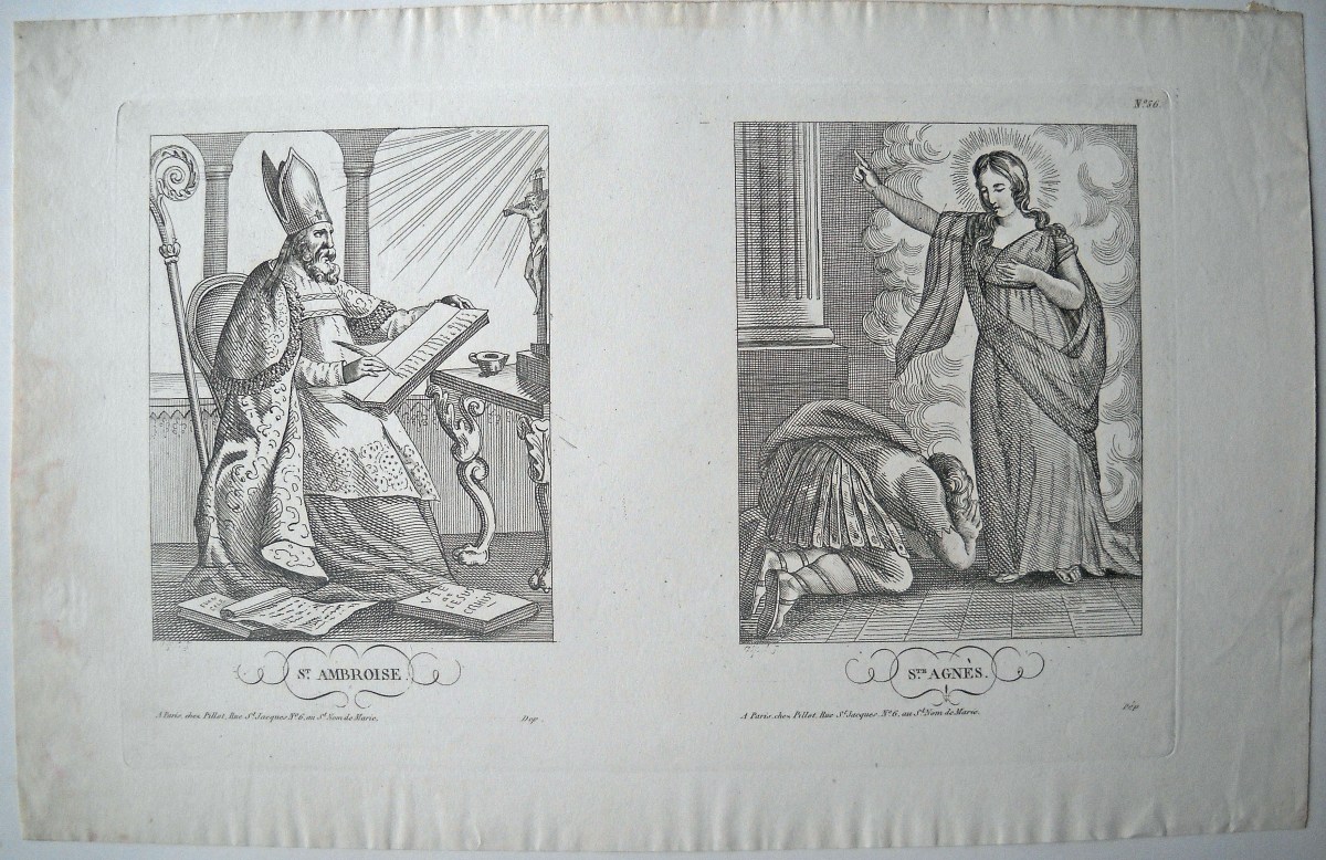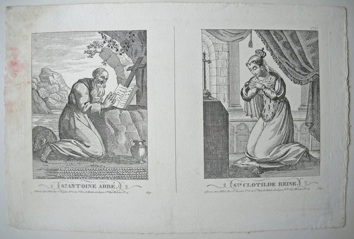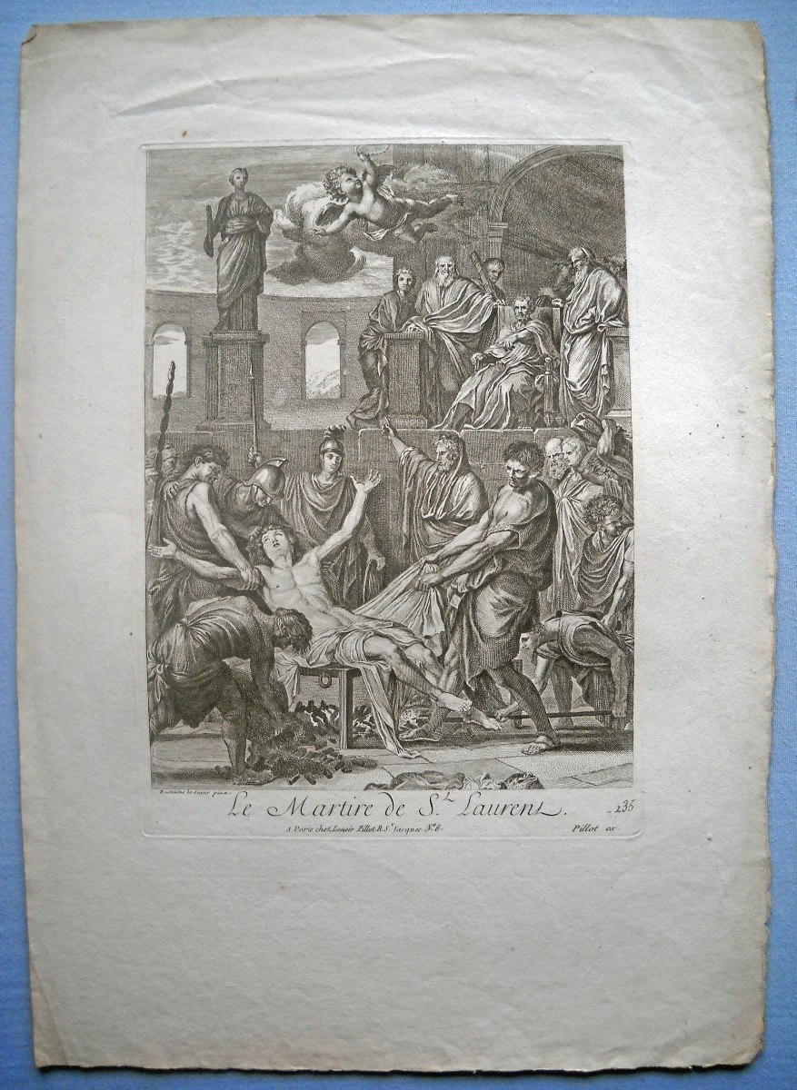 15 estampes gravées en taille-douce, sur papier vergé ou papier simple, dont 2 p. rehaussées au coloris d'époque (XVIIIe siècle), formats divers, la plupart contrecollées sur papier épais, dont: 12 planches à compartiments de saintetés, maximes et scènes bibliques dont une portant mention manuscrite et signature de Pillot: Je déclare le tirage conforme à la présente, Paris, ce 30 mars 1824 ; Le Martire de St Laurent d'après Eustache Lesueur, 42,5 x 30 cm ; Immaculée conception, 36,5 x 28 cm ; Jesus sauveur du Monde, 41,5 x 29 cm.