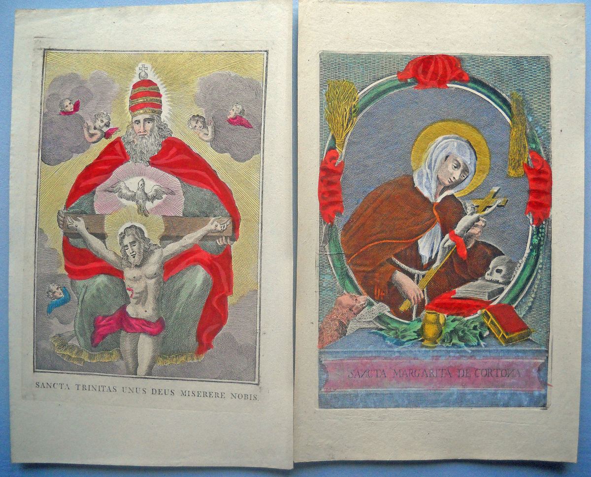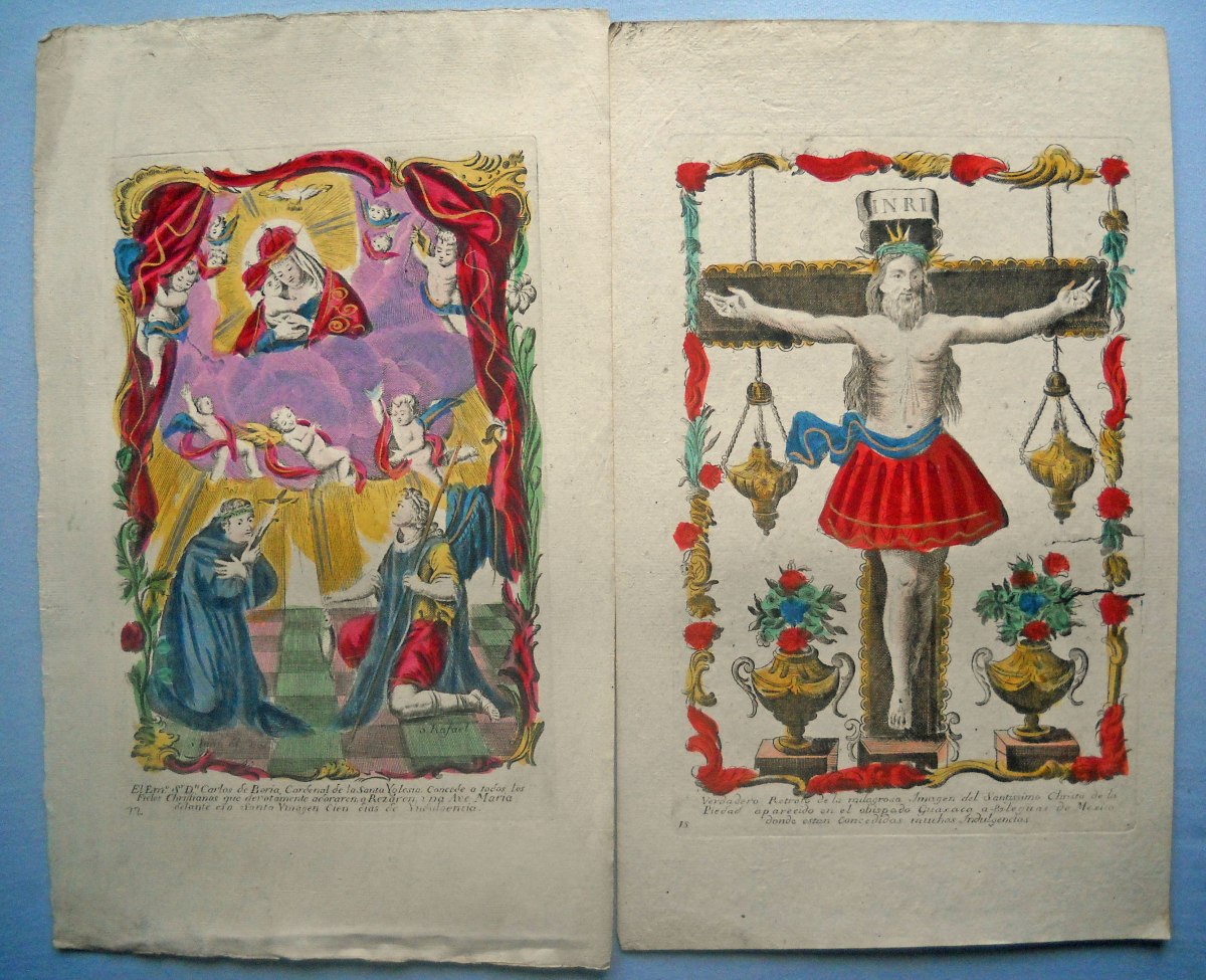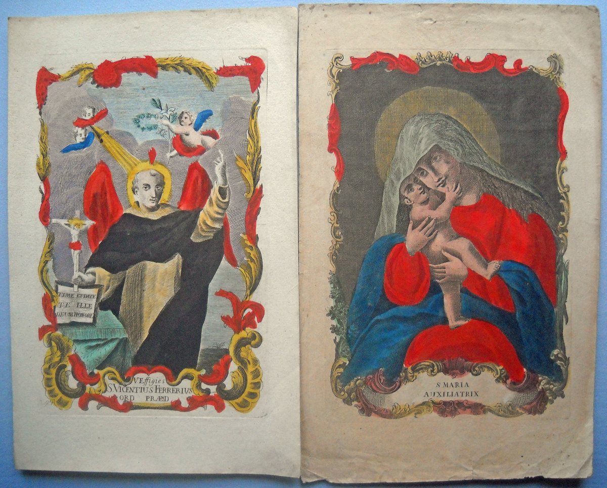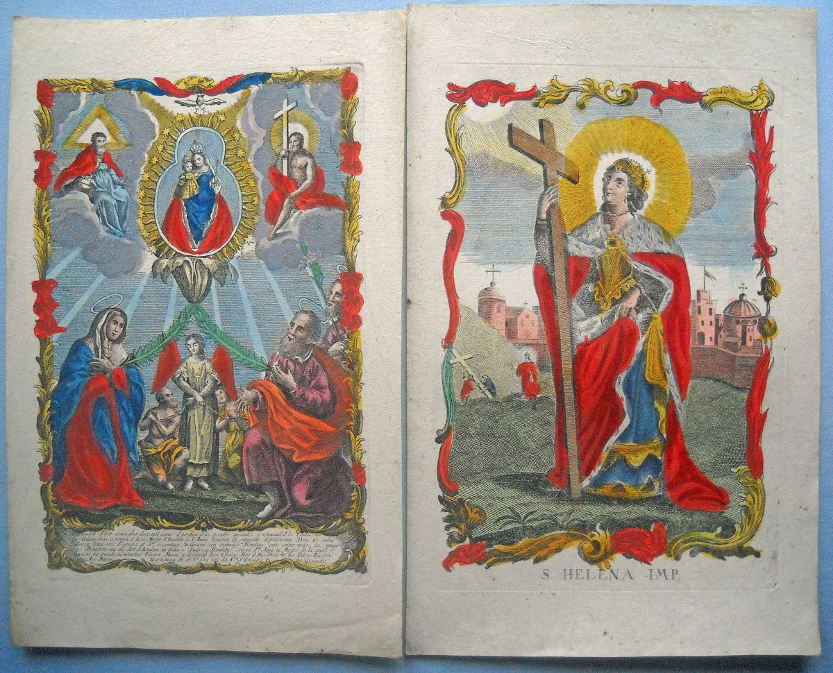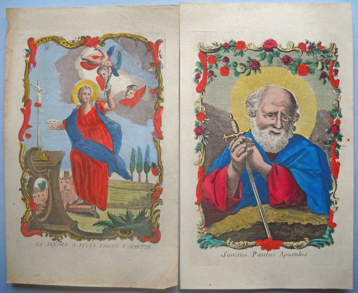 Rare et exceptionnelle réunion de + de 55 estampes religieuses gravées en taille-douce sur papier vergé, toutes rehaussées de coloris d'époque et légendées en italien, allemand, espagnol, français, latin ou cyrillique, en majorité 37/40 cm x 24/25 cm, dont: Assumpta est Maria in Coelum d'après Giovanni Battista Piazzetta par Johann Georg Gutwein ; S. Michaël ; Vera effigie del S.S. ecce Homi di Calvaruso ; S. Ioseph ; Sanctus Wendelinus ; Nativitas domini nostri Jesu Christi ; Santa Margarita de Cortona ; S. Helena Imp. ; La senora S. Lucia Virgen y martyr ; Sanctus Paulus Apostolus ; S. Lorenzo martyr ; Santa librada virgen y martir ; La Senora Virgen de la Vera Cruz ; San Narcisso ; L'immaculée conception de la Vierge ; etc.