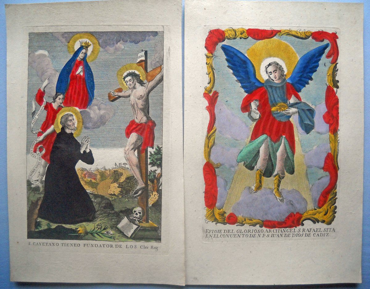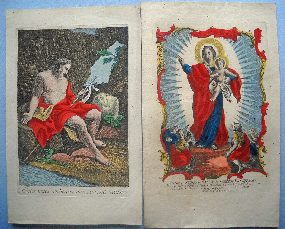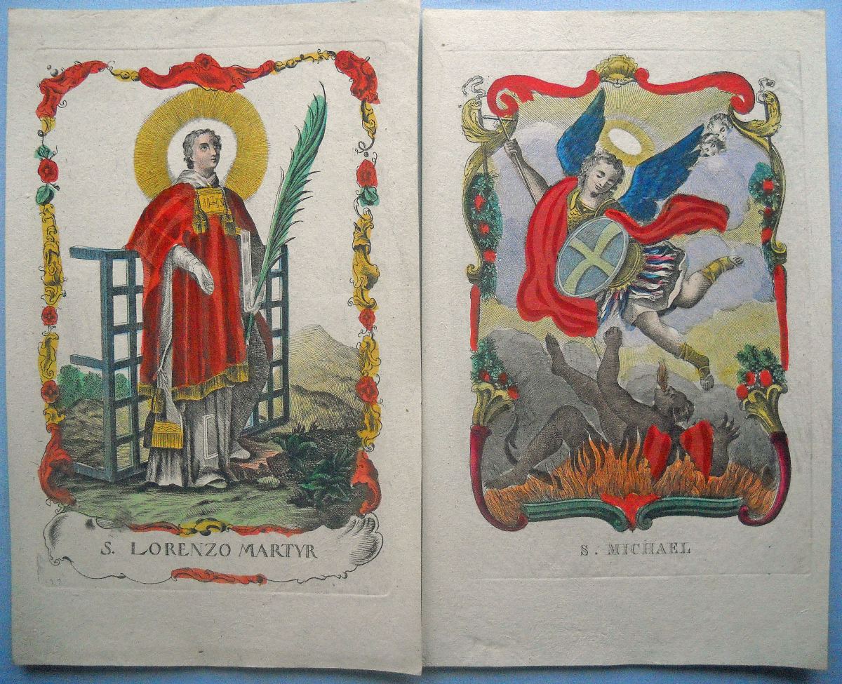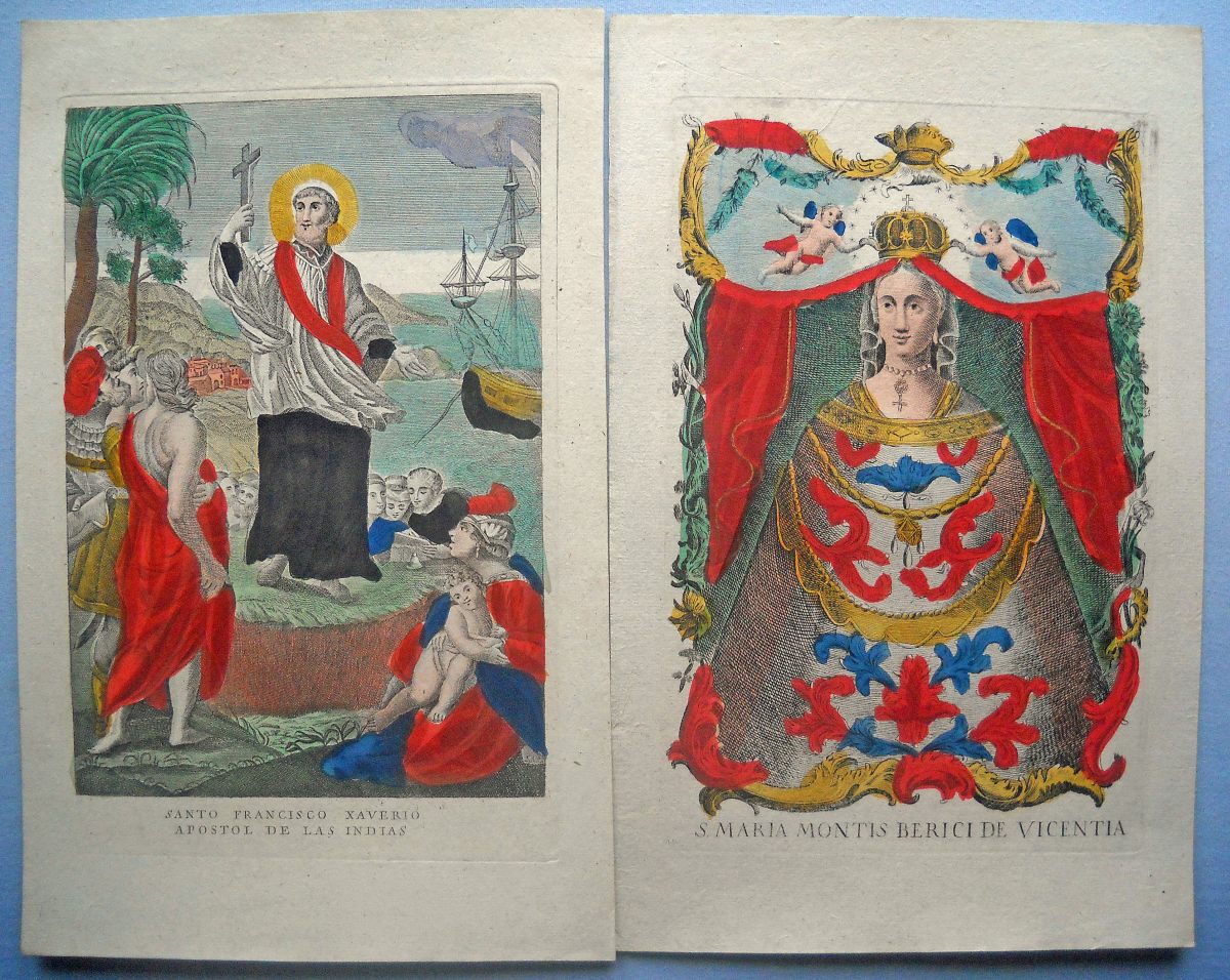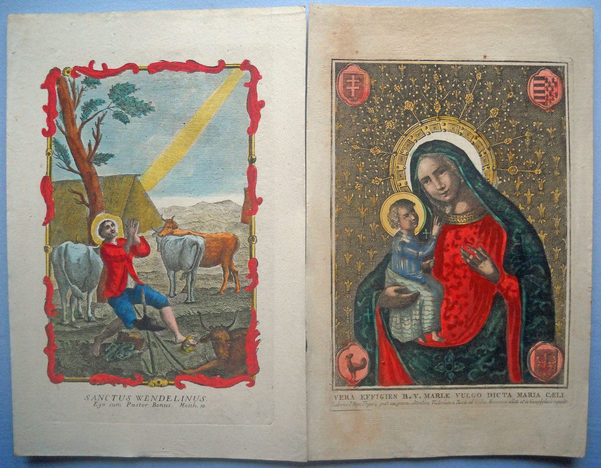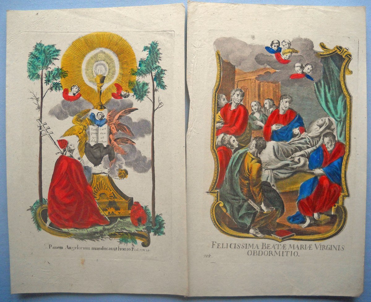 Rare et exceptionnelle réunion de + de 55 estampes religieuses gravées en taille-douce sur papier vergé, toutes rehaussées de coloris d'époque et légendées en italien, allemand, espagnol, français, latin ou cyrillique, en majorité 37/40 cm x 24/25 cm, dont: Assumpta est Maria in Coelum d'après Giovanni Battista Piazzetta par Johann Georg Gutwein ; S. Michaël ; Vera effigie del S.S. ecce Homi di Calvaruso ; S. Ioseph ; Sanctus Wendelinus ; Nativitas domini nostri Jesu Christi ; Santa Margarita de Cortona ; S. Helena Imp. ; La senora S. Lucia Virgen y martyr ; Sanctus Paulus Apostolus ; S. Lorenzo martyr ; Santa librada virgen y martir ; La Senora Virgen de la Vera Cruz ; San Narcisso ; L'immaculée conception de la Vierge ; etc.