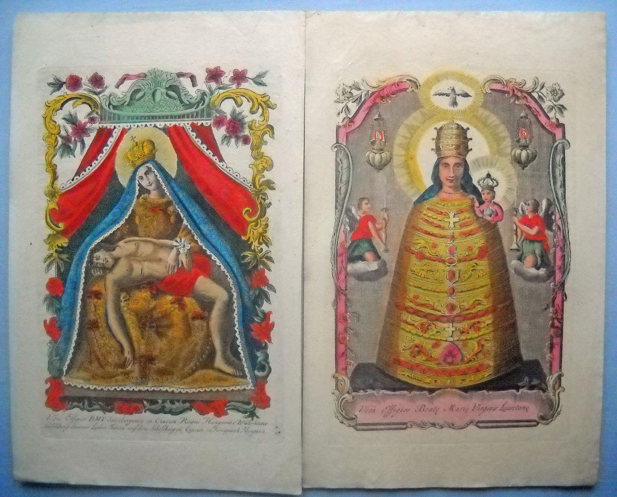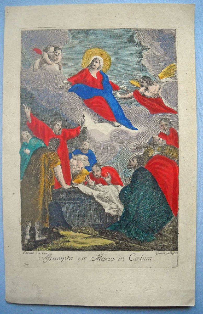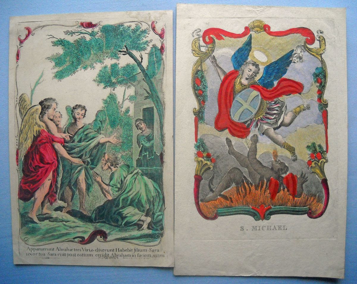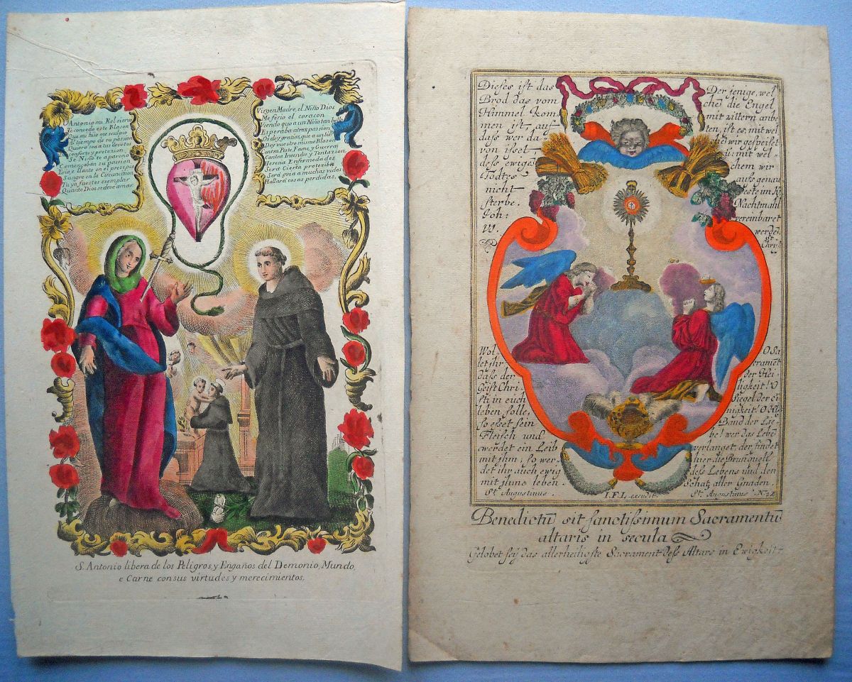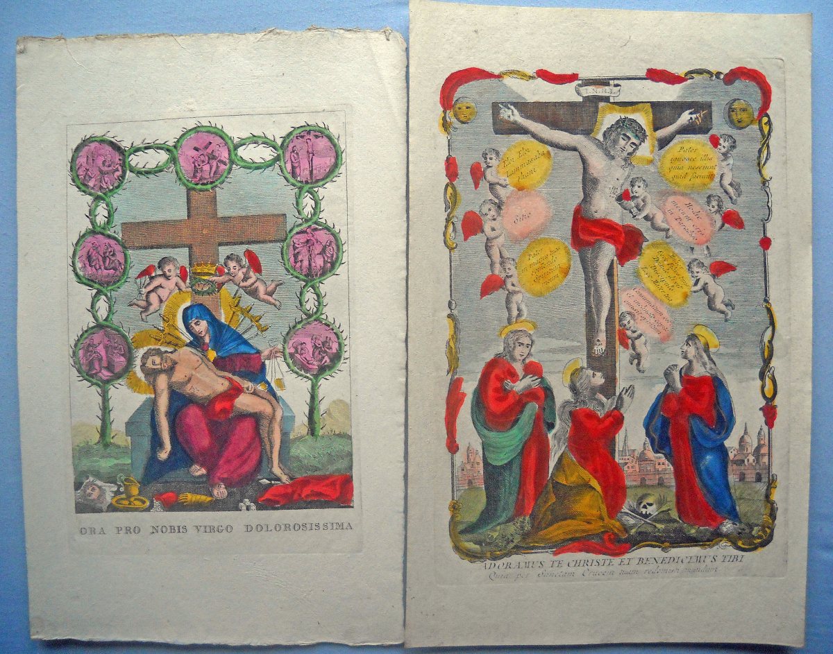 Rare et exceptionnelle réunion de + de 55 estampes religieuses gravées en taille-douce sur papier vergé, toutes rehaussées de coloris d'époque et légendées en italien, allemand, espagnol, français, latin ou cyrillique, en majorité 37/40 cm x 24/25 cm, dont: Assumpta est Maria in Coelum d'après Giovanni Battista Piazzetta par Johann Georg Gutwein ; S. Michaël ; Vera effigie del S.S. ecce Homi di Calvaruso ; S. Ioseph ; Sanctus Wendelinus ; Nativitas domini nostri Jesu Christi ; Santa Margarita de Cortona ; S. Helena Imp. ; La senora S. Lucia Virgen y martyr ; Sanctus Paulus Apostolus ; S. Lorenzo martyr ; Santa librada virgen y martir ; La Senora Virgen de la Vera Cruz ; San Narcisso ; L'immaculée conception de la Vierge ; etc.