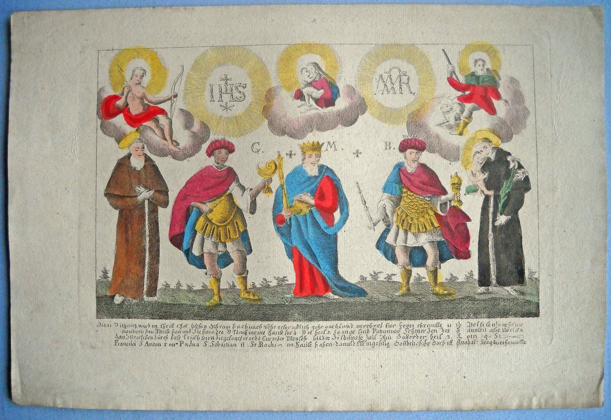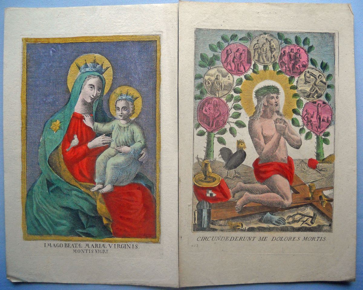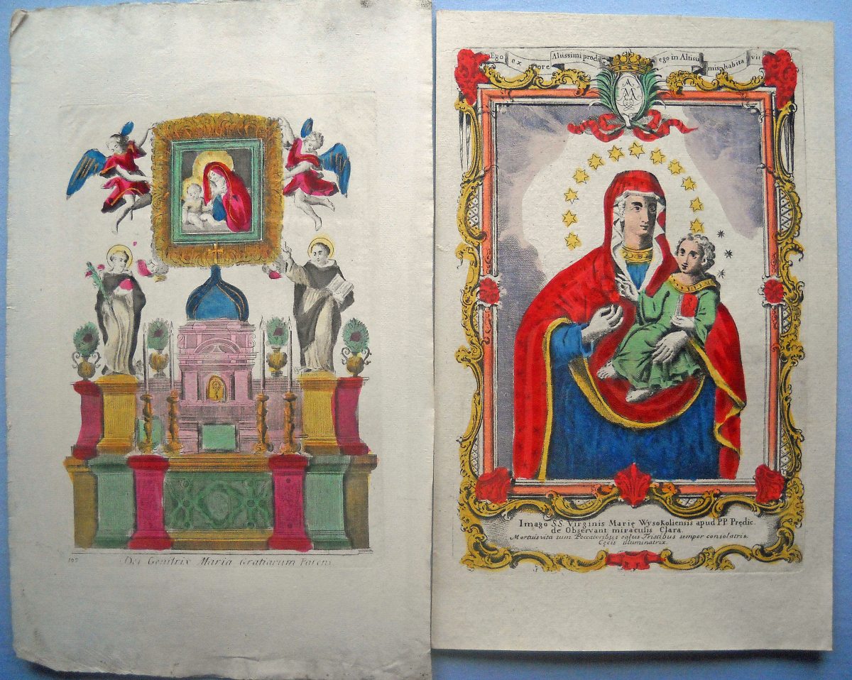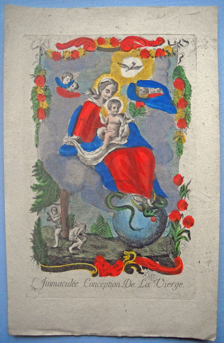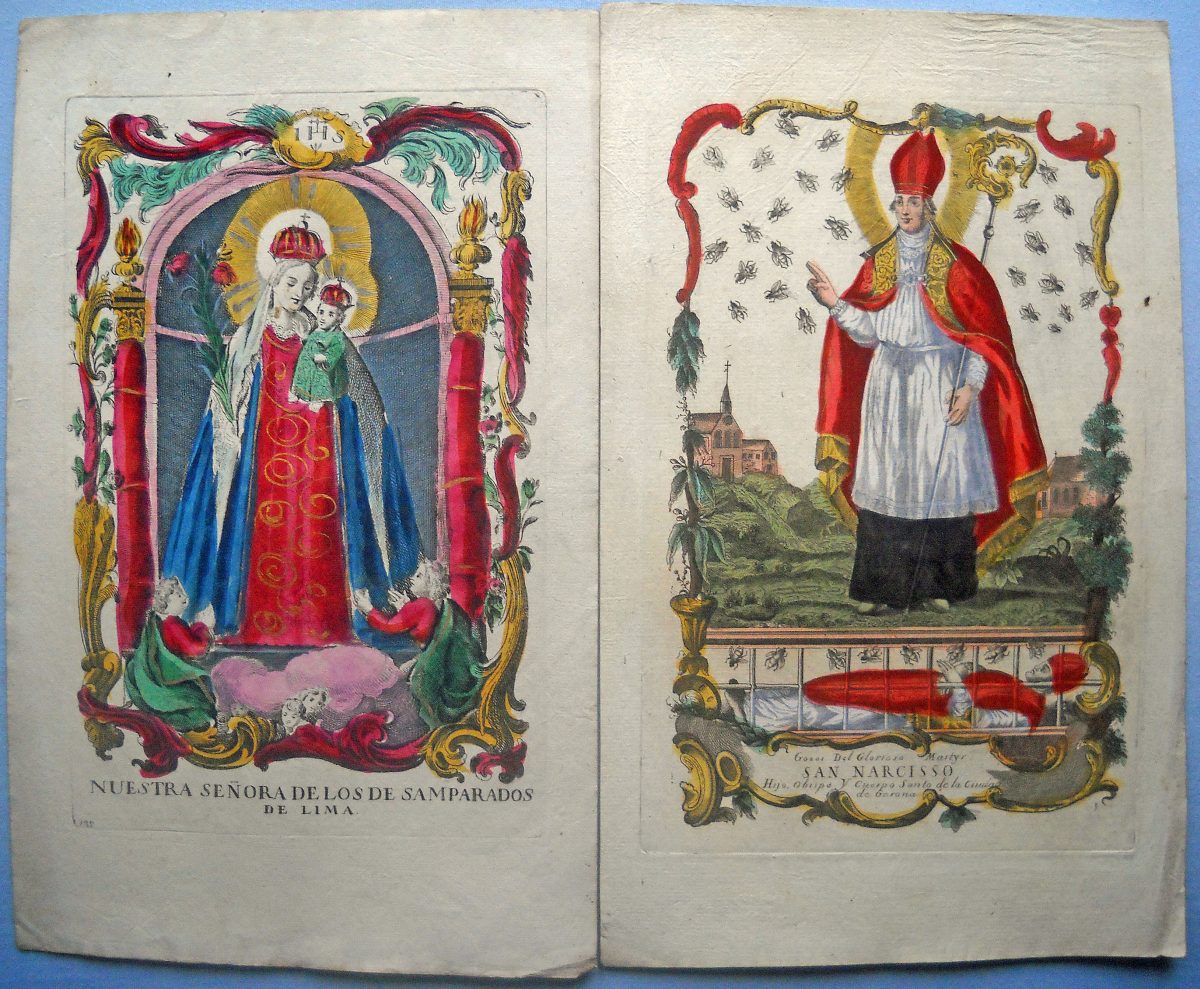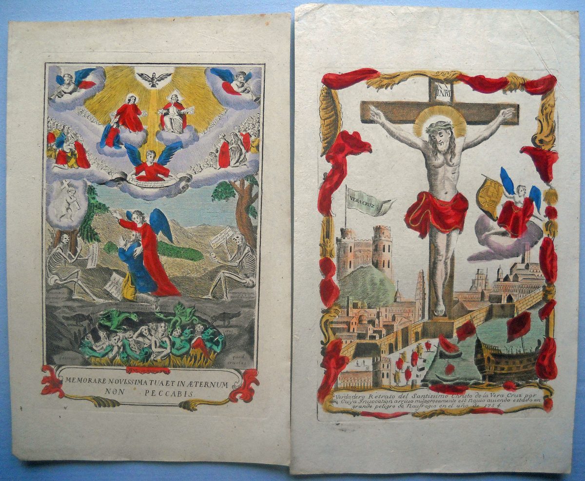 Rare et exceptionnelle réunion de + de 55 estampes religieuses gravées en taille-douce sur papier vergé, toutes rehaussées de coloris d'époque et légendées en italien, allemand, espagnol, français, latin ou cyrillique, en majorité 37/40 cm x 24/25 cm, dont: Assumpta est Maria in Coelum d'après Giovanni Battista Piazzetta par Johann Georg Gutwein ; S. Michaël ; Vera effigie del S.S. ecce Homi di Calvaruso ; S. Ioseph ; Sanctus Wendelinus ; Nativitas domini nostri Jesu Christi ; Santa Margarita de Cortona ; S. Helena Imp. ; La senora S. Lucia Virgen y martyr ; Sanctus Paulus Apostolus ; S. Lorenzo martyr ; Santa librada virgen y martir ; La Senora Virgen de la Vera Cruz ; San Narcisso ; L'immaculée conception de la Vierge ; etc.