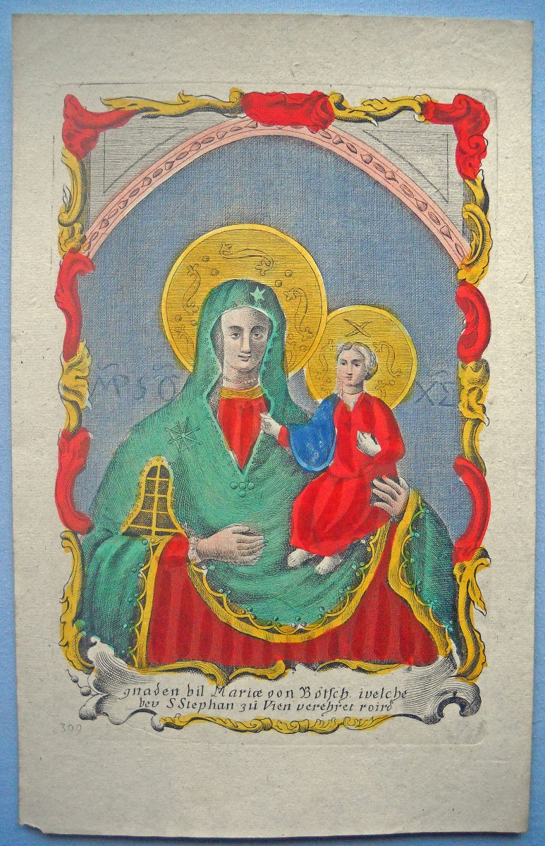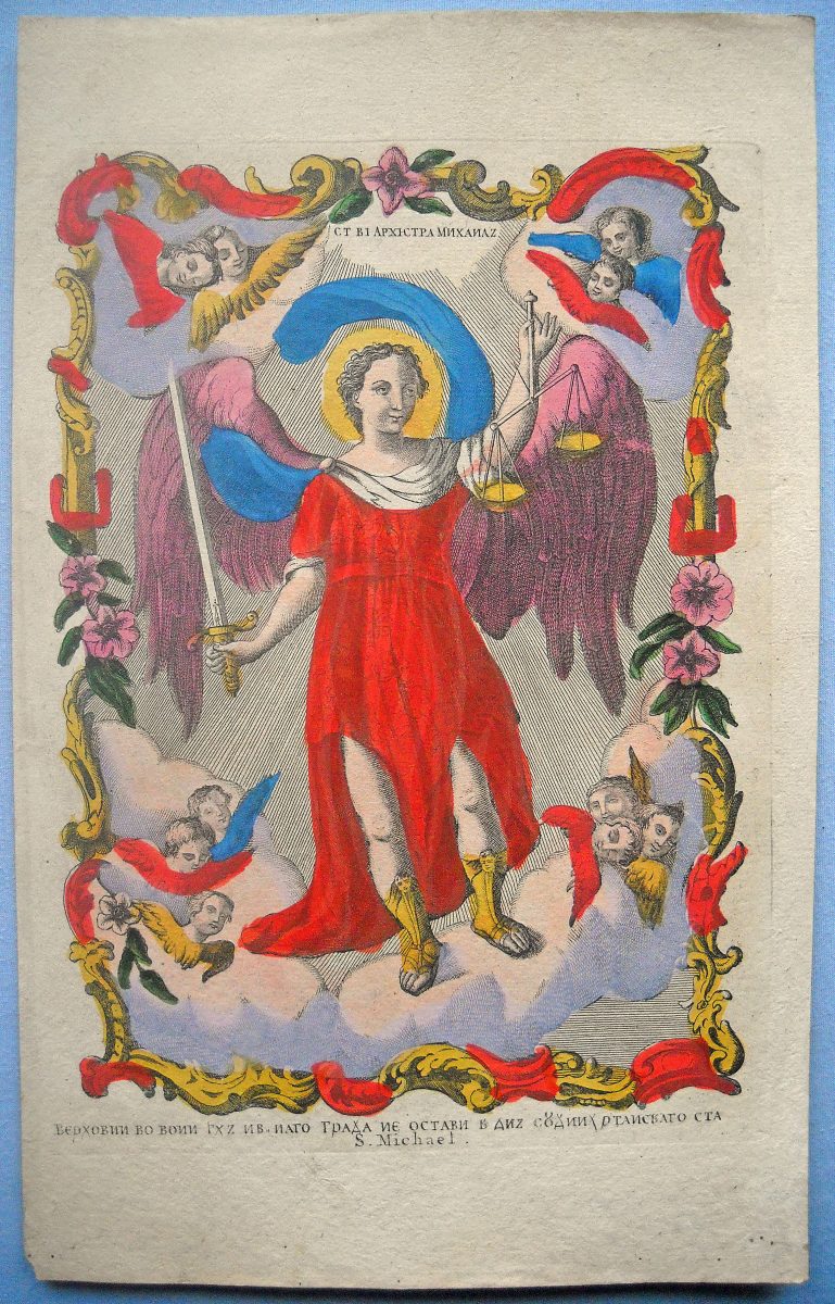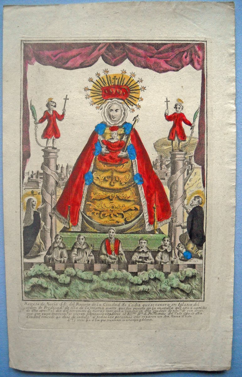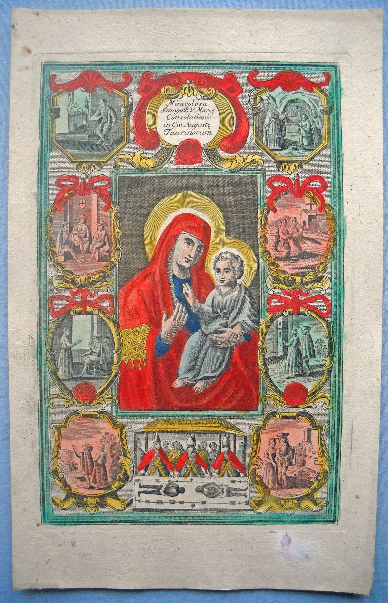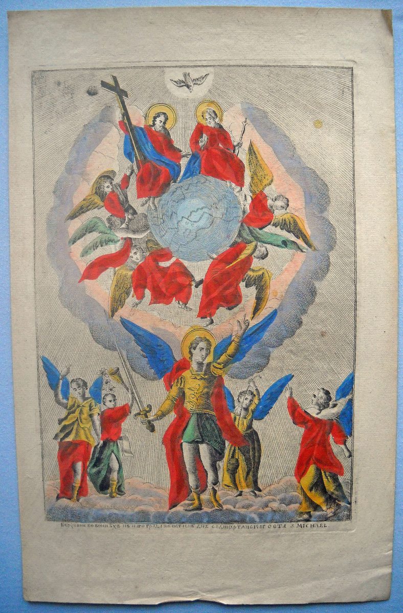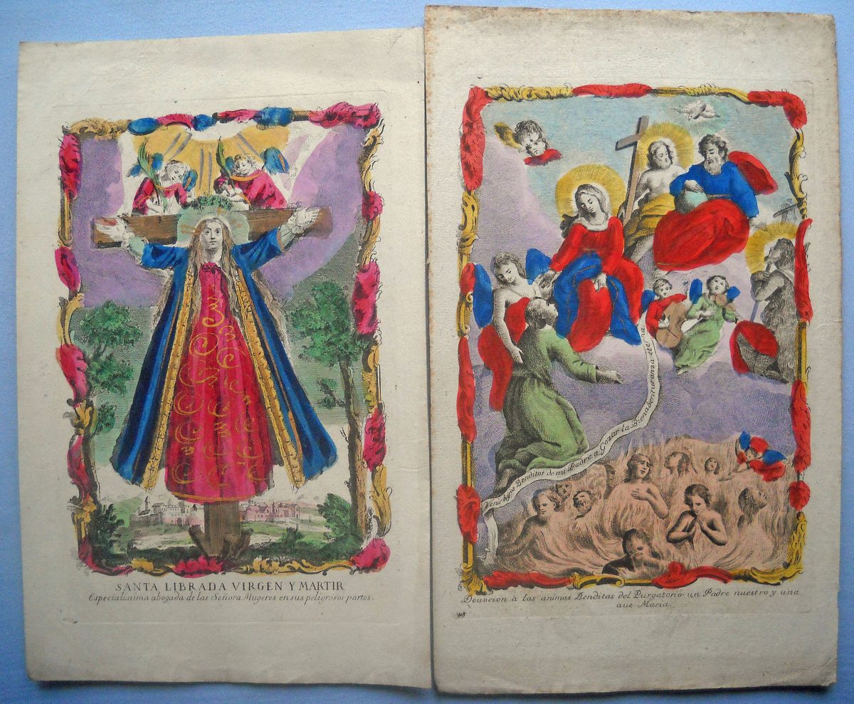 Rare et exceptionnelle réunion de + de 55 estampes religieuses gravées en taille-douce sur papier vergé, toutes rehaussées de coloris d'époque et légendées en italien, allemand, espagnol, français, latin ou cyrillique, en majorité 37/40 cm x 24/25 cm, dont: Assumpta est Maria in Coelum d'après Giovanni Battista Piazzetta par Johann Georg Gutwein ; S. Michaël ; Vera effigie del S.S. ecce Homi di Calvaruso ; S. Ioseph ; Sanctus Wendelinus ; Nativitas domini nostri Jesu Christi ; Santa Margarita de Cortona ; S. Helena Imp. ; La senora S. Lucia Virgen y martyr ; Sanctus Paulus Apostolus ; S. Lorenzo martyr ; Santa librada virgen y martir ; La Senora Virgen de la Vera Cruz ; San Narcisso ; L'immaculée conception de la Vierge ; etc.