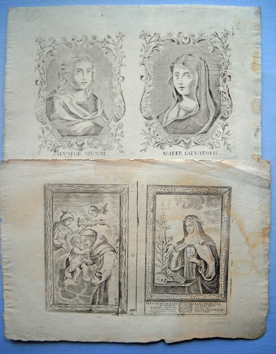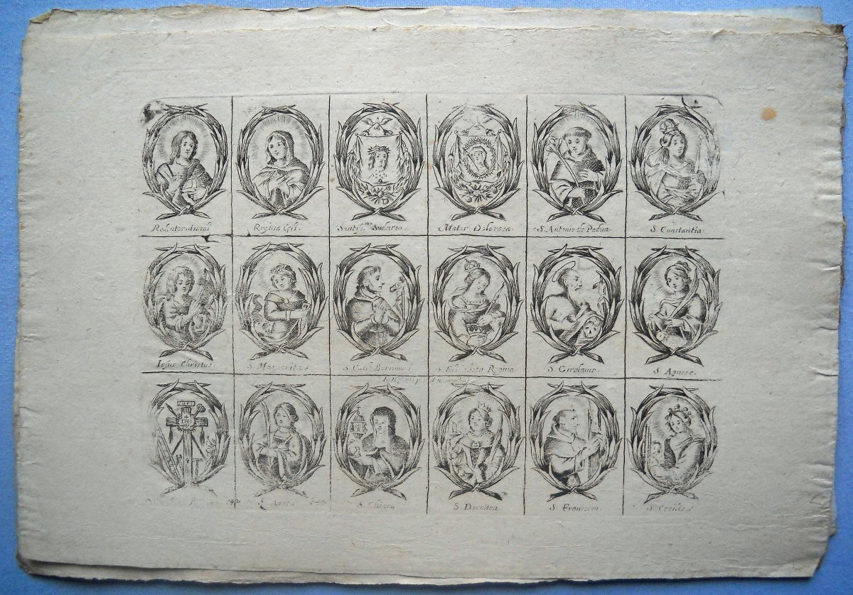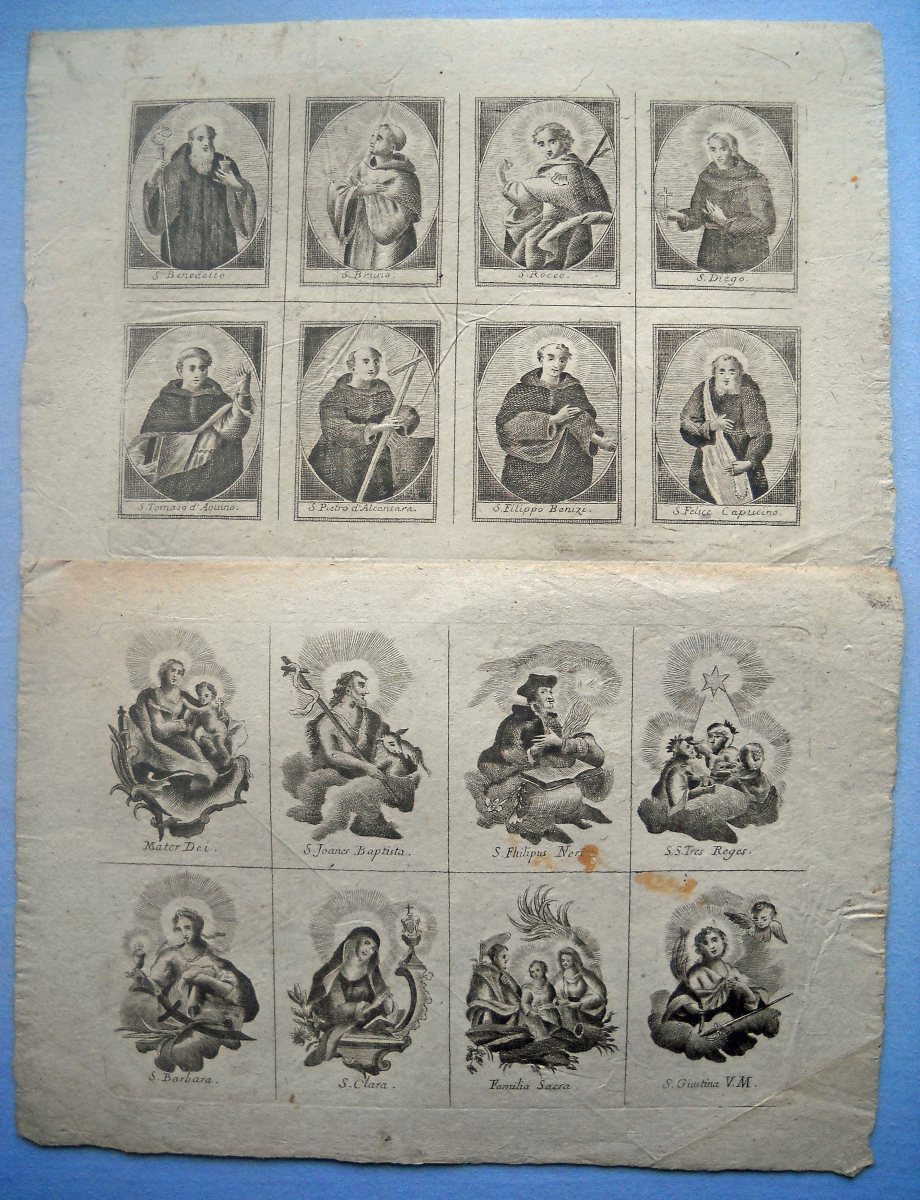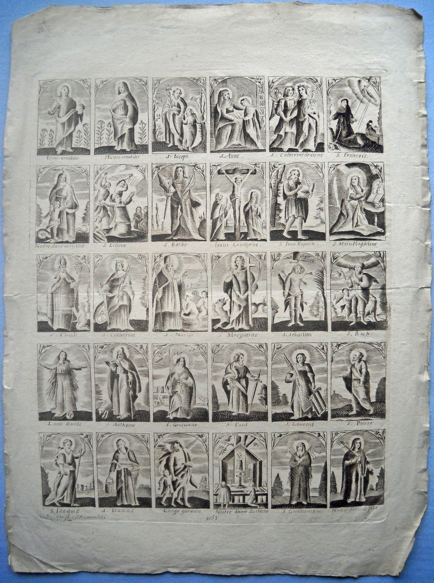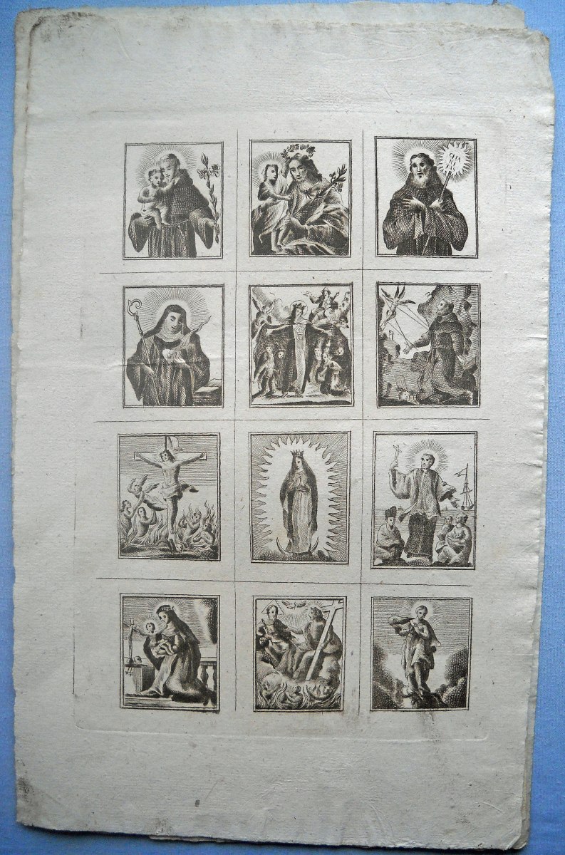 34 planches à compartiments d'images pieuses à découper, gravées en taille-douce sur papier vergé, 32/33 x 22/23 cm et inverse, à représentation de saintetés. Quelques doublons.