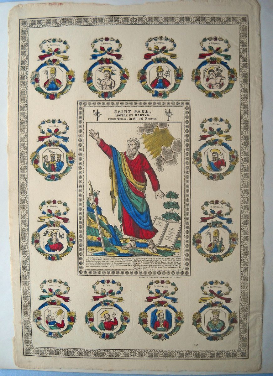 1 épreuve, gravure sur bois coloriée au pochoir, montée sur papier épais: Saint Paul, apôtre et martyr entouré de vignettes de saints, n°247, 64 x 43,5 cm.
