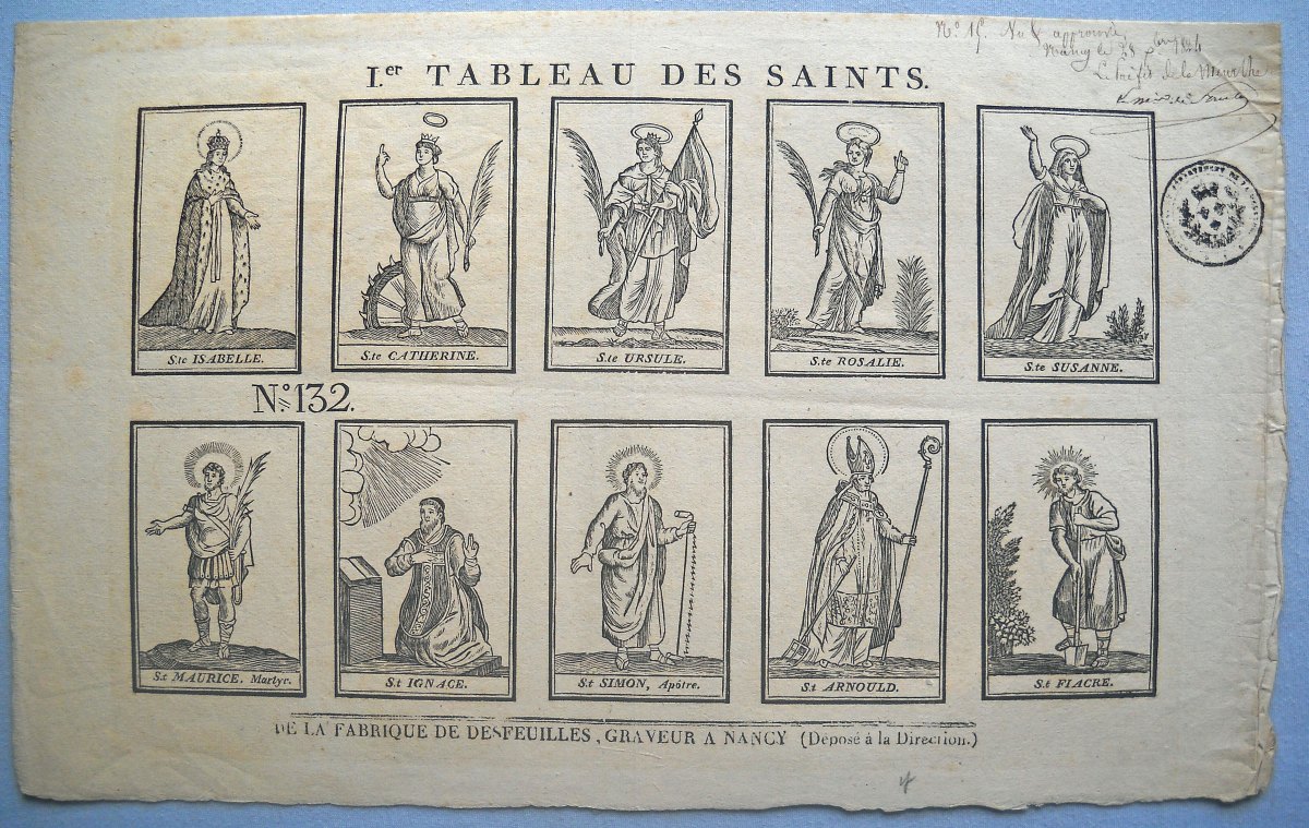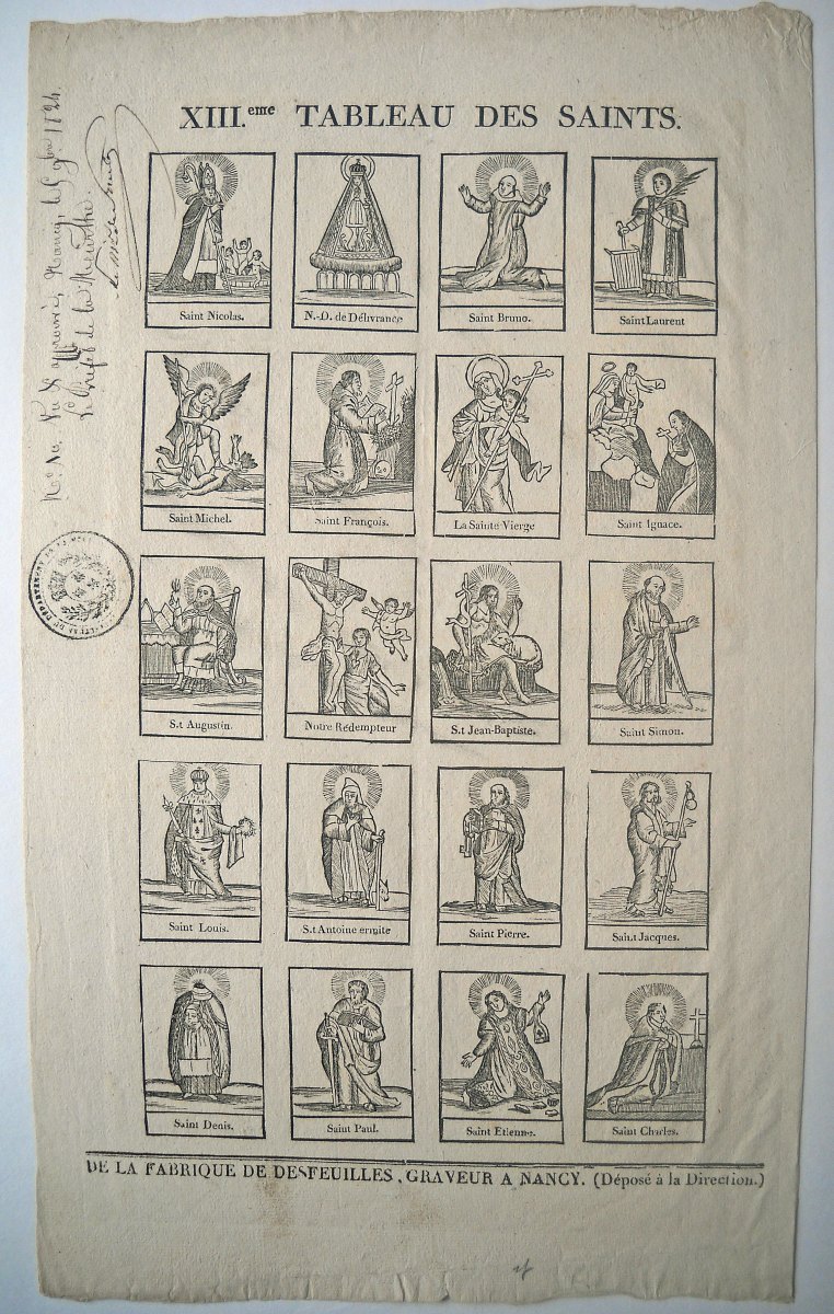 2 planches à compartiments de saintetés (5x2 et 4x5), gravure sur bois, papier vergé, montées sur papier fort, 43 x 26,5 cm et 26,5 x 43 cm: Ier tableau tableau des saints et XIIIe tableau des saints, avec approbation et signature manuscrite du préfet de la Meurthe, le marquis de Foresta, " Nancy le 28 décembre 1824 ".