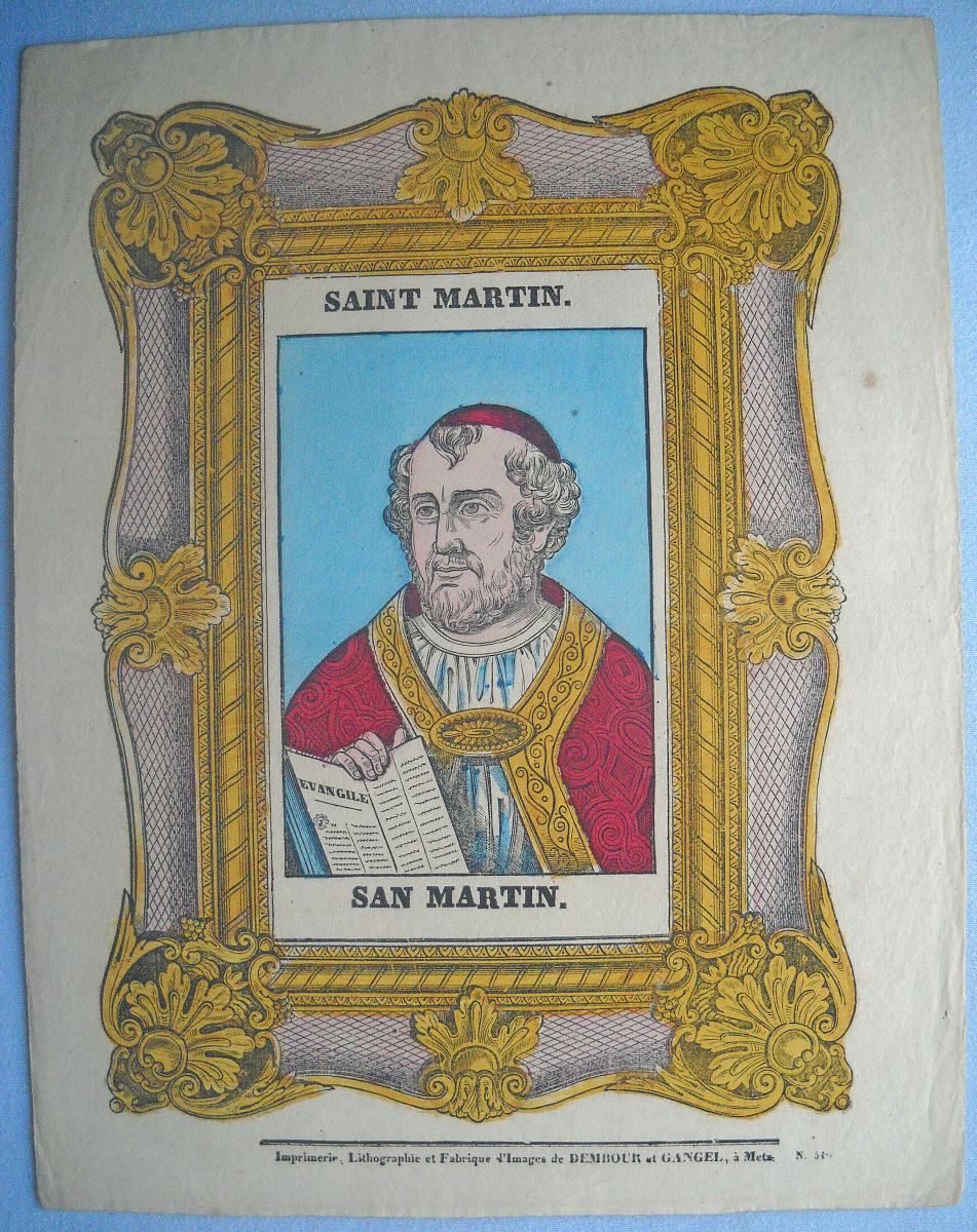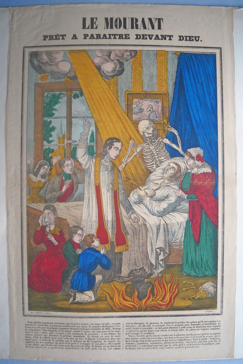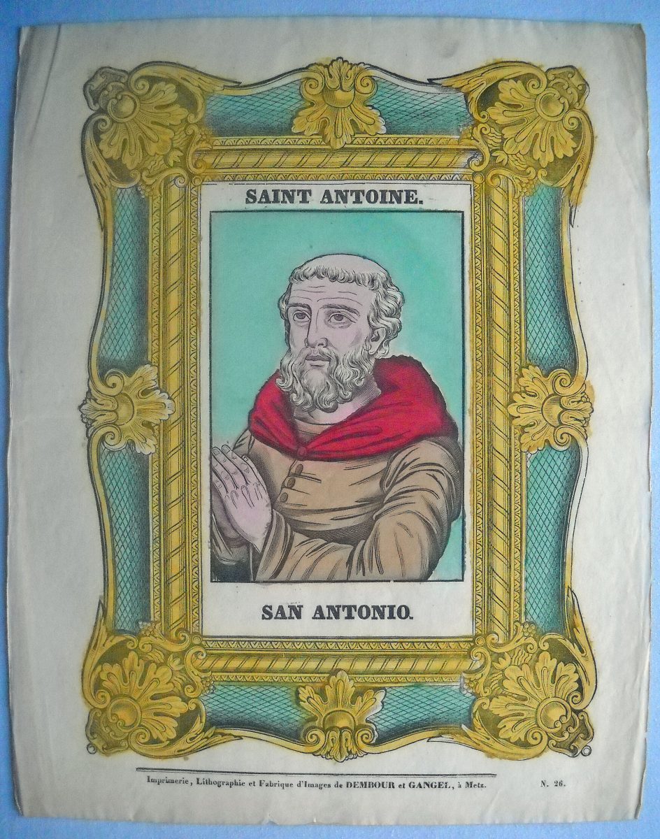 - [Dembour et Gangel] 3 épreuves, gravure sur bois dont 4 coloriées au pochoir, montées sur papier épais: Le mourant prêt à paraître devant Dieu, (petit manque) ; Saint Martin ; Ste Philomène, vierge et martyre 30, (en l'état). Env. 66 x 42 cm ; San Antonio, 41,5 x 33 cm.