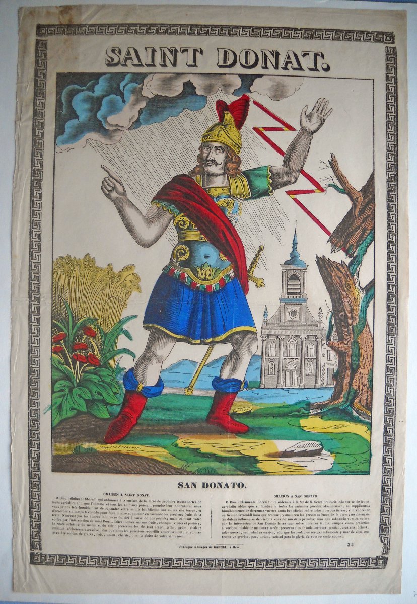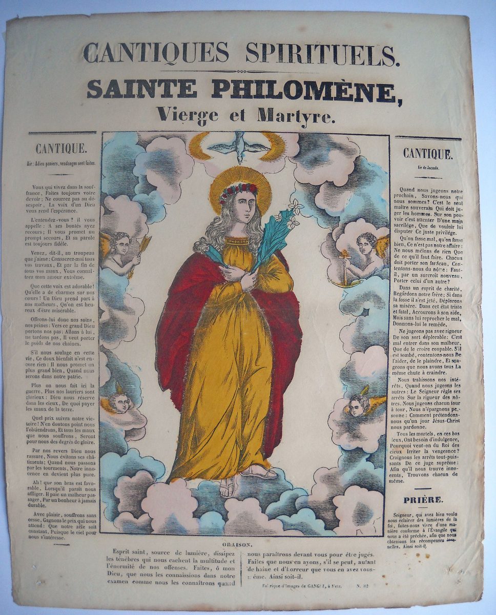 - [Gangel] 2 épreuves, gravure sur bois coloriée au pochoir ou lithographie coloriée, montées sur papier épais: Cantiques spirituels, Sainte Philomène 82 ; Saint Donat 34 (restaurations) ; Env. 63 x 42 cm.