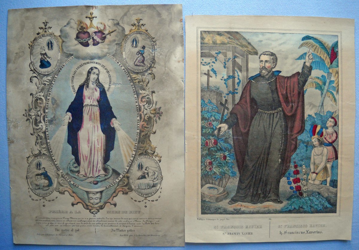 Joint: 5 lithographies éditées par Gangel: Moïse descendit vers le peuple ; De cette manière Aron entrera dans le sanctuaire 129, légendes en hébreu, français et alsacien ; planche d'images à découper ; St Gens ; St François Xavier - 2 planches à compartiments (2x1) de saints, gravées sur bois et éditées par Jean-Jules DELHALT à partir de 1880, 33 x 42,5 cm - 2 planches lithographiées à compartiments de saintetés éditées par Thomas.
