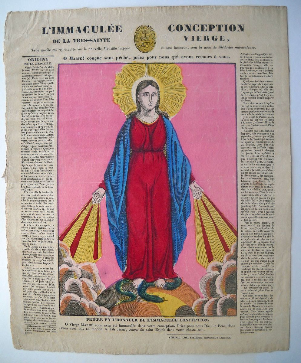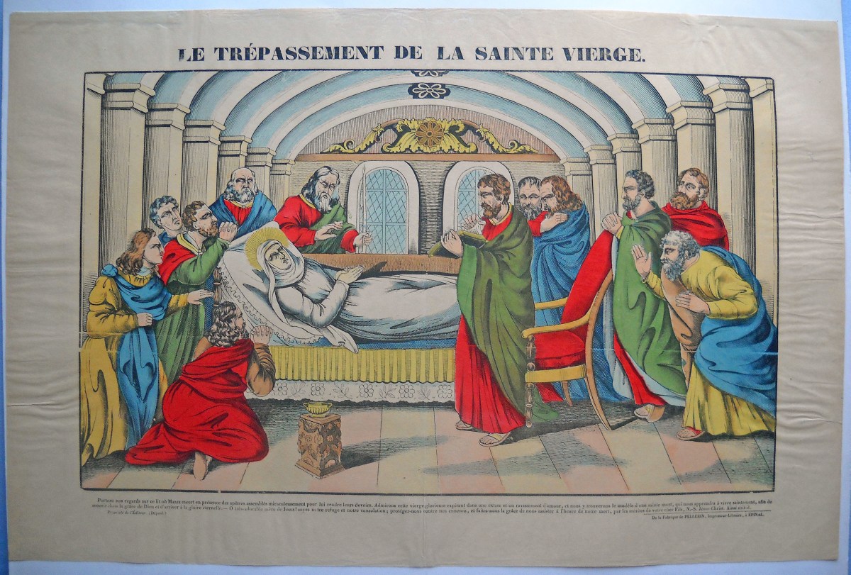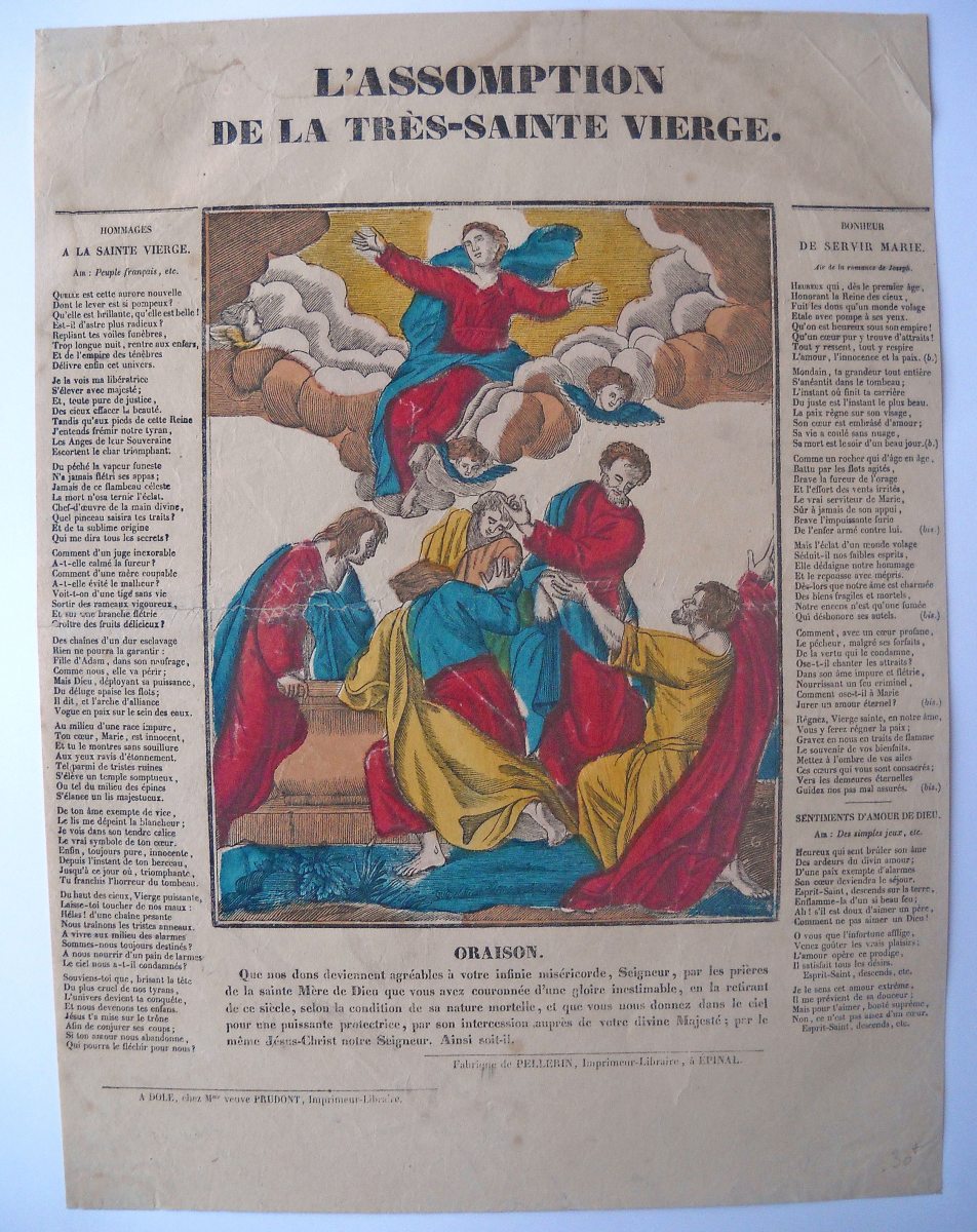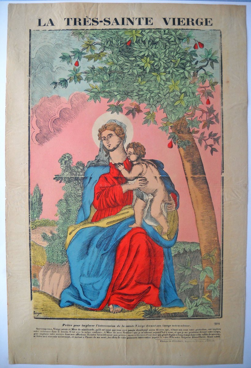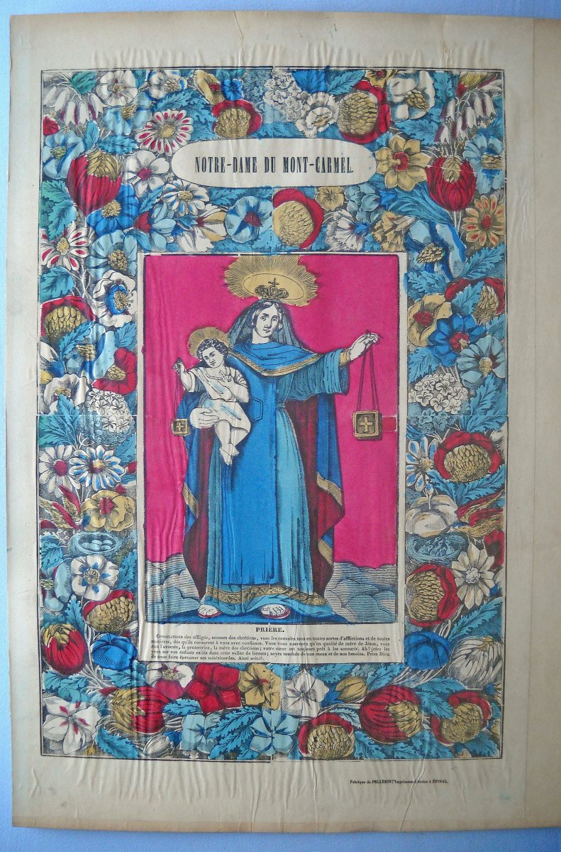 10 épreuves, gravure sur bois coloriée au pochoir, montées sur papier épais: L'immaculée Conception de la très sainte Vierge, 42 x 34cm ; La Très sainte Vierge 204, gravée par Georgin, 63,5 x 42 cm [ca 1837] ; Le couronnement de la sainte Vierge, 63,5 x 41,5 cm ; Le trépassement de la sainte Vierge, 42 x 63,5 cm ; L'assomption de la très sainte Vierge, gravée par Georgin, 40 x 30 cm ; Notre-Dame de Fourvières, 40 x 28,5 cm (2 ex.) ; Notre-Dame du Mont-Carmel, 64 x 49cm ; Notre-Dame de Liesse 169, 63 x 41cm [ca 1852] ; Notre-Dame de délivrance 117, 64 x 41,5 cm [ca 1857].